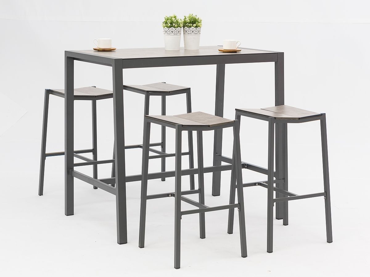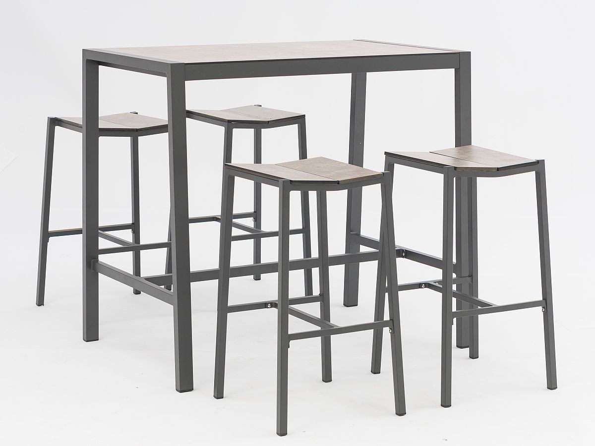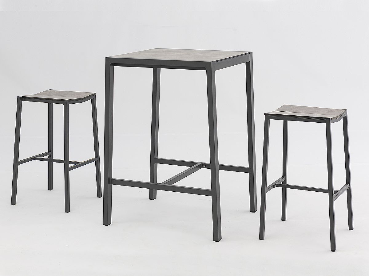 Štýlová barová súprava sa skladá z barového stola a barových stoličiek. Konštrukcia stoličiek a stola je hliníková a je striekaná práškovou antracitovou farbou. Povrch stola ako aj sedacia časť su 8mm HPL v dekore Steingrau. Stôl je dostupný aj v menšej verzii 70 x 80 cm.