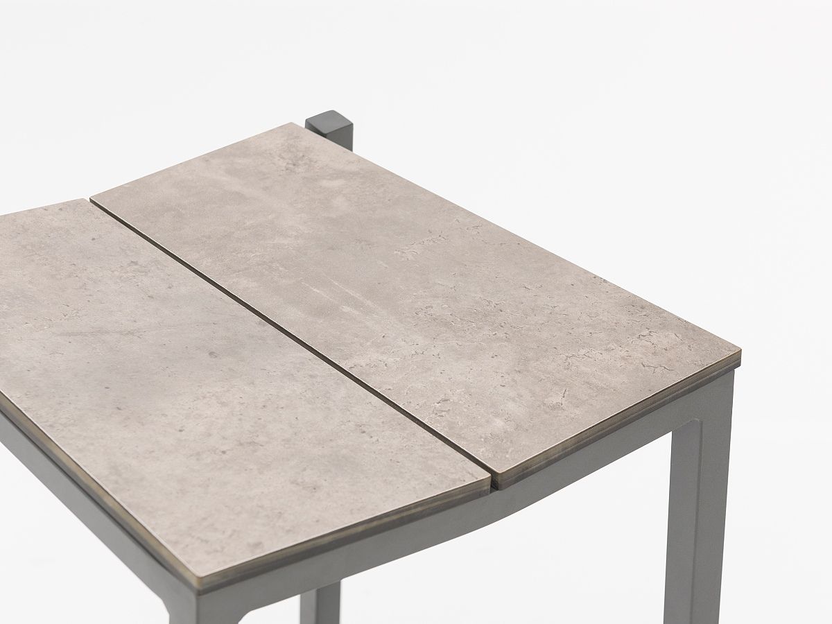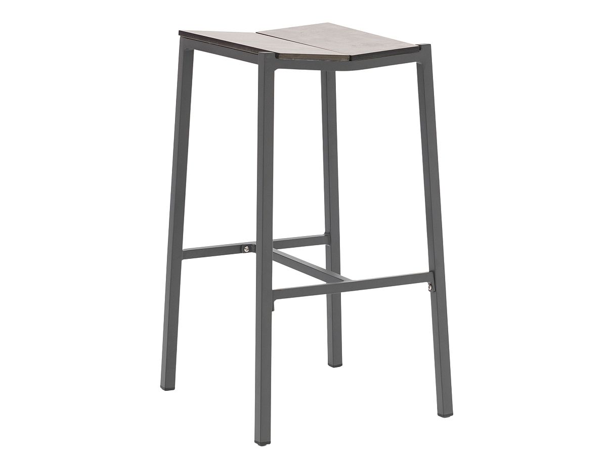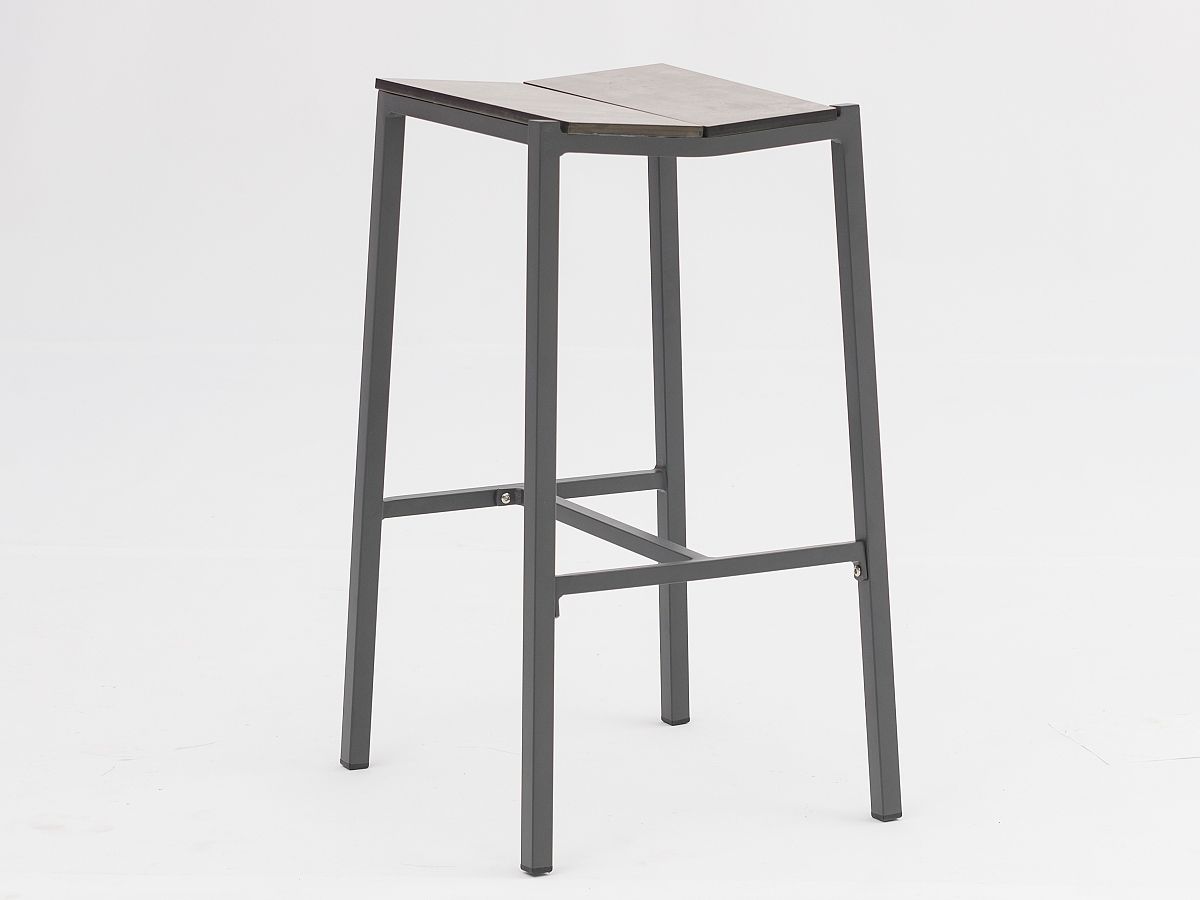 Štýlová barová súprava sa skladá z barového stola a barových stoličiek. Konštrukcia stoličiek a stola je hliníková a je striekaná práškovou antracitovou farbou. Povrch stola ako aj sedacia časť su 8mm HPL v dekore Steingrau. Stôl je dostupný aj v menšej verzii 70 x 80 cm.