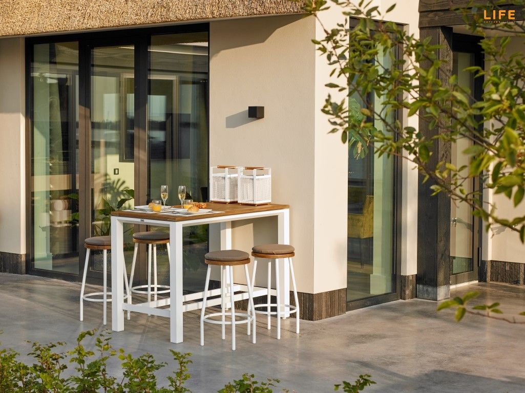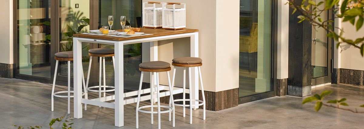 Moderná záhradná barová súprava s krásnym obdĺžnikovým stolom Concept Bar. Stôl má hliníkovú konštrukciu, ktorá je striekaná bielou práškovou farbou. Stolová doska je z teakového dreva najvyššej kvality. Pod stolom máte z oboch strán pohodlné podnožky. Podnožky samozrejme nájdete aj na barových stoličkách. Priestorovú dispozíciu môžete vidieť na priloženom obrázku.