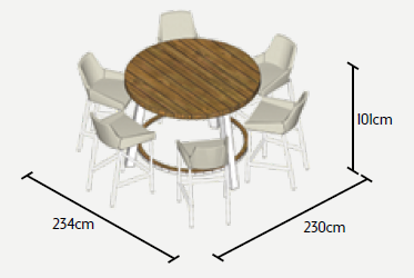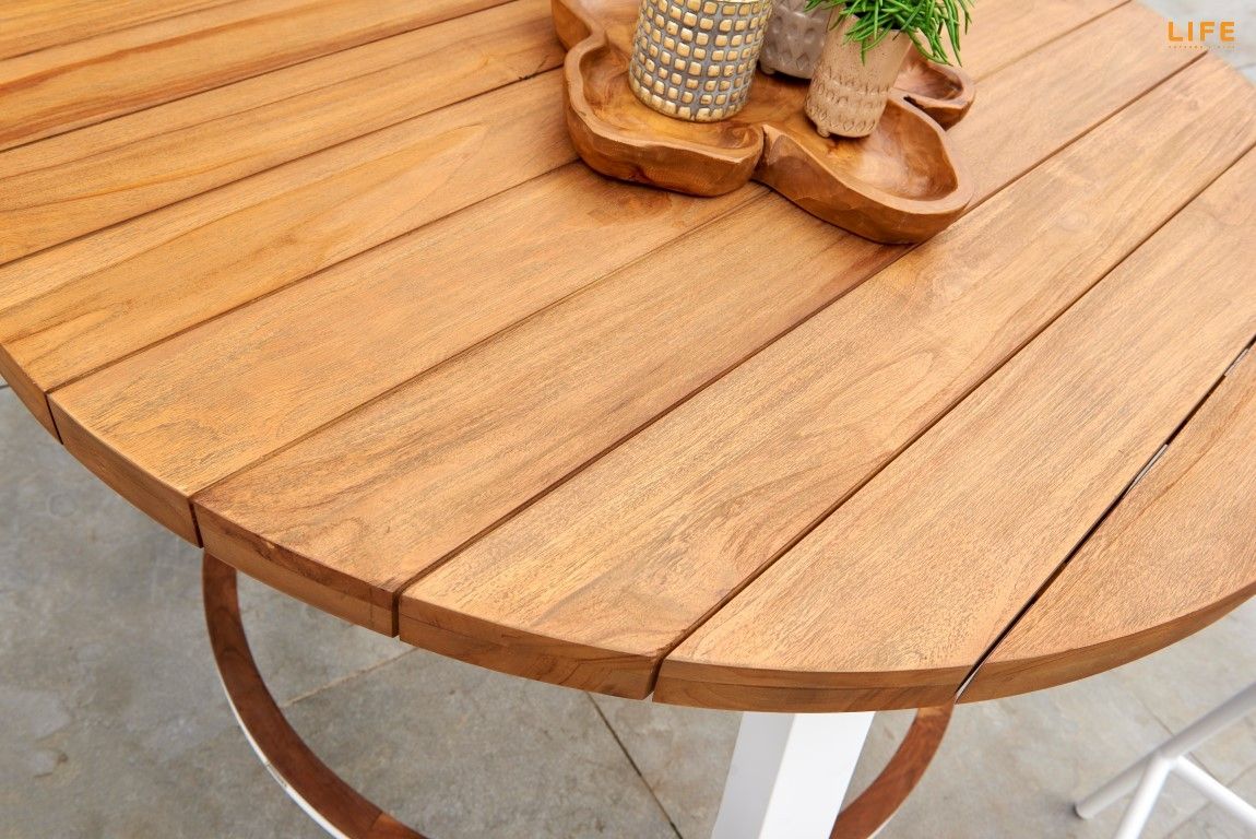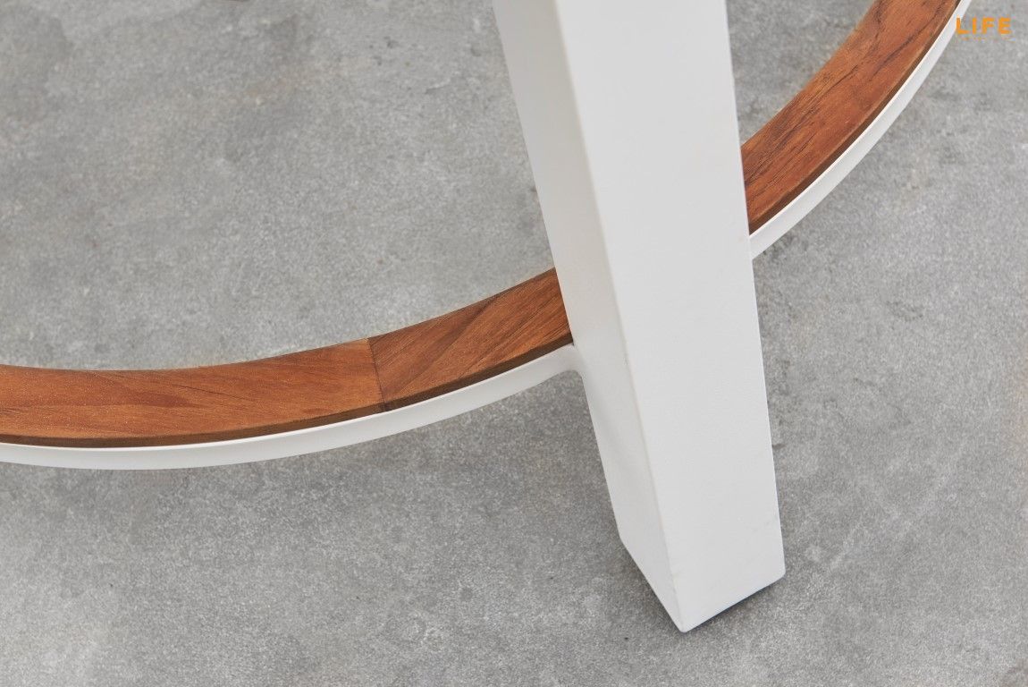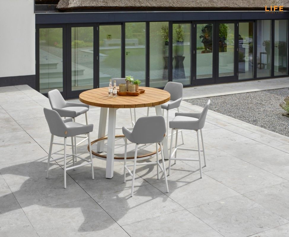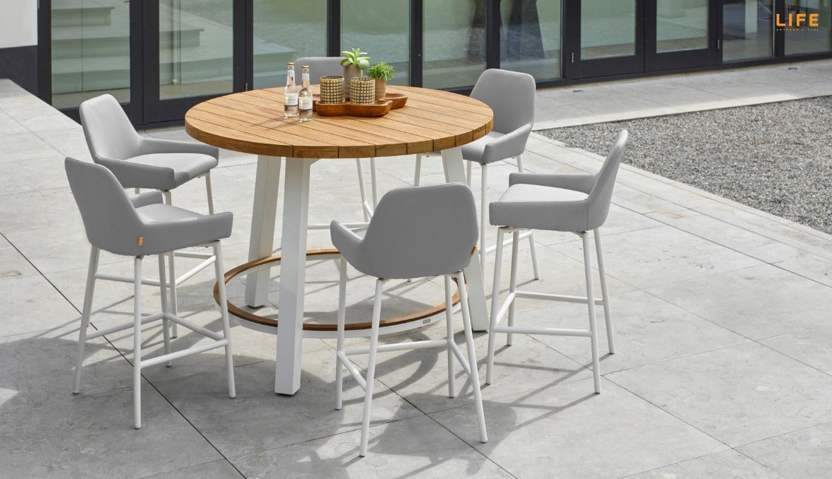 S touto záhradnou barovou súpravou máte dostatočný priestor pre veľkú skupinu priateľov. Stôl je skutočným pútačom pozornosti, vyrobený z bieleho hliníka a doskou z certifikovaného teakového dreva najvyššej kvality z indonézskych plantáží. V spodnej časti stola je šikovná podnožka, takže si môžete nohy pohodlne oprieť. Barové stoličky sú tiež vyrobené z bieleho hliníkového rámu, majú sedadlo s poťahom All Weather Cushions, takže nemusíte stoličky schovávať ani pred dažďom. Priestorovú dispozíciu môžete vidieť na priloženom obrázku.