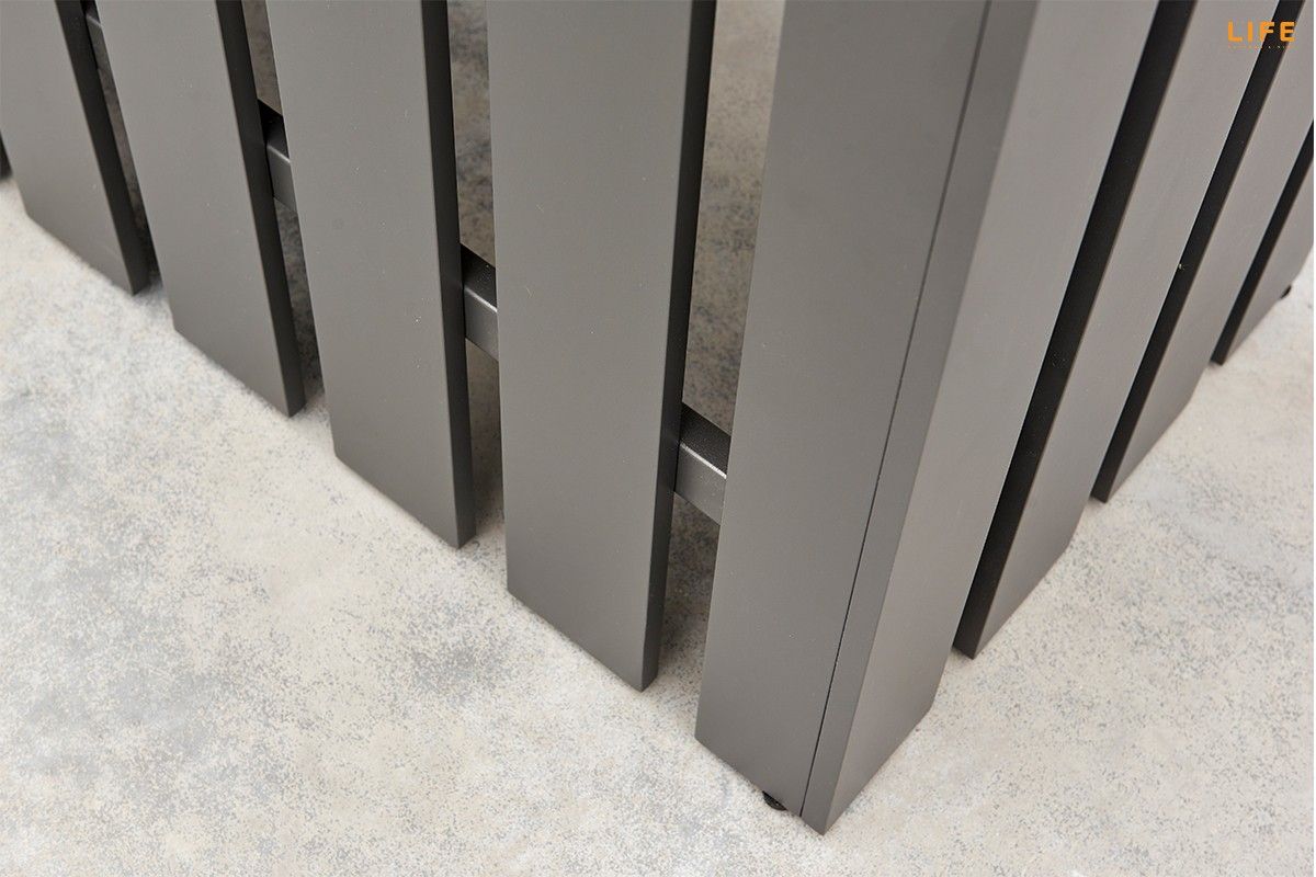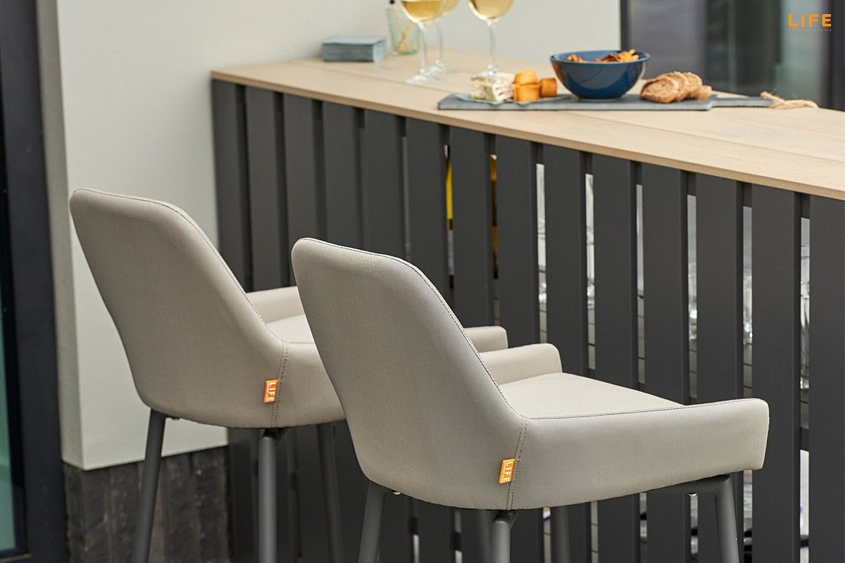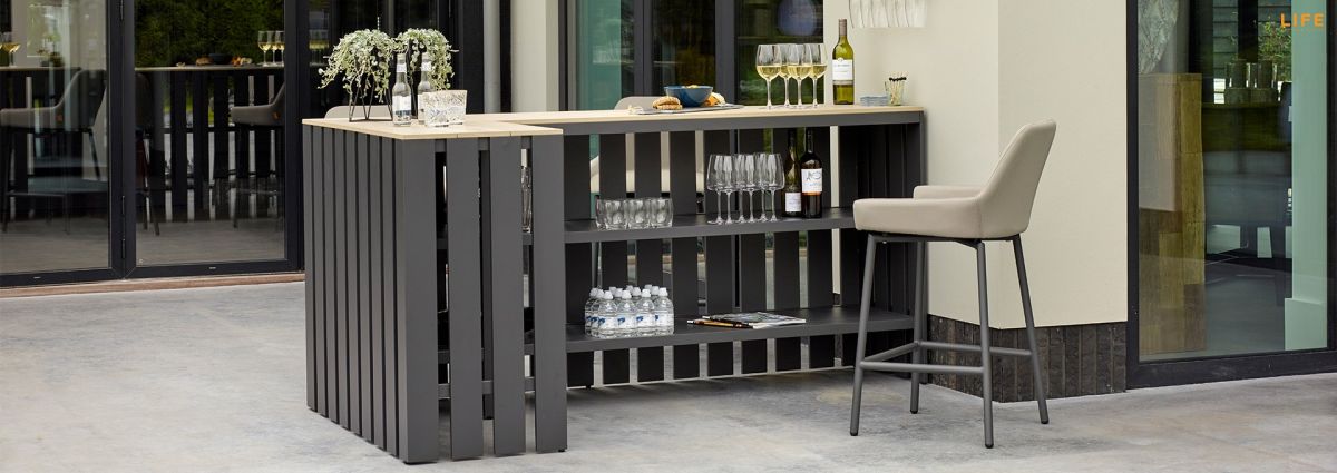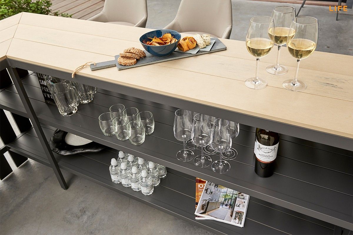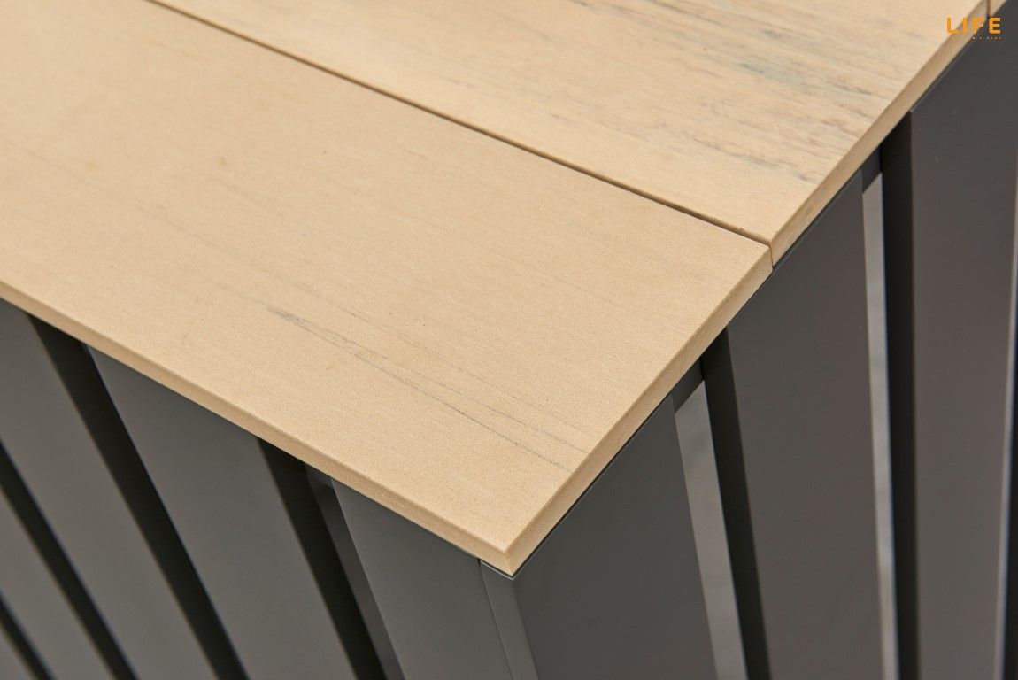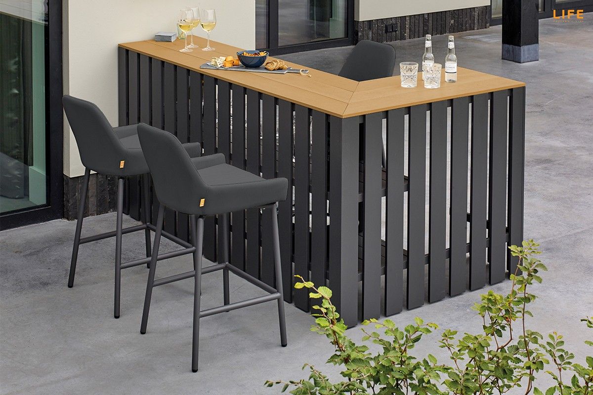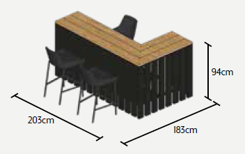 Exteriérový barový stôl Fiji má moderný vzhľad vďaka hliníkovému rámu so zvislými lištami a pôsobí tak veľmi priestranne. Hliníkové police sú pripevnené k vnútornej strane rámu, kde môžete úhľadne odložiť všetky svoje poháre a príslušenstvo. Takto budete mať pri príjemnom večernom pití všetko na dosah. Fiji bar je ako stvorený na veľa dlhých letných večerov. K barovému stolu Fiji sa dokonale hodia barové stoličky Nuna alebo Kanada. Pre viac informácií nás neváhajte kontaktovať. Priestorovú dispozíciu môžete vidieť na priloženom obrázku.