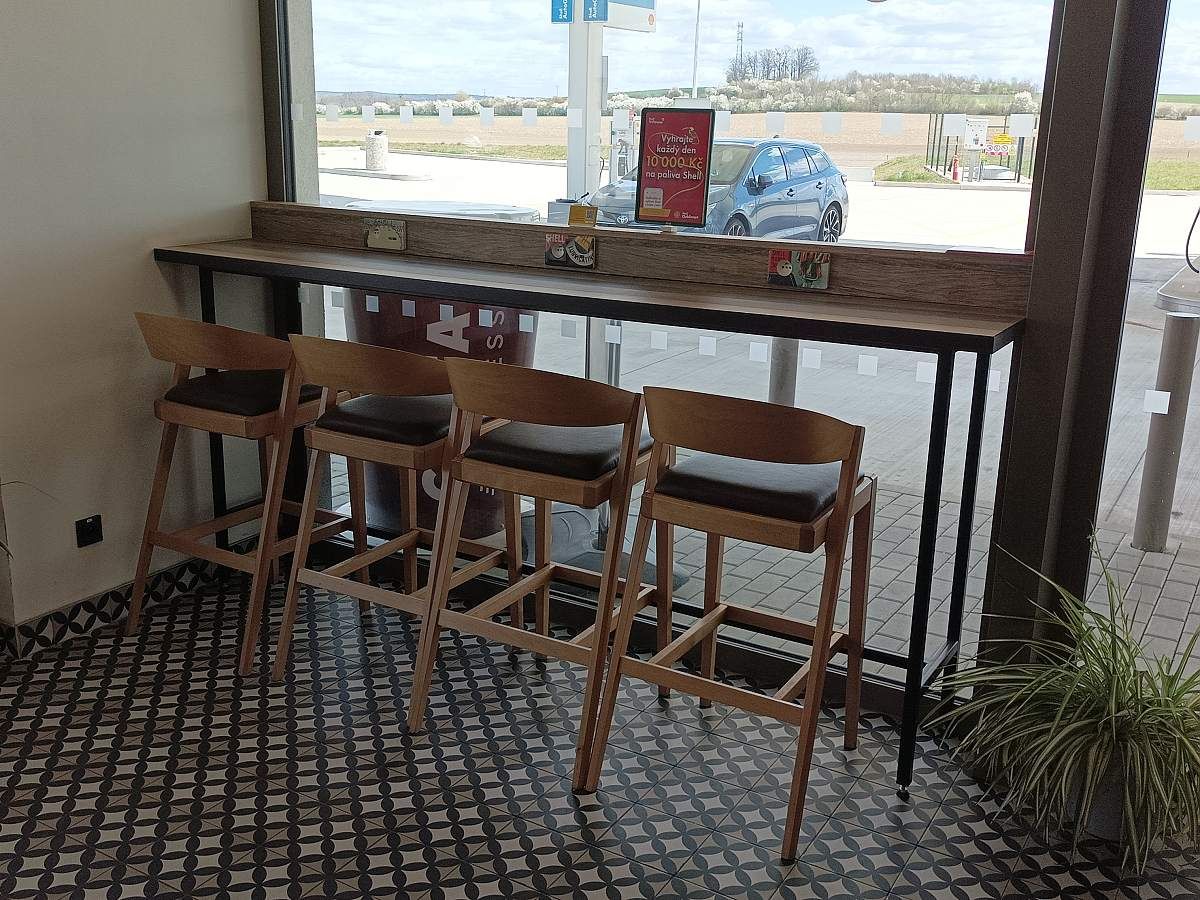 Vybavenie novej čerpacej stanice Shell krásnymi interiérovými stoličkami Marco, ktoré elegantne dopĺňajú barové stoličky Ghana bar v rovnakom prevedení dreva a poťahovej látky.