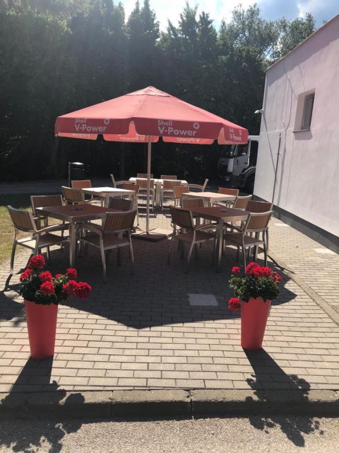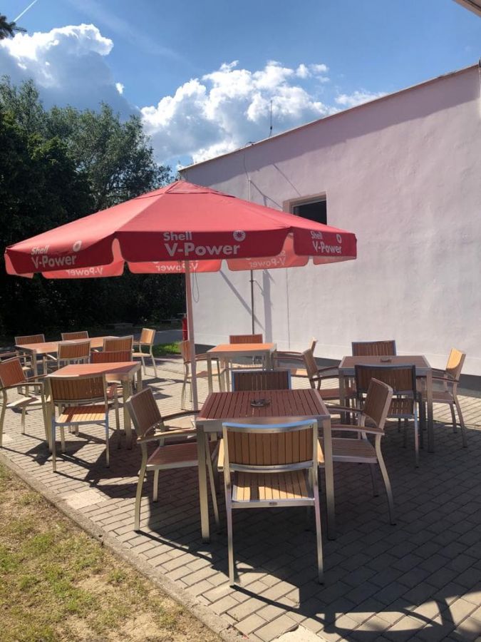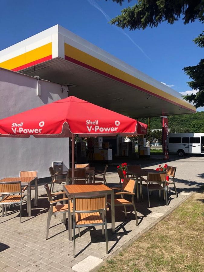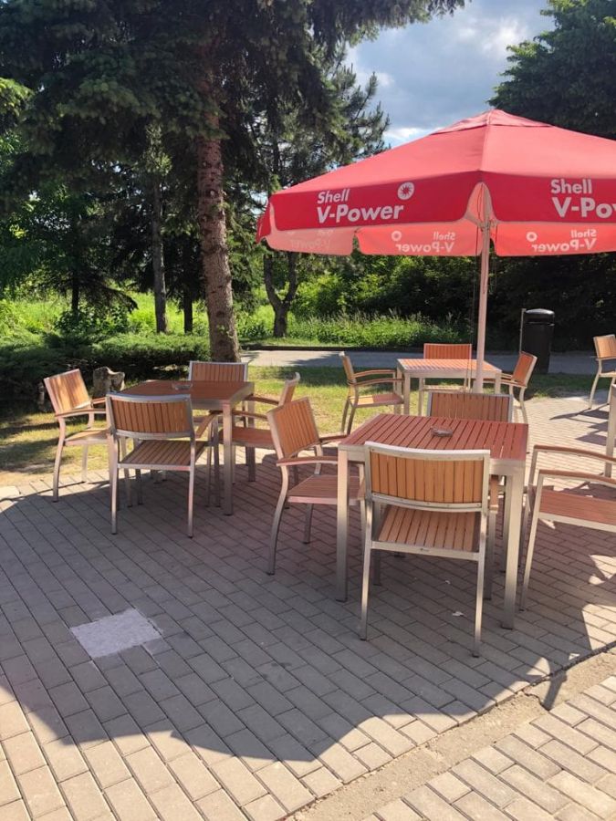 Vybavenie terasy čerpacej stanice Shell v Košiciach nádhernými stolami a stoličkami v imitácii dreva.