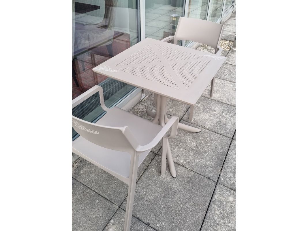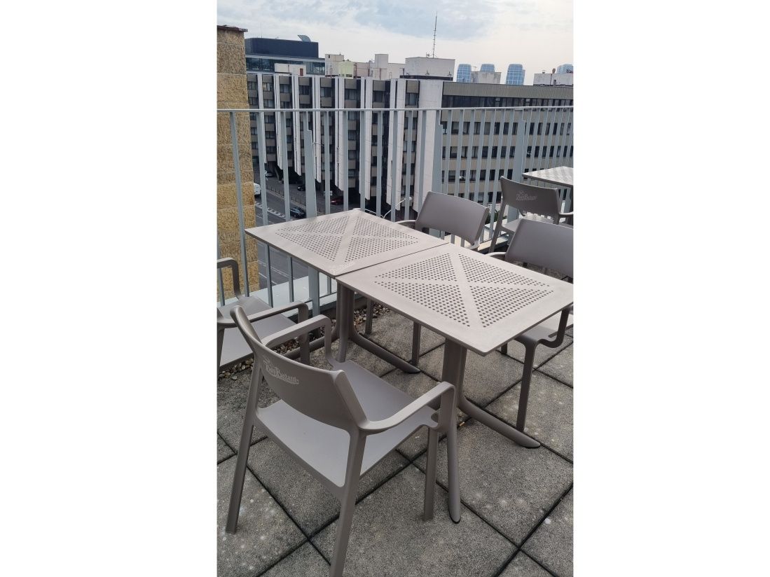 Vybavenie letnej terasy hotela Falkensteiner v Bratislave. Dodávali sme odolné a praktické sedenie od spoločnosti Nardi, konkrétne stoličky Trill Armchair a stoly Clip. Stolové súpravy sú v sivohnedej farbe Tortora.