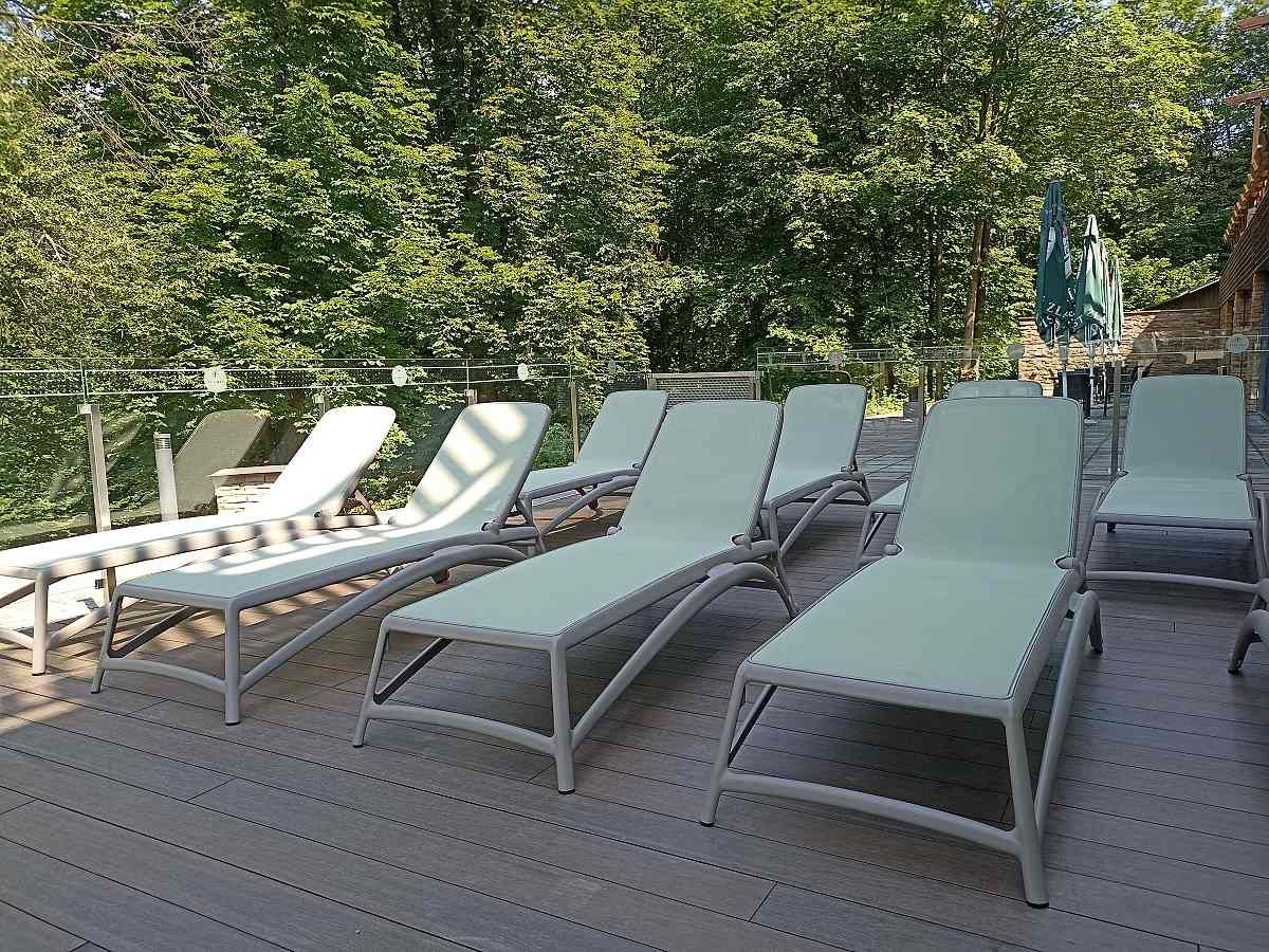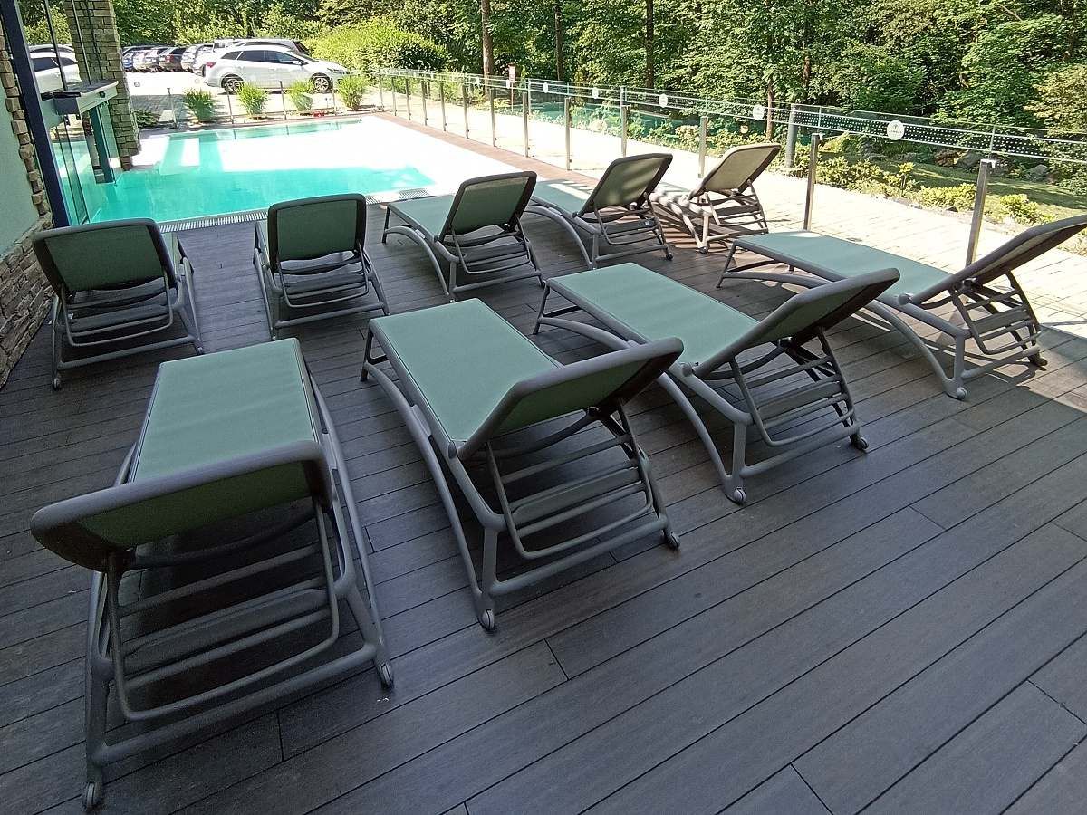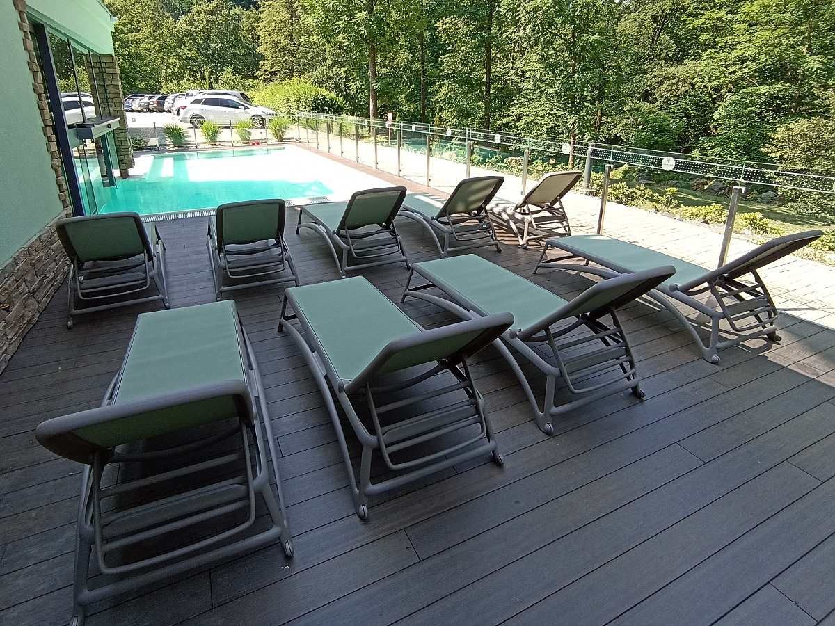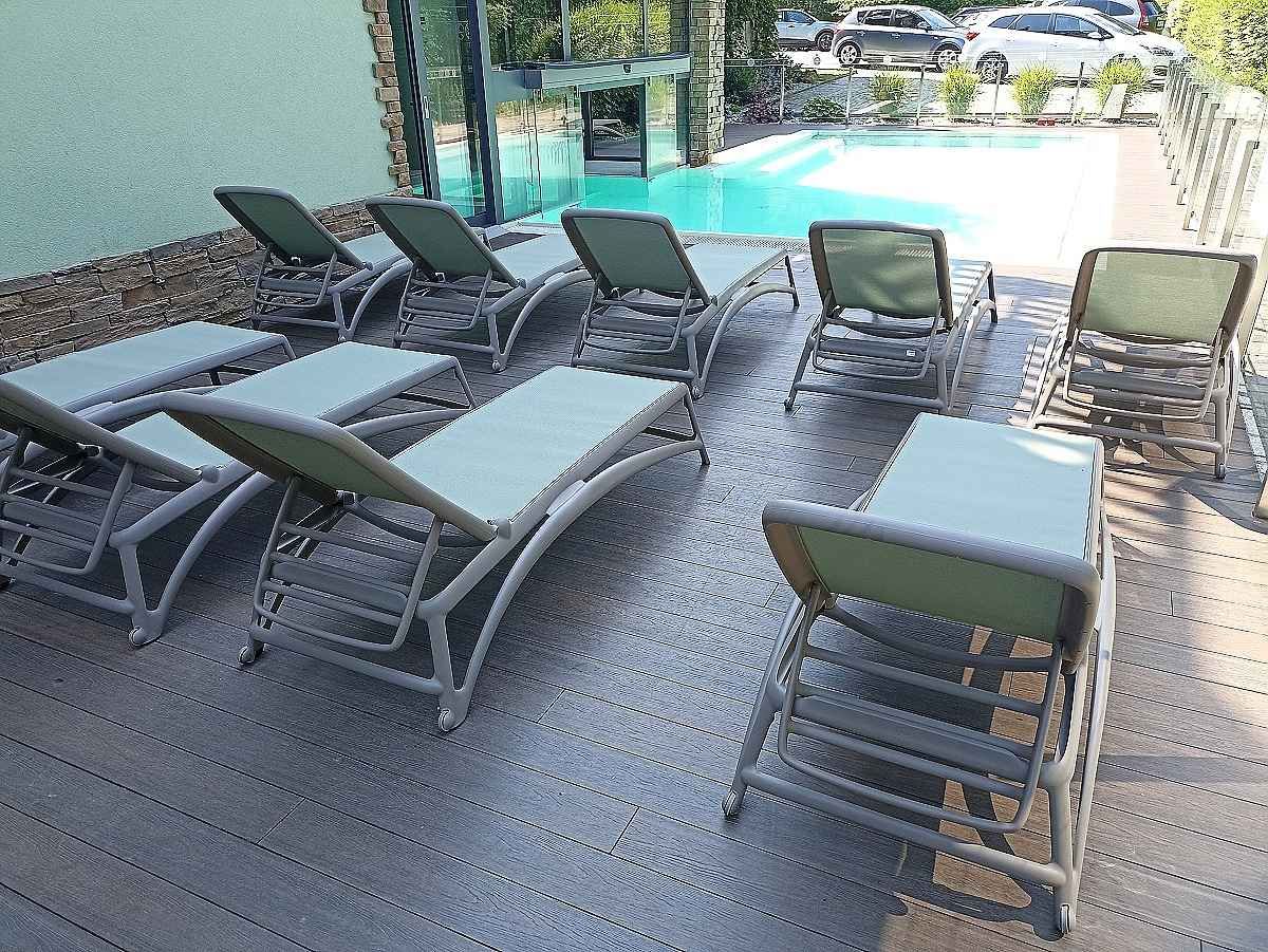 Vybavenie bazénovej časti krásneho Hotela Termál vo Vyhniach modernými lehátkami Atlantico vo farbenej kombinácii Tortora Agave.