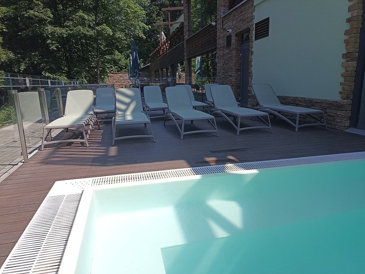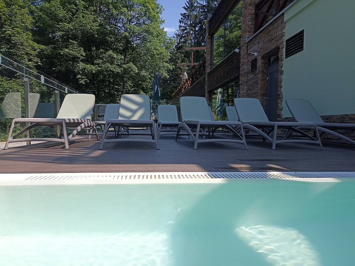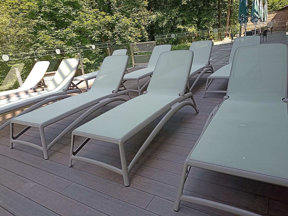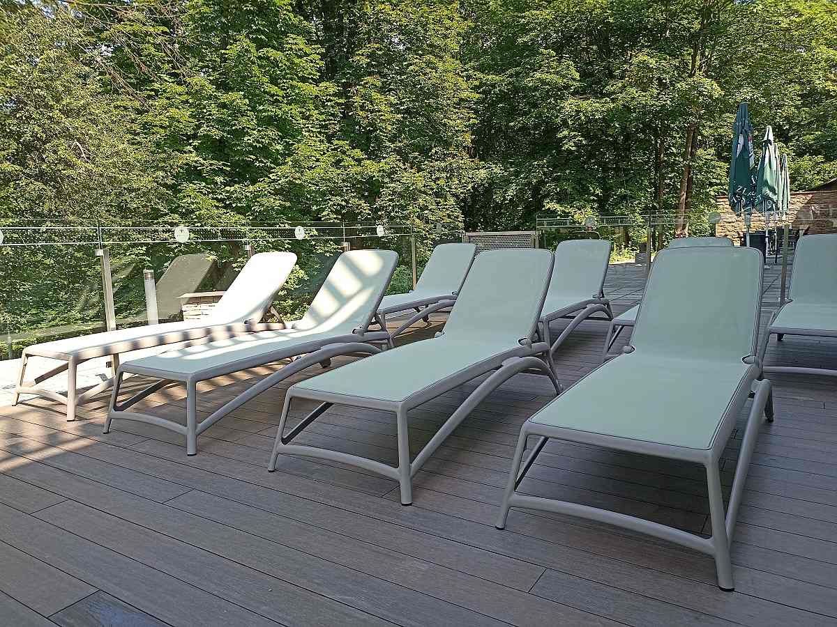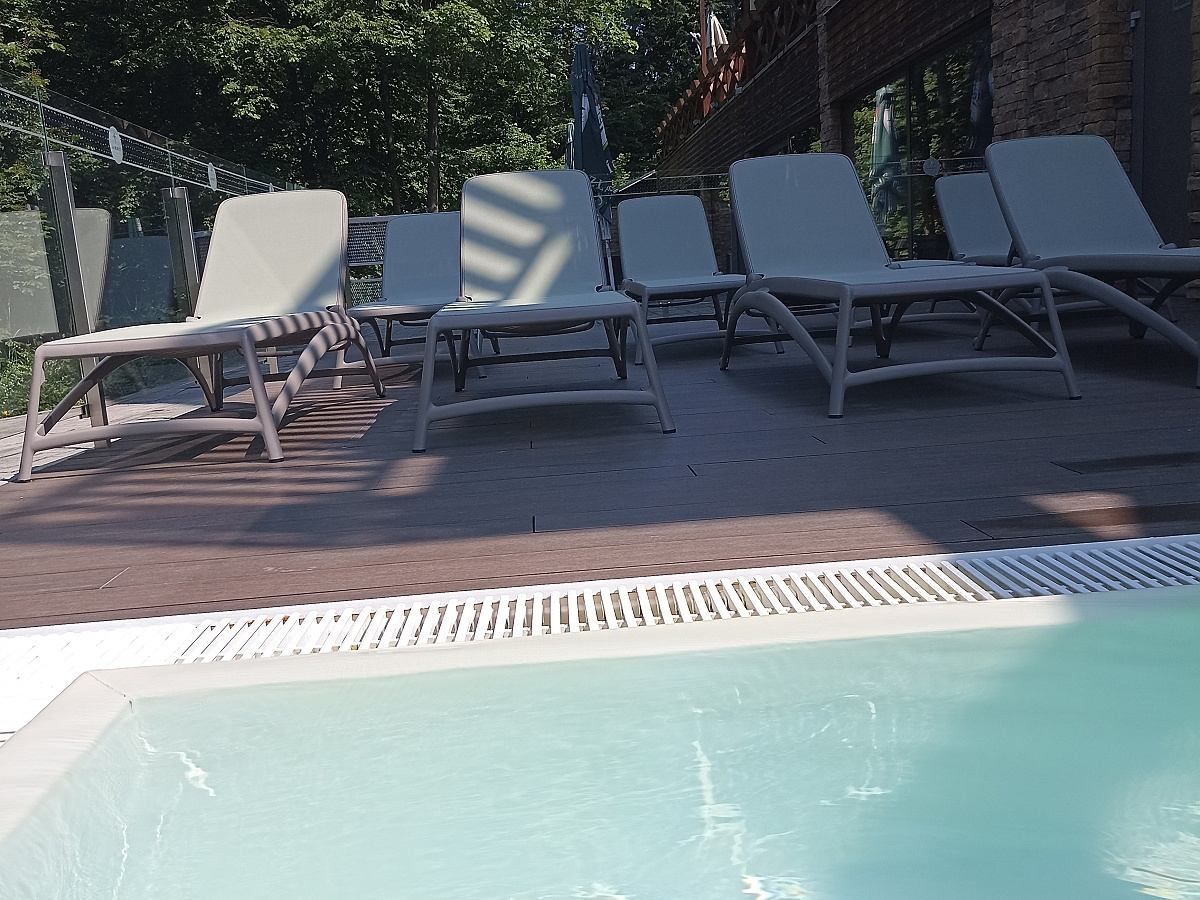 Vybavenie bazénovej časti krásneho Hotela Termál vo Vyhniach modernými lehátkami Atlantico vo farbenej kombinácii Tortora Agave.
