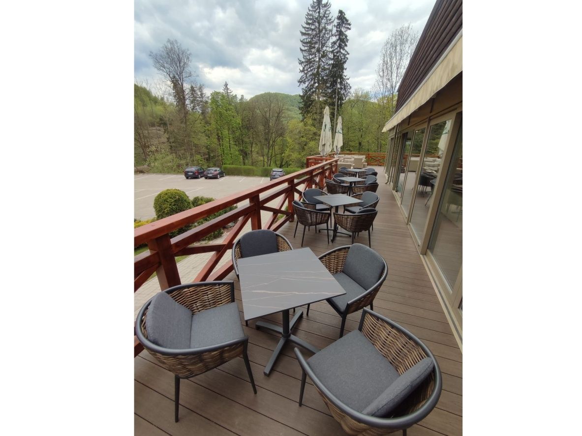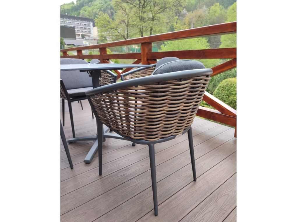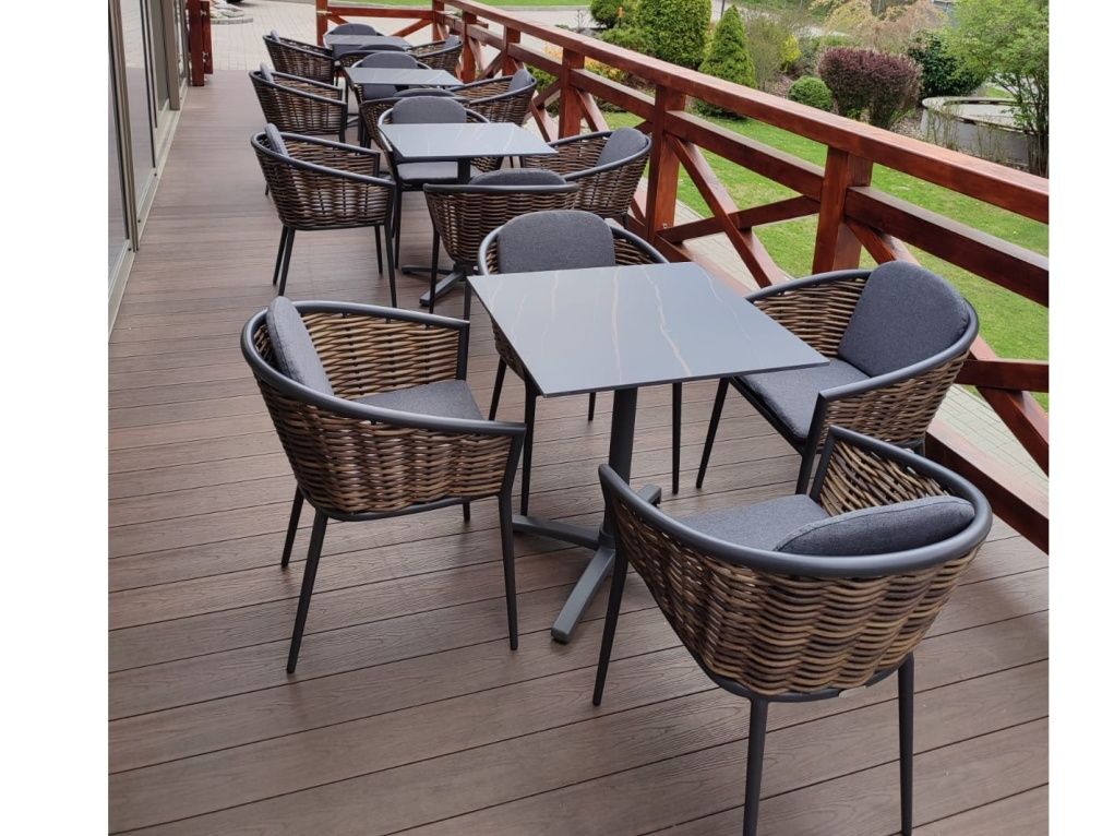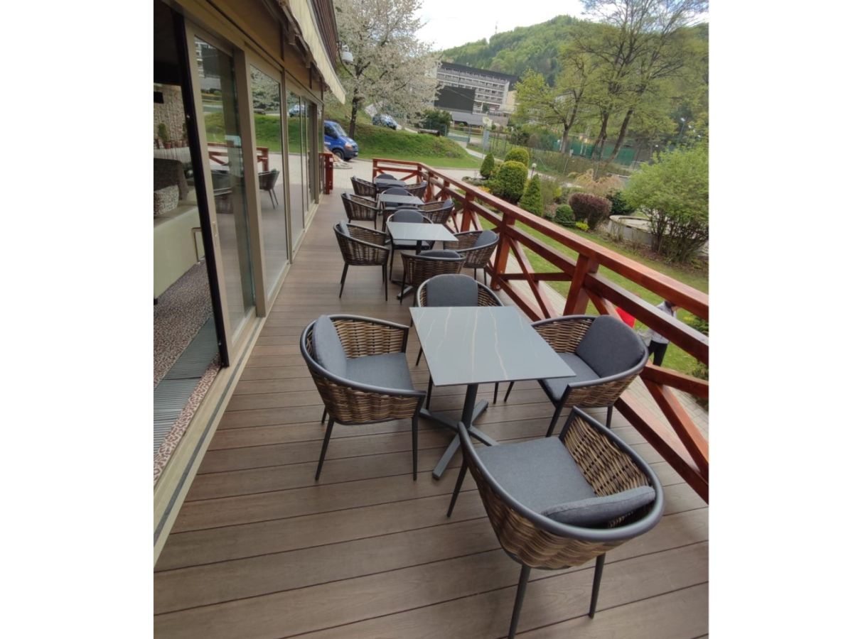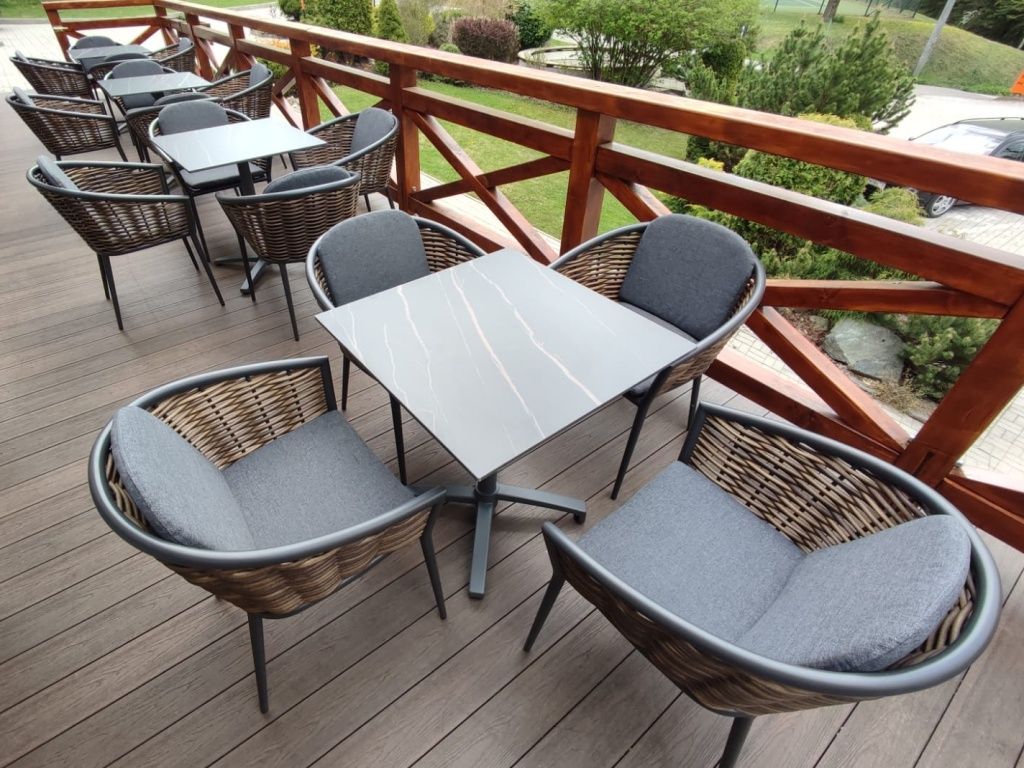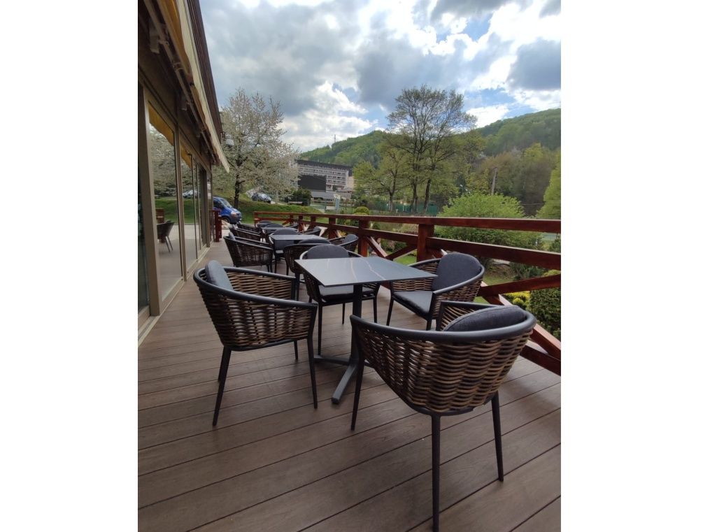 Vybavenie letnej terasy Hotelu Termál vo Vyhniach. Dodávali sme krásne a pohodlné kreslá Bounty s praktickými stolmi Thea so stolovou doskou z umelého kameňa v imitácii mramoru.