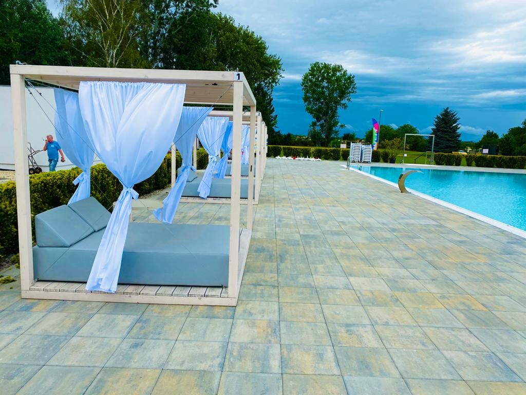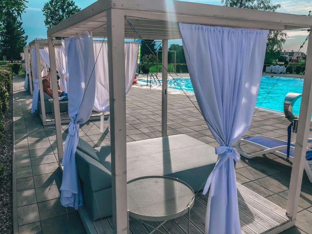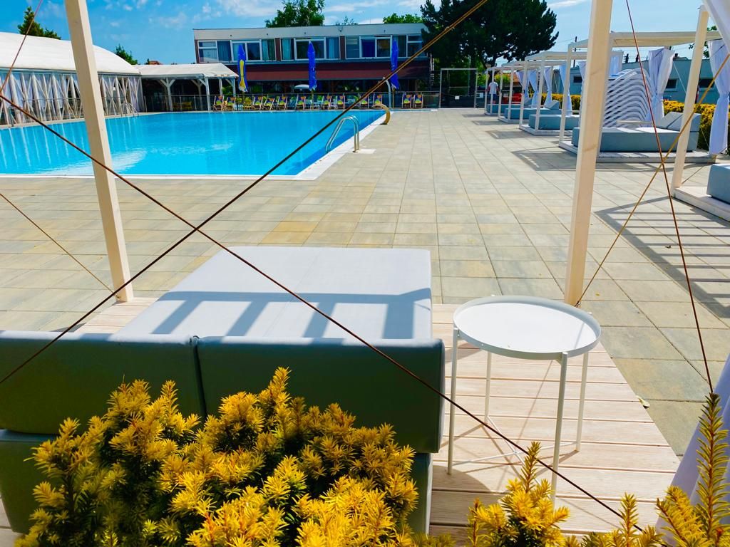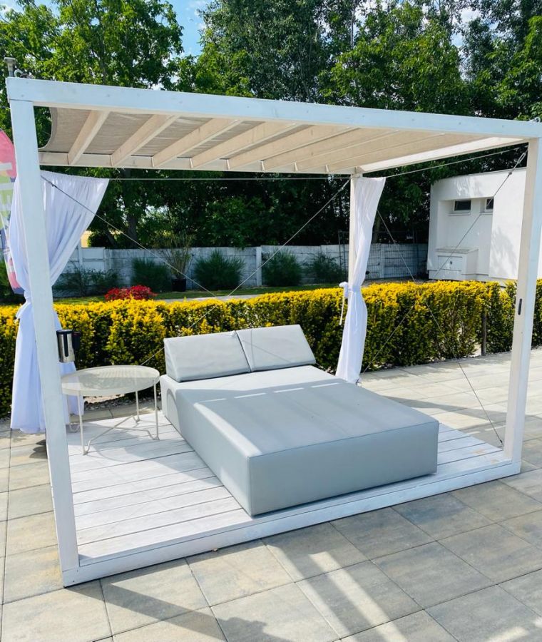 Vybavenie kúpaliska Kerkira Pub luxusnými outdoorovými ležadlami Kiwi v prevedení s nepremokavou látkou Silvertex určenou na celoročné používanie v exteriéri.