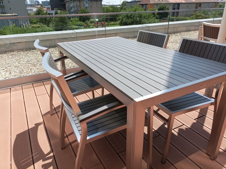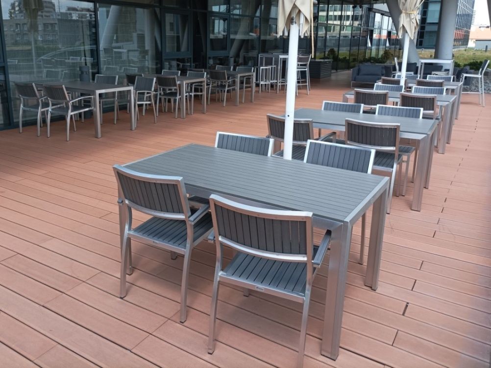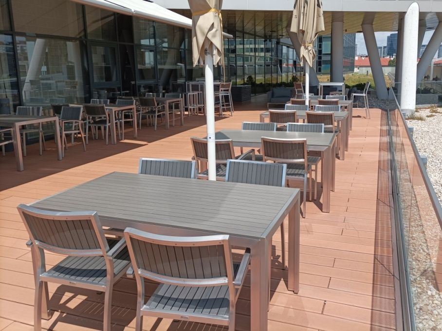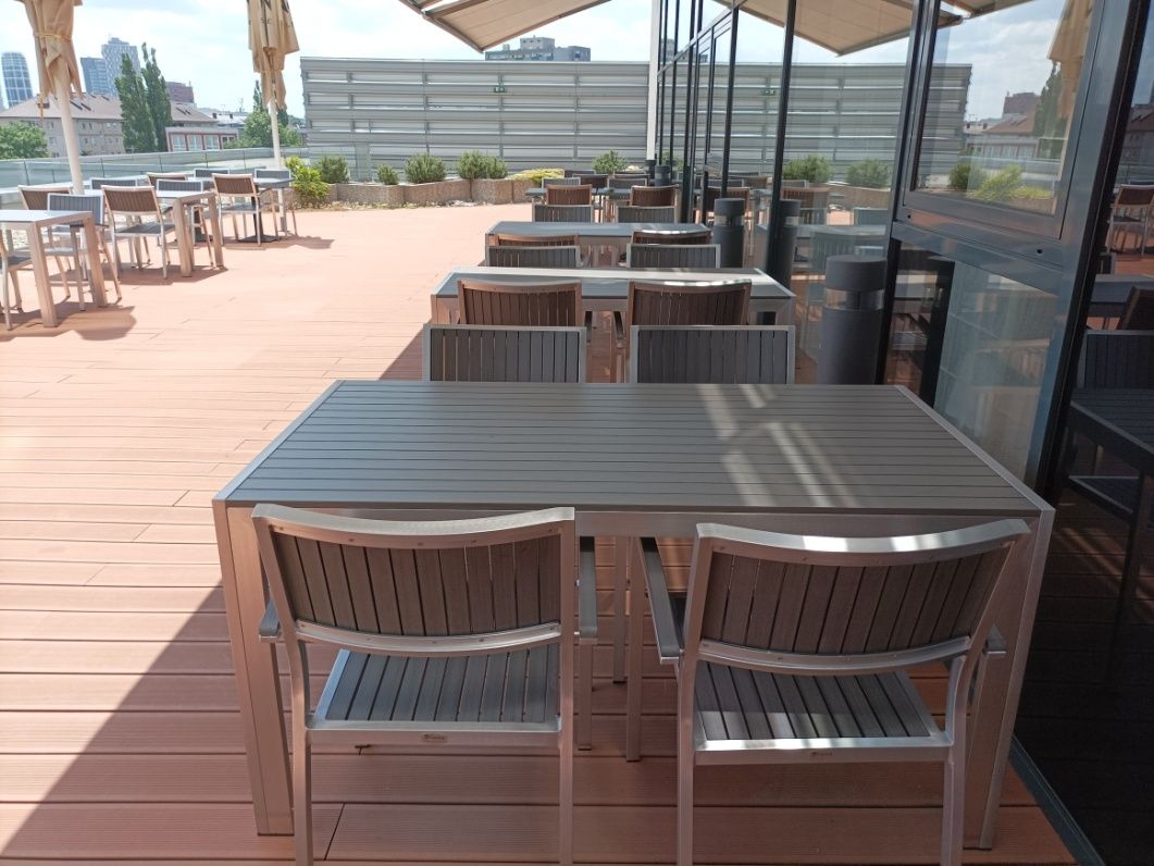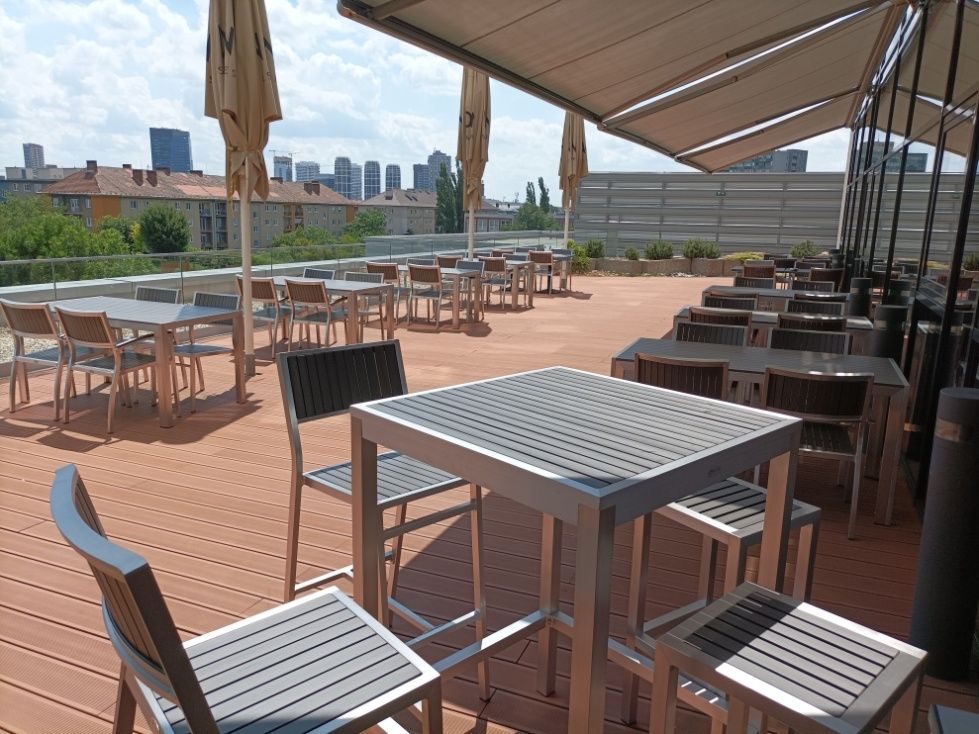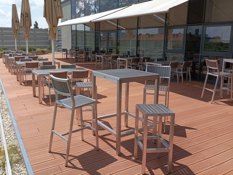 Vybavenie letnej terasy Lindner Hotel Gallery Central v Bratislave. Dodávali sme praktické a odolné stolové a barové súpravy Bavaria Grey.