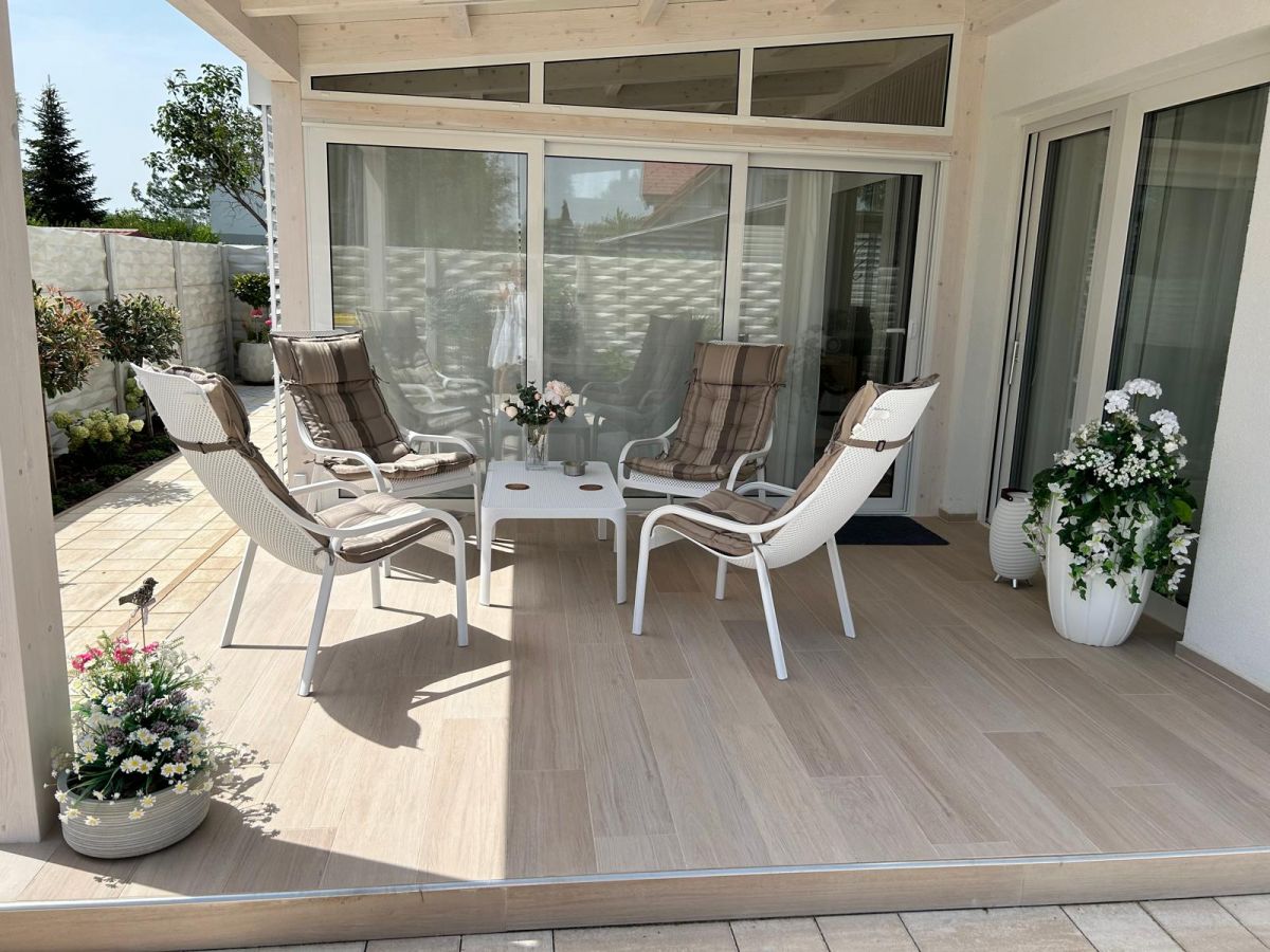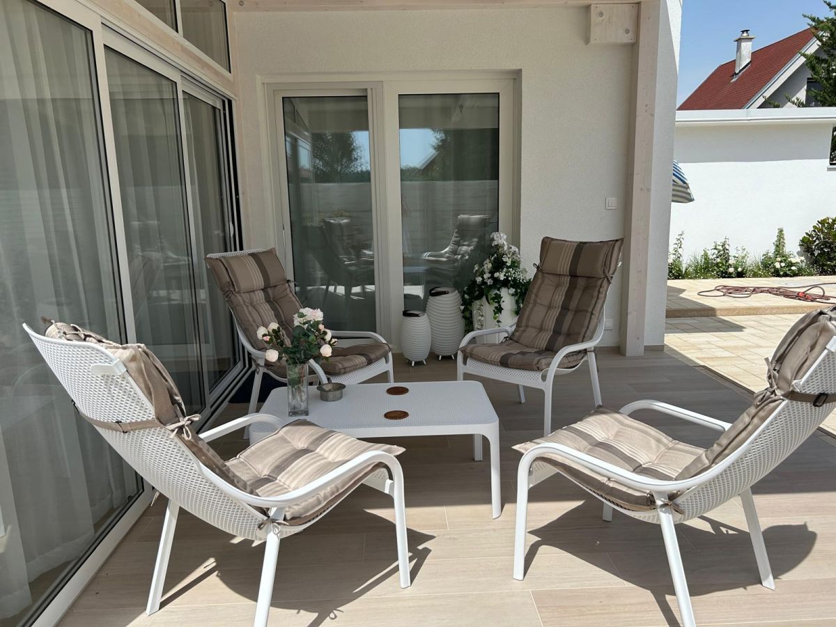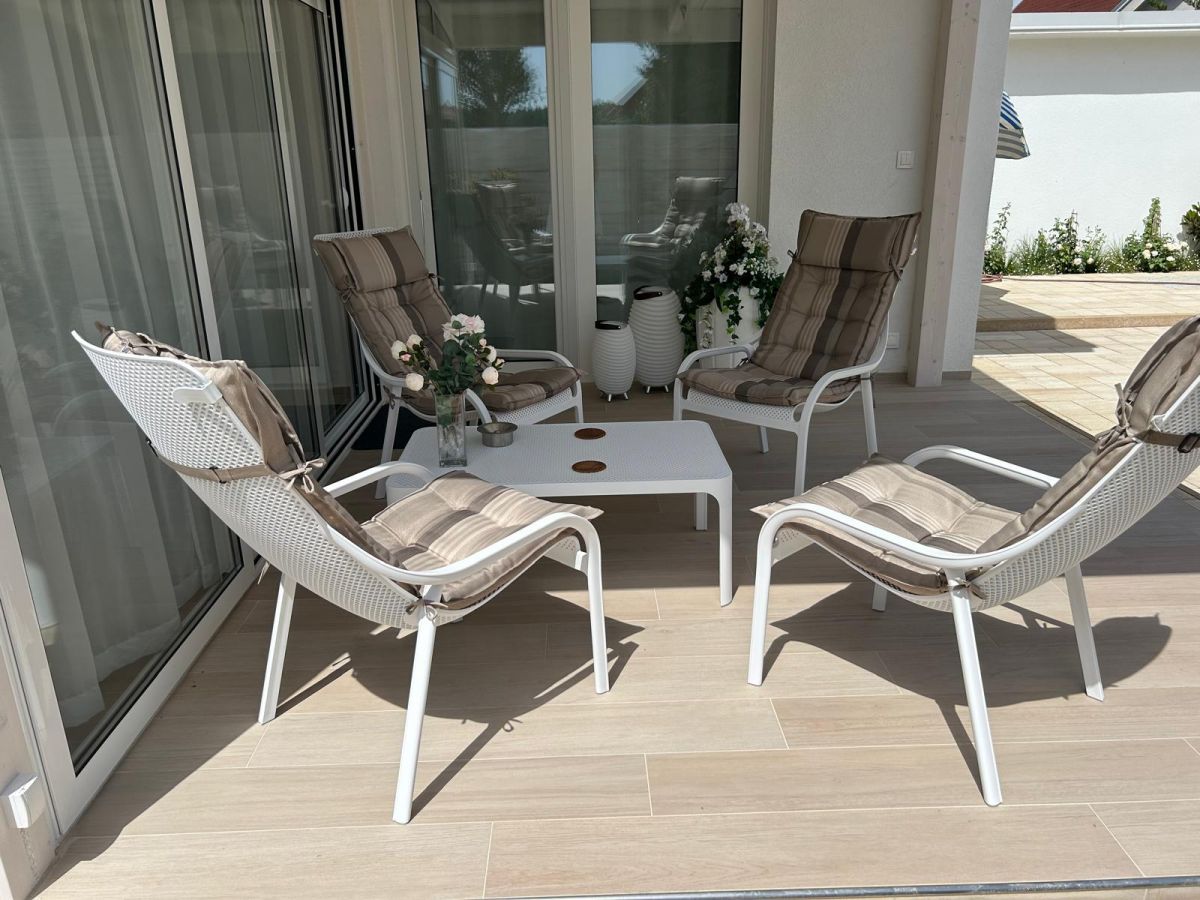 Vybavenie krásnej terasy pohodlnými kreslami Net Lounge Bianco, ktoré sú doplnené o konferenčný stolík Net Tavolino Bianco.