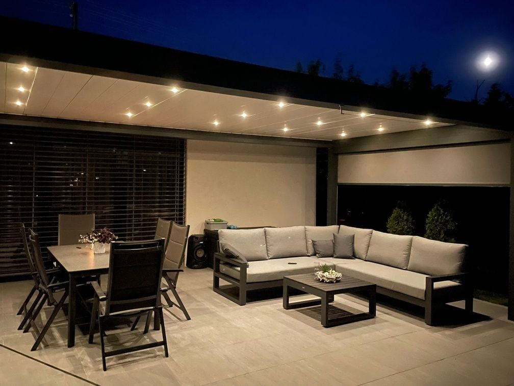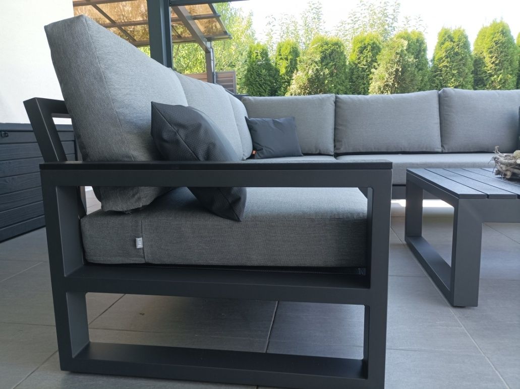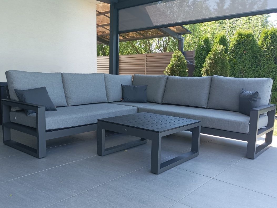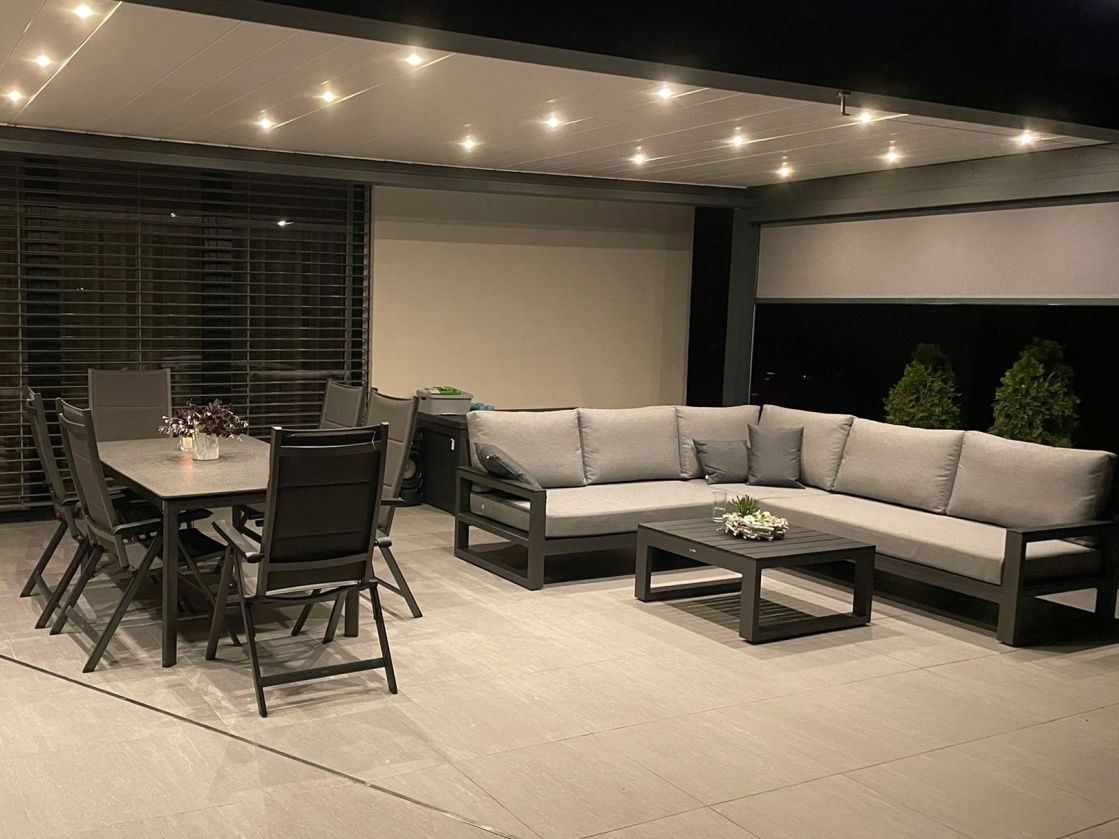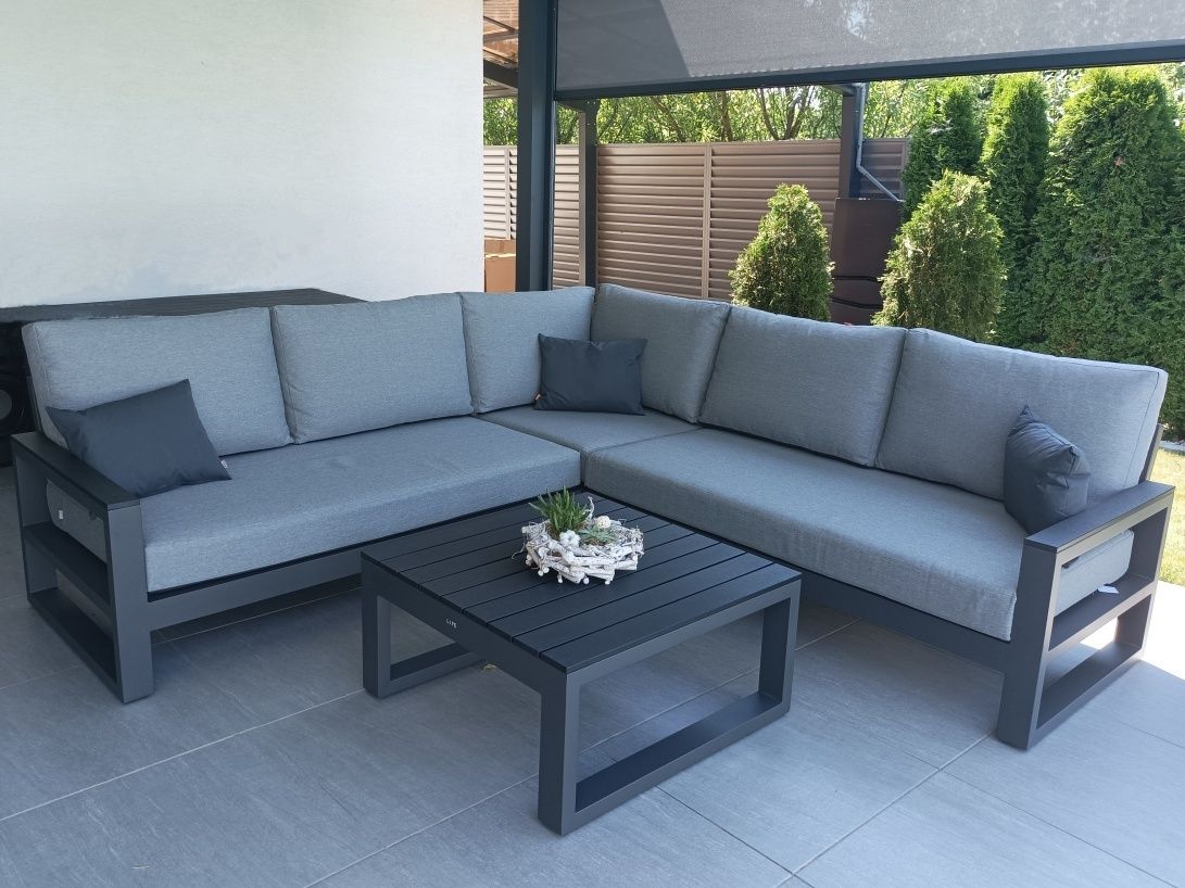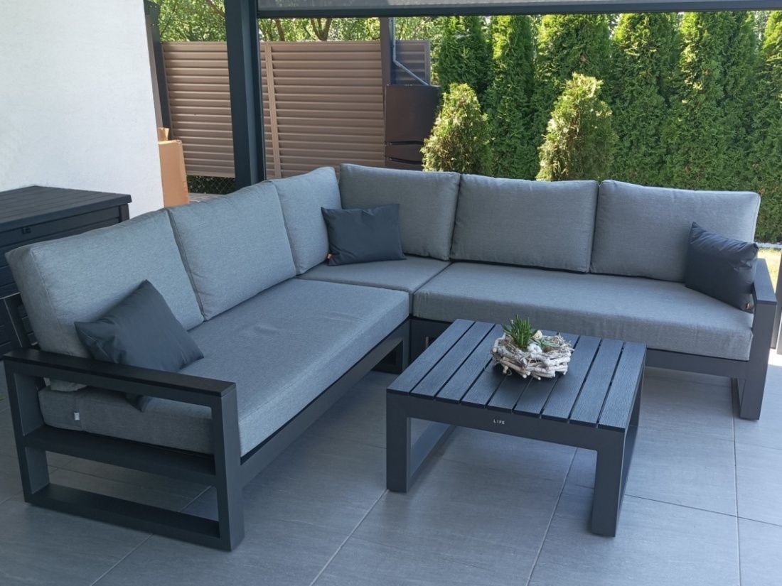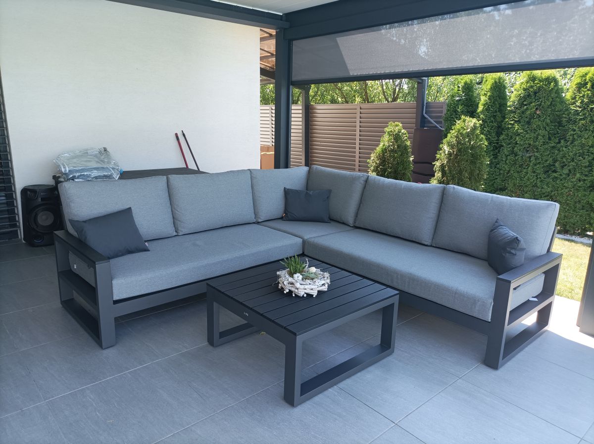 Vybavenie terasy moderného domu štýlovou a elegantnou sedacou súprava Mallorca Corner Lava s matracmi a vankúšmi v prevedení Mist Grey Soltex - látka príjemná na dotyk a zároveň vhodná do každého počasia.