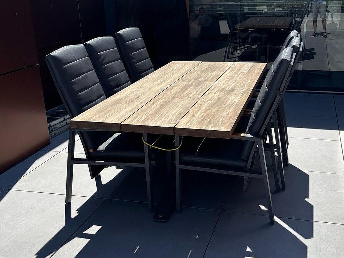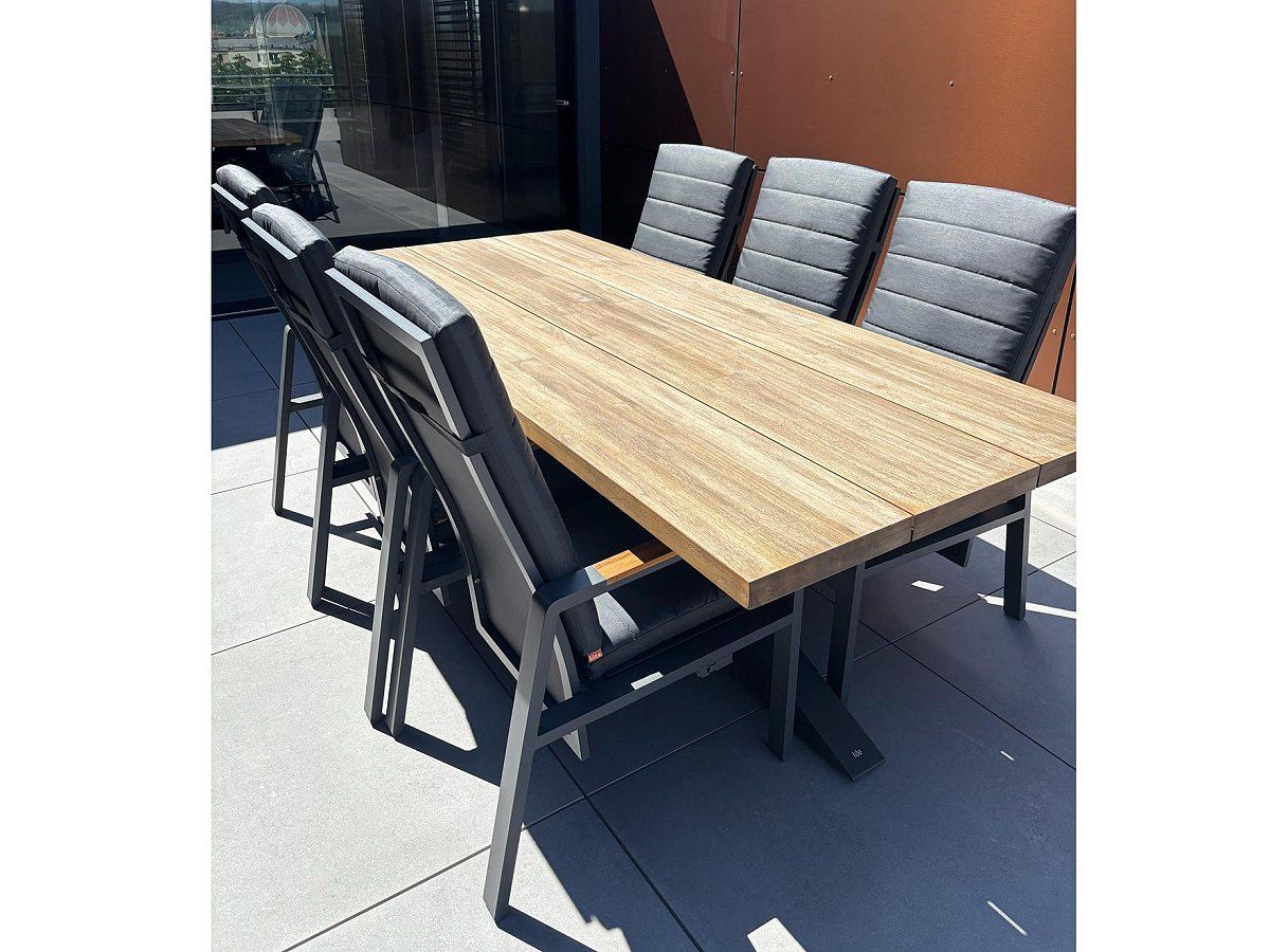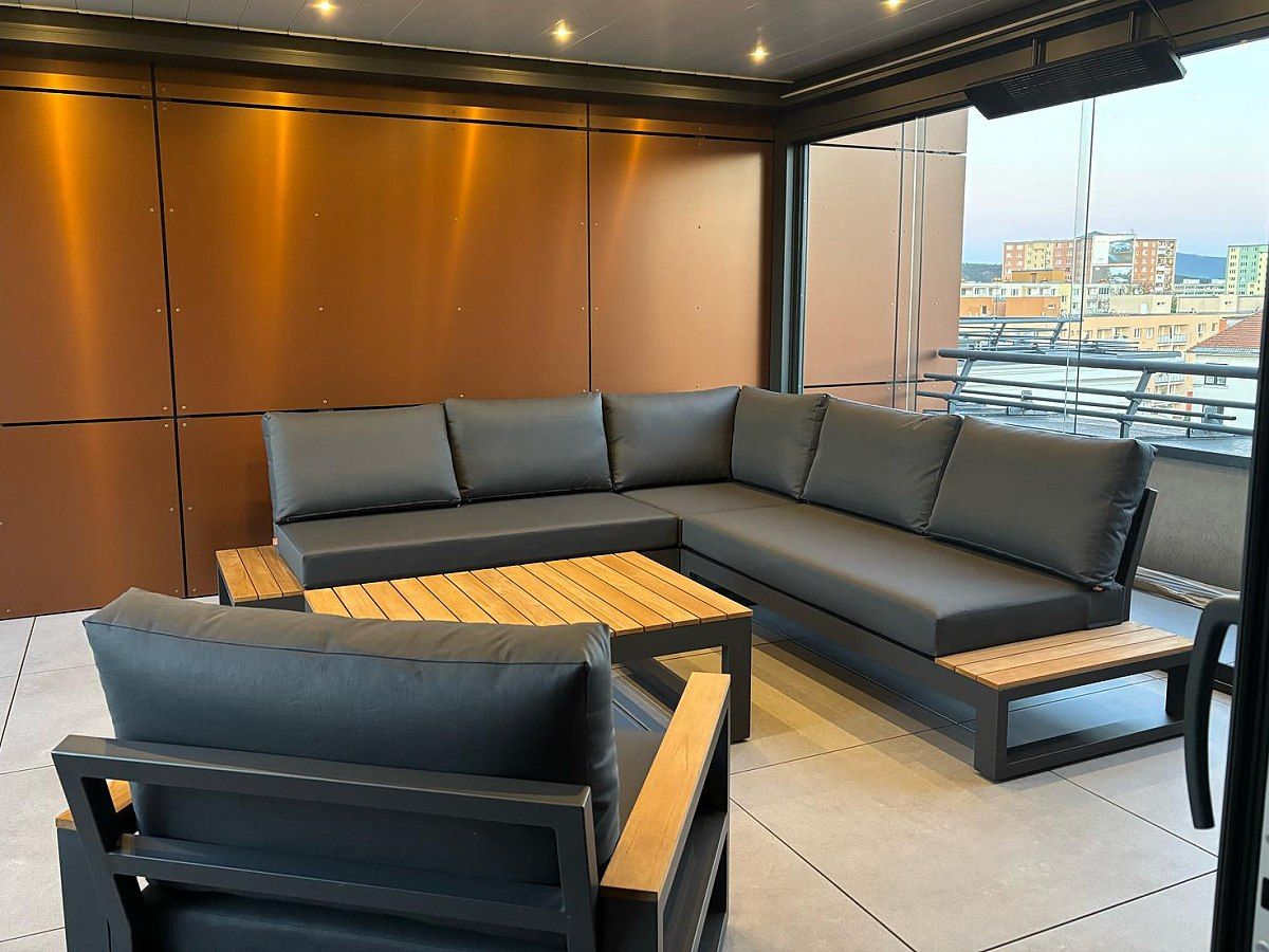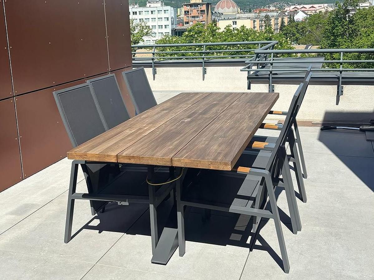 Vybavenie krásneho apartmánu elegantnou sedacou a stolovou súpravou. Pohodlnú a krásne spracovanú rohovú sedaciu súpravu Soho Corner dopĺňa masivny stôl Timor Lava Robust Teak s polohovacími kreslami Montana.