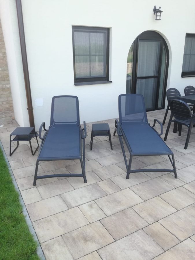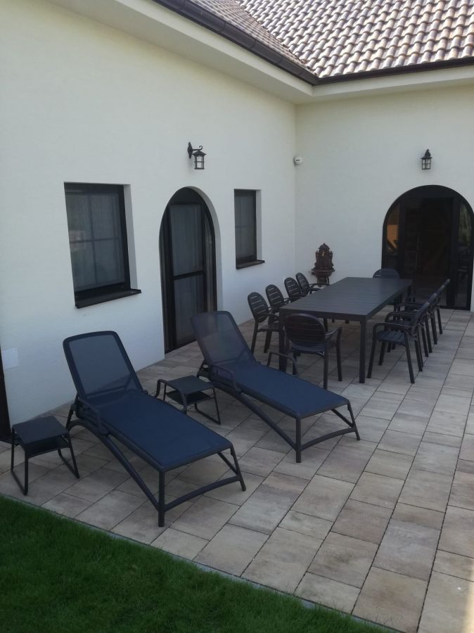 Vybavenie terasy rodinného domu stolovou súpravou Rio Palma, ktorá je doplnená o set lehátok Atlantico so stolíkmi Pop. Všetko vo farbe Antracit.