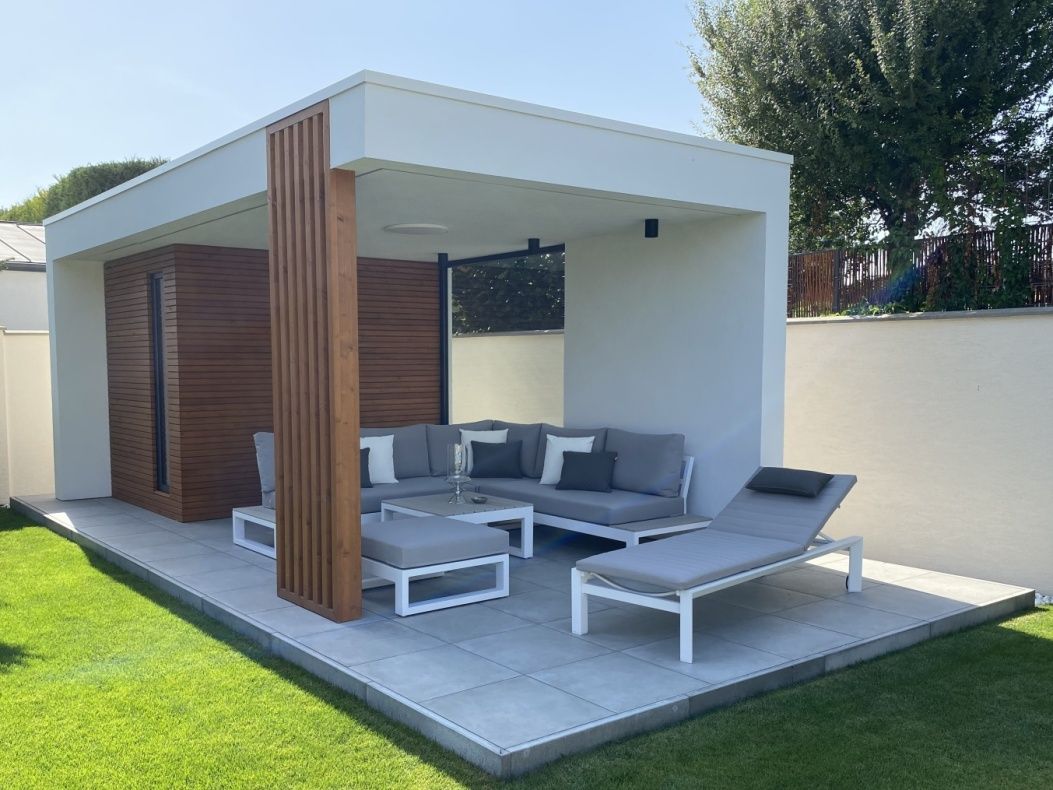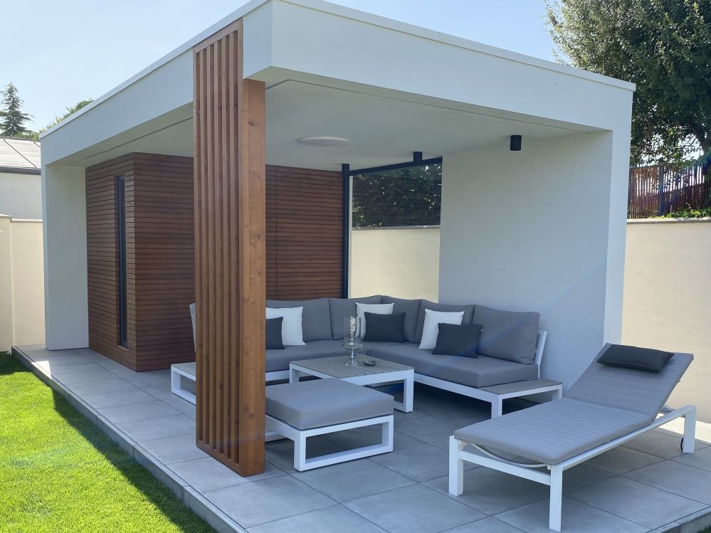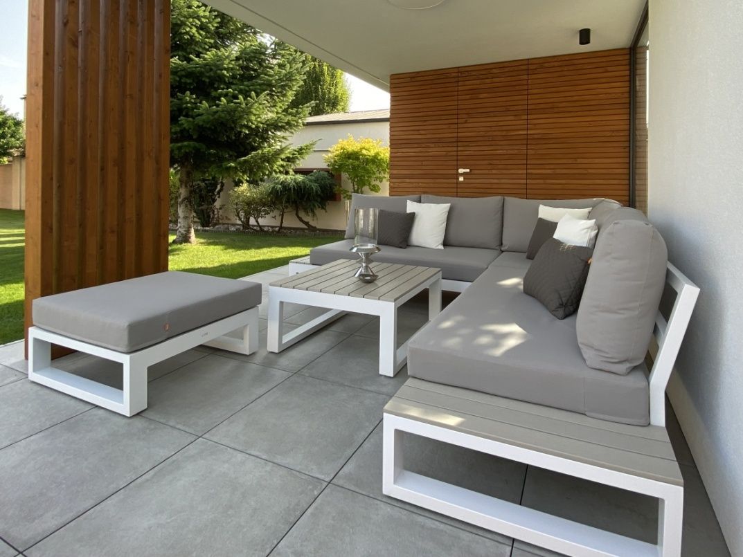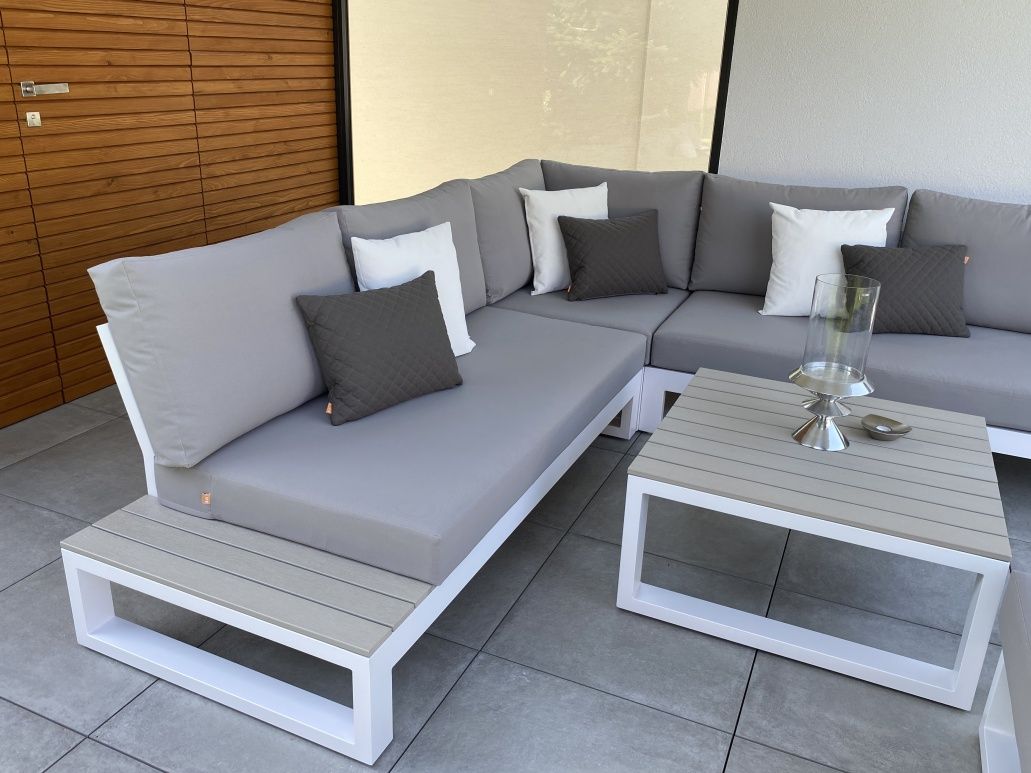 Vybavenie terasy krásnou a elegantnou sedacou súpravou Mallorca Corner White s bočnými stolíkmi a pohodlným lehátkom Delta White. Sedacia súprava aj lehátko má matrace All Weather vhodné na celoročné použitie vonku.