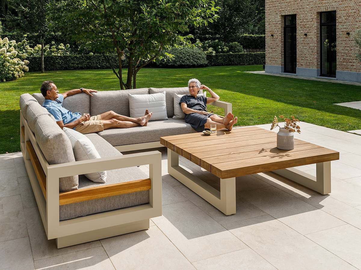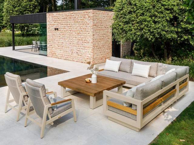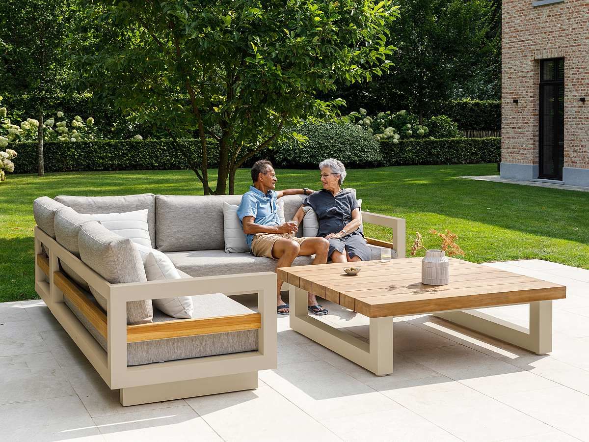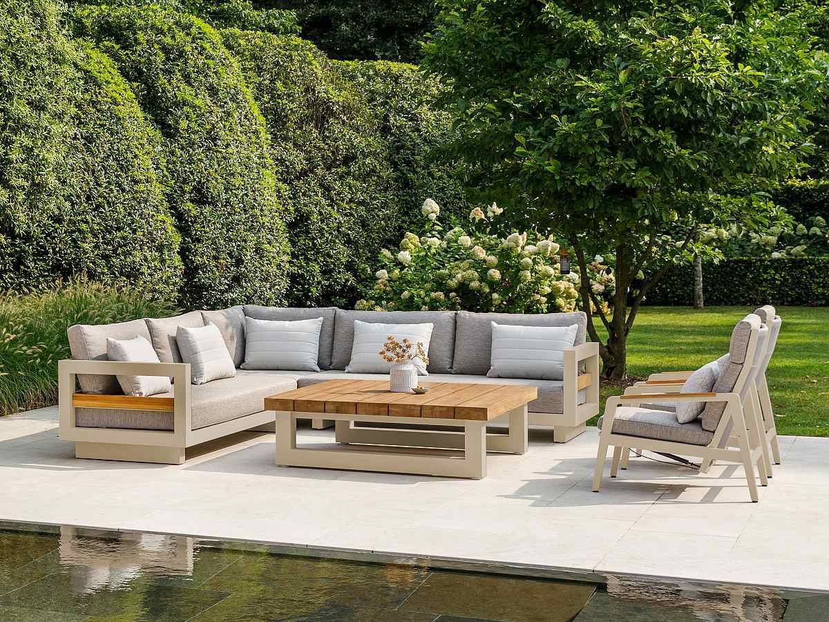 Rohová záhradná sedacia súprava Himalaya bude výraznou dominantou každej terasy. Konštrukcia sedacej súpravy Himalaya je z pevného hliníku vo farbe Beige - je ale dostupná aj antracitovom odtieni Lava. Hliníkový rám elegantne doplňuje masívne prémiové teakové drevo. Podpsedáky a opierkové vankúše vo farbe Beige sú z materiálu All Weather Soltex, vďaka ktorému sa nemusíte obávať žiadneho nepriaznivého počasia a môžu byť umiestnené vonku počas celého roku. Podsedáky a vankúše su dostupné vo viacerých farebných prevedeniach, ktoré Vám vieme na vyžiadanie zaslať.