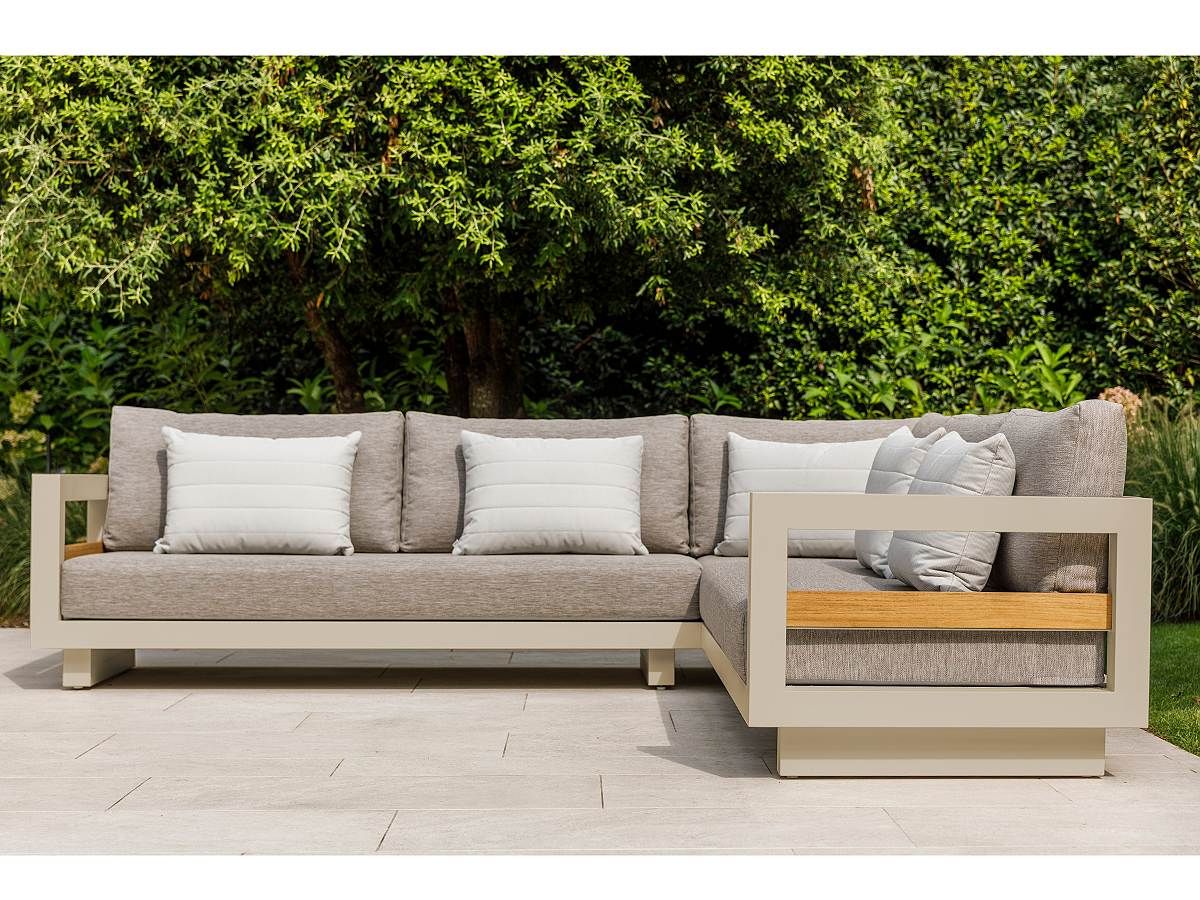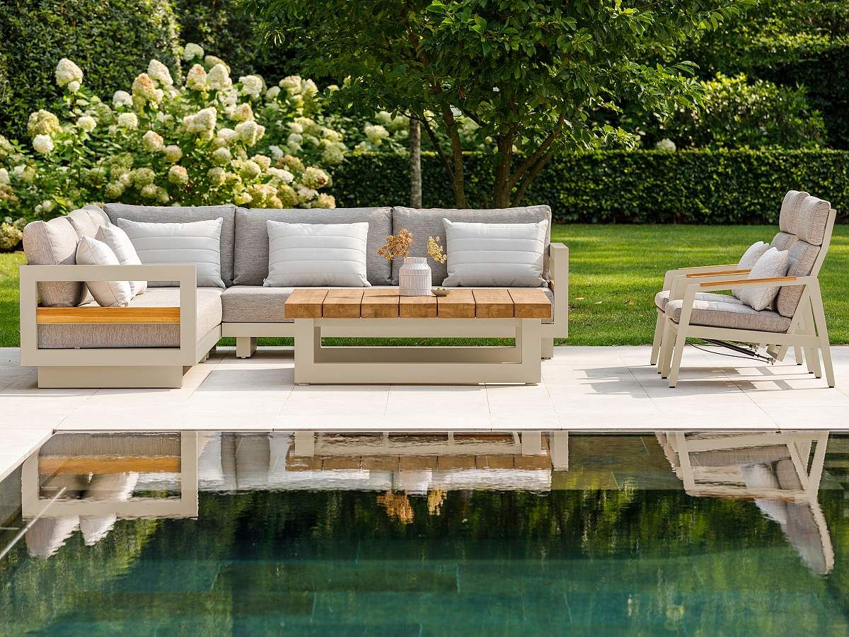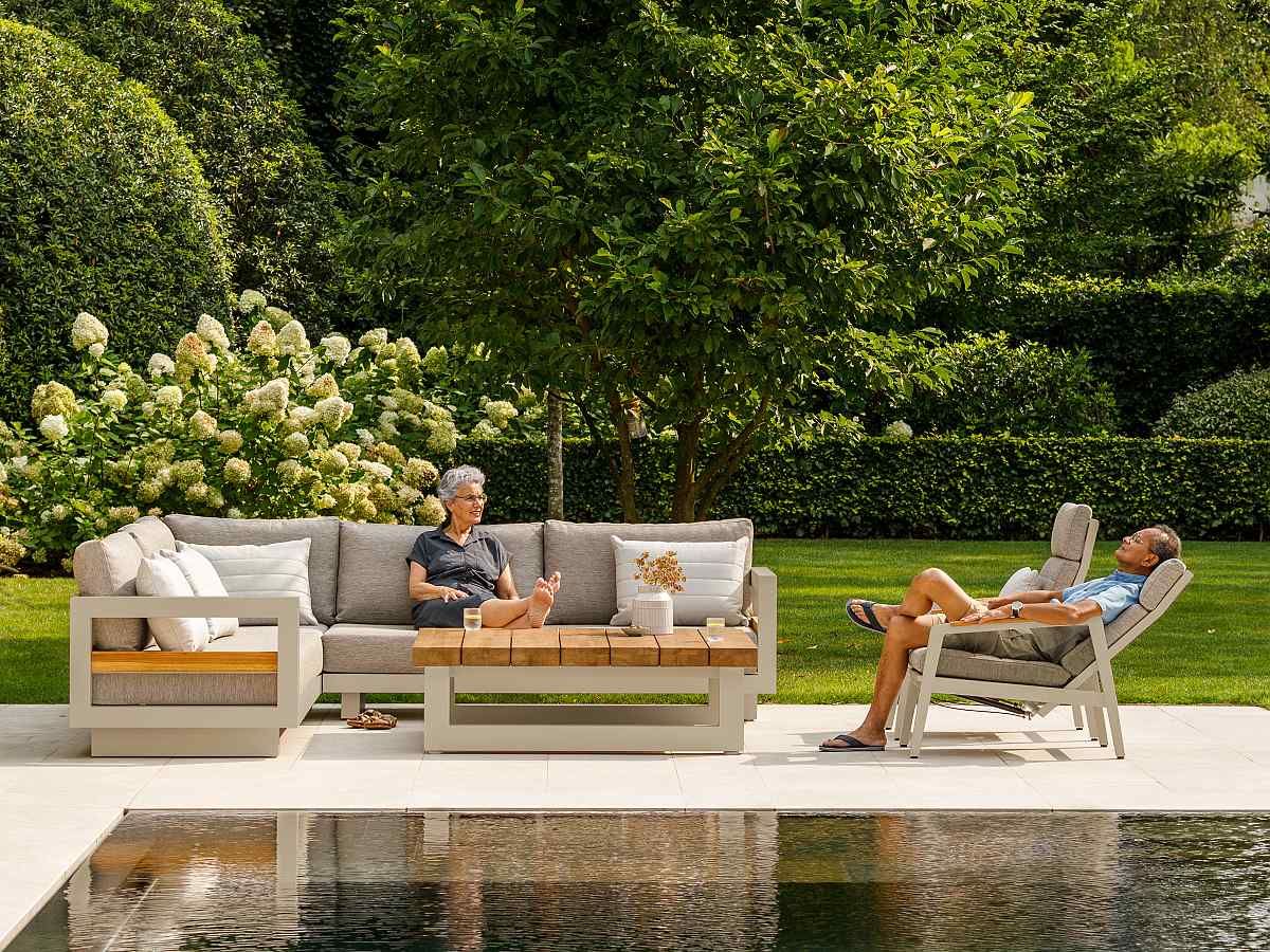 Rohová záhradná sedacia súprava Himalaya bude výraznou dominantou každej terasy. Konštrukcia sedacej súpravy Himalaya je z pevného hliníku vo farbe Beige - je ale dostupná aj antracitovom odtieni Lava. Hliníkový rám elegantne doplňuje masívne prémiové teakové drevo. Podpsedáky a opierkové vankúše vo farbe Beige sú z materiálu All Weather Soltex, vďaka ktorému sa nemusíte obávať žiadneho nepriaznivého počasia a môžu byť umiestnené vonku počas celého roku. Podsedáky a vankúše su dostupné vo viacerých farebných prevedeniach, ktoré Vám vieme na vyžiadanie zaslať.