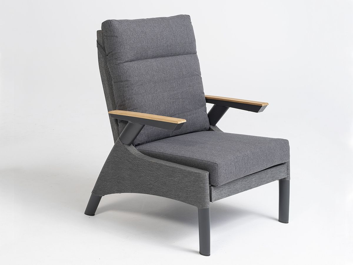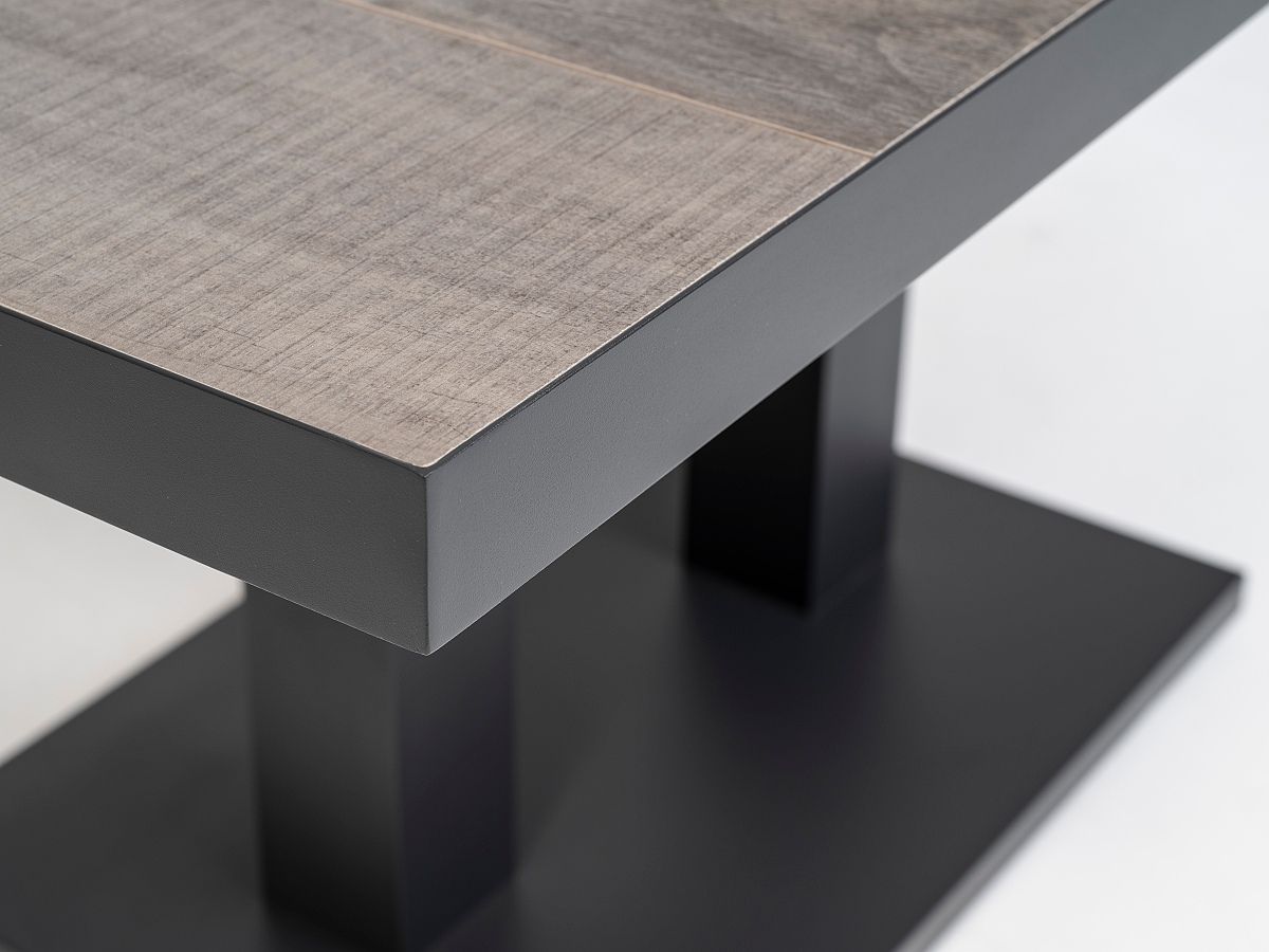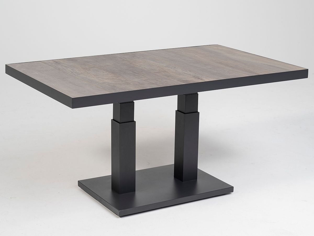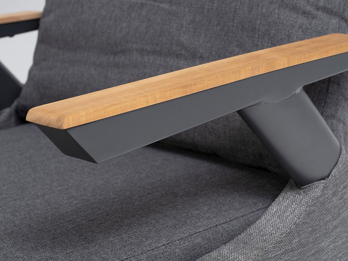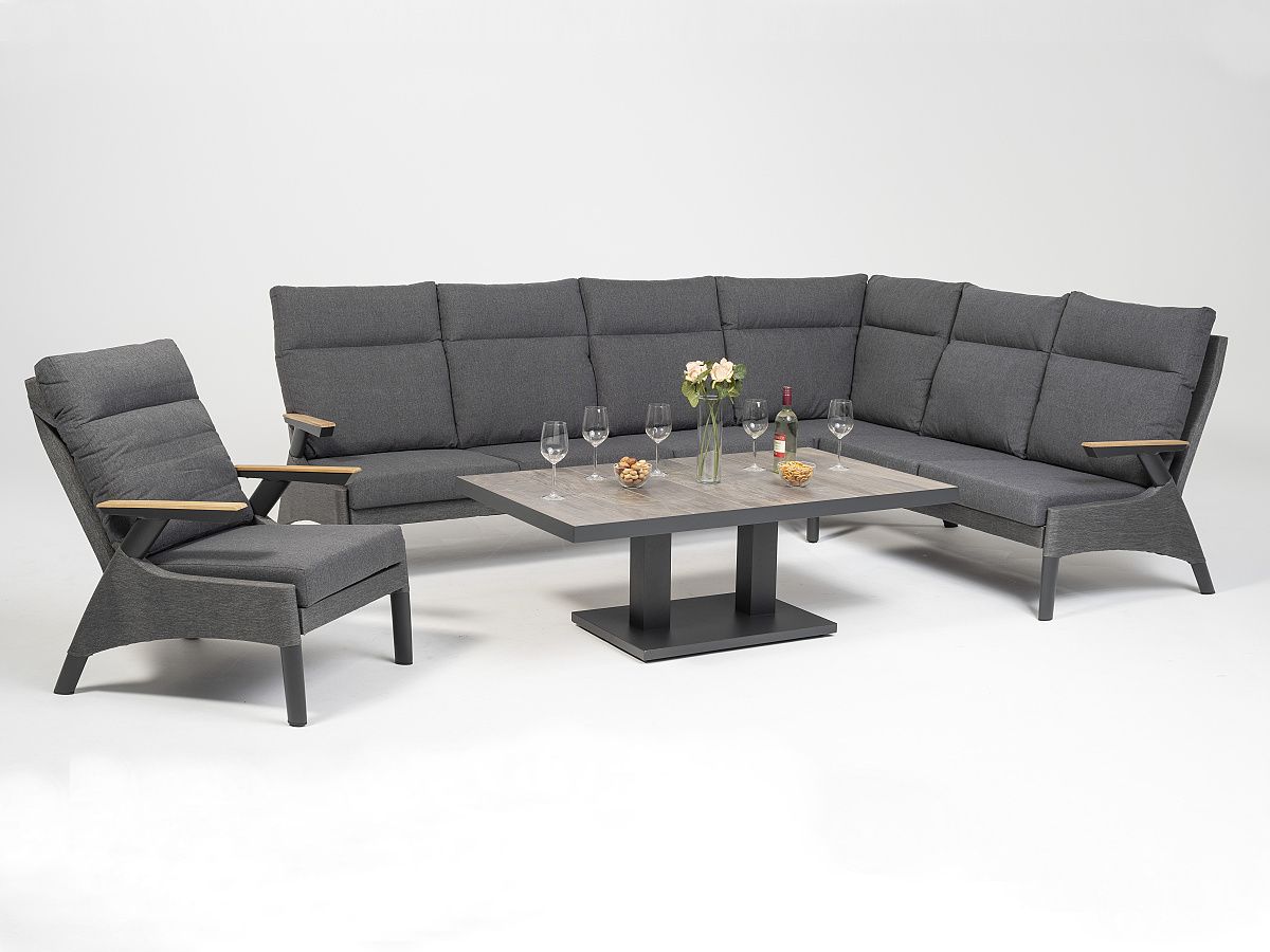 Elegantná a moderná rohová súprava Thassos, ktorá mixom sedacej a stolovej súpravy vďaka výškovo nastaviteľnému stolu. Stôl má hliníkový rám v antracitovej farbe a stolová doska je keramická so vzhľadom bridlicového kameňa. Stôl je výškovo nastavitelný od 52 do 72 cm, takže sa pri zdvihnutom stole môžete najesť. Kreslá Thassos majú tiež hliníkový rám s textilným poťahom, ktorý pôsobí veĺmi elegantna a je zároven pohodlný. Kreslo sa dá jednoducho polohovať vďaka tlačidlu na boku opierky. Vďaka vysokému operadlu bude kreslo veľmi pohodlné aj pre vysokých ľudí.