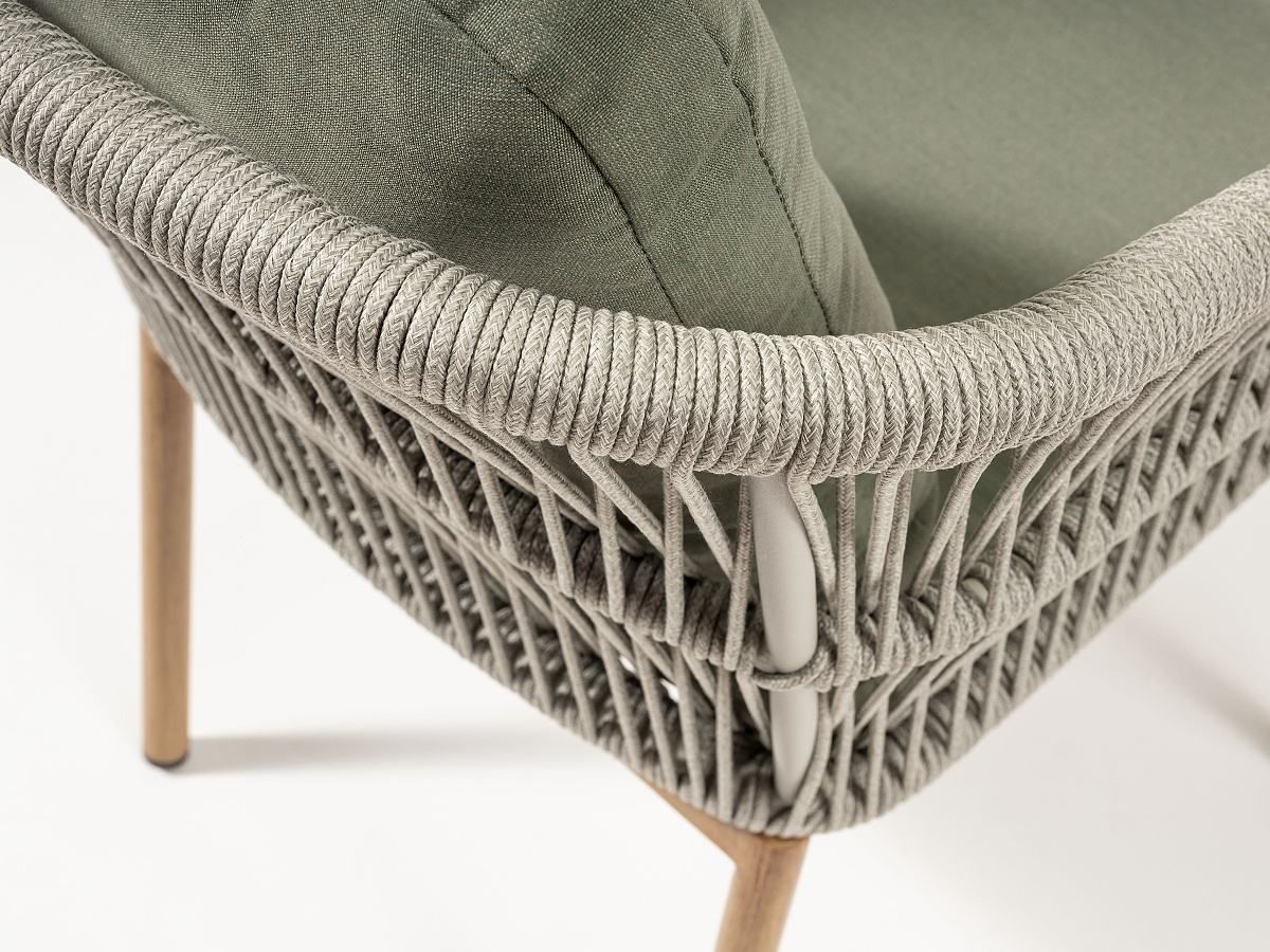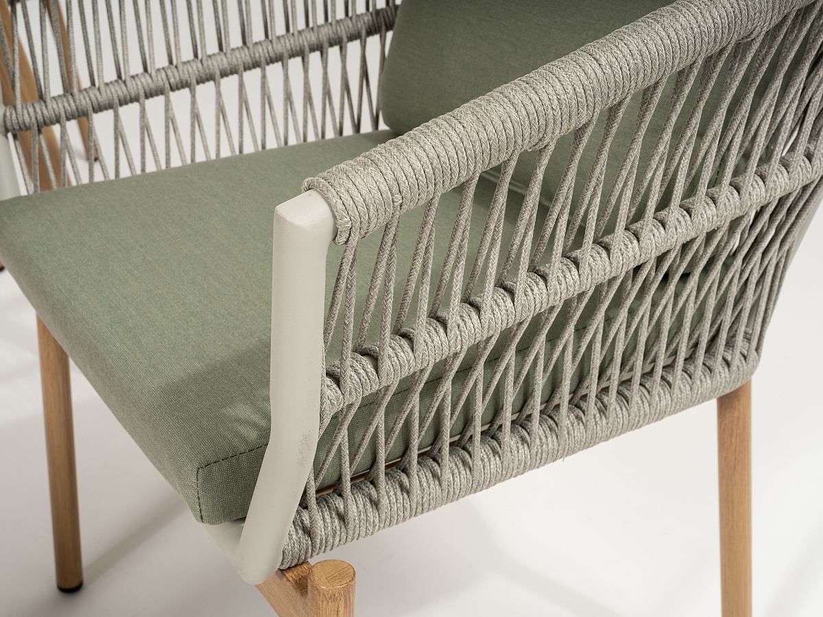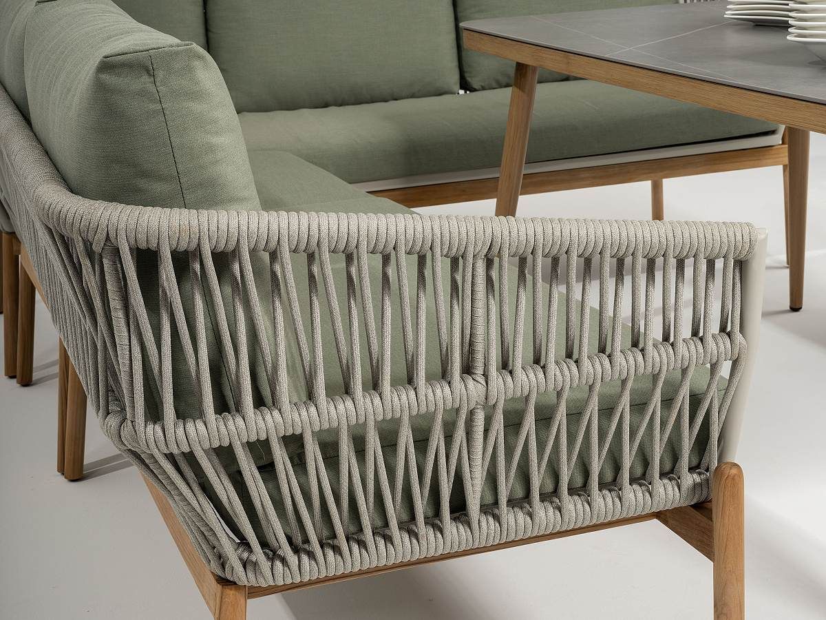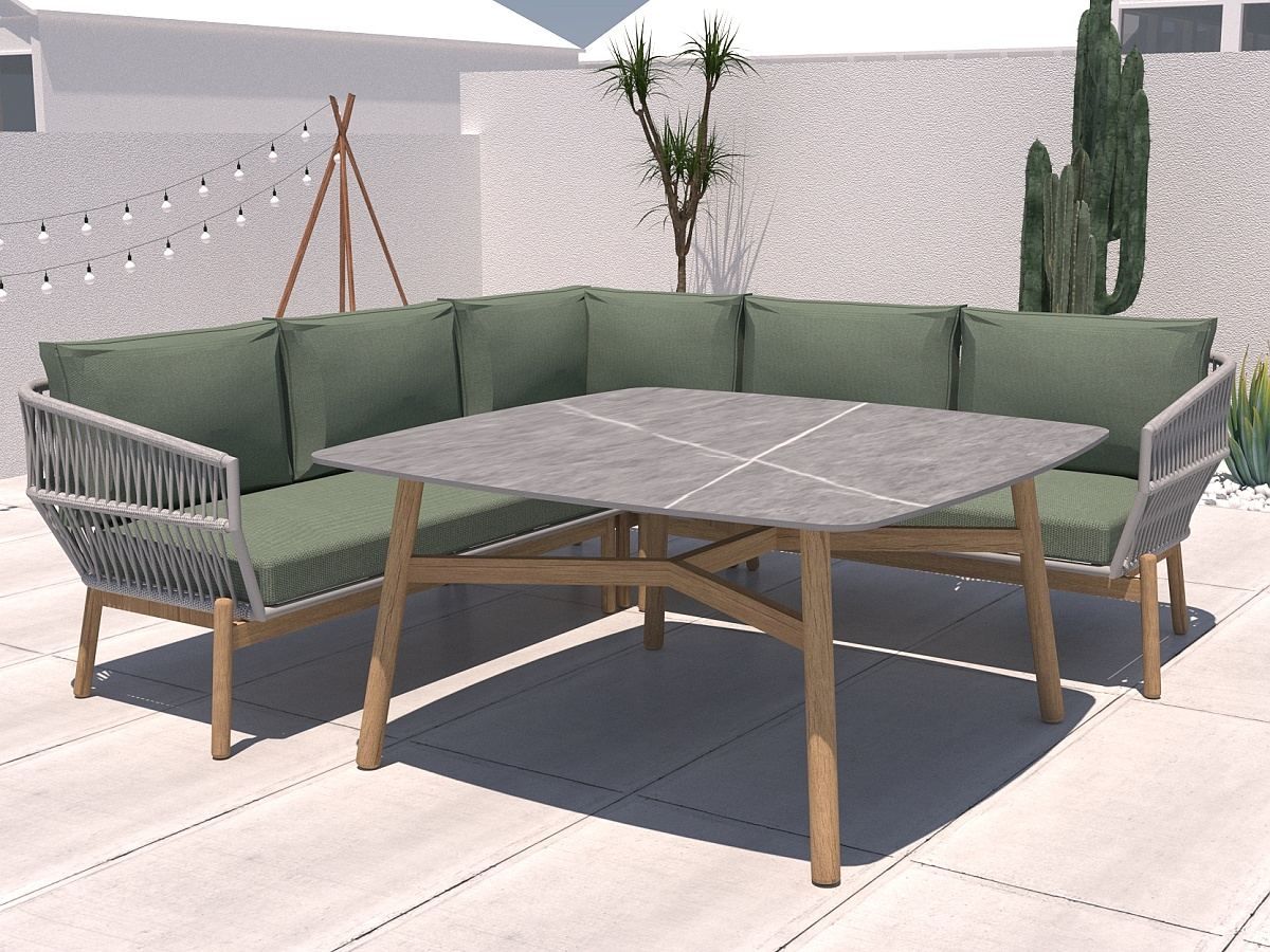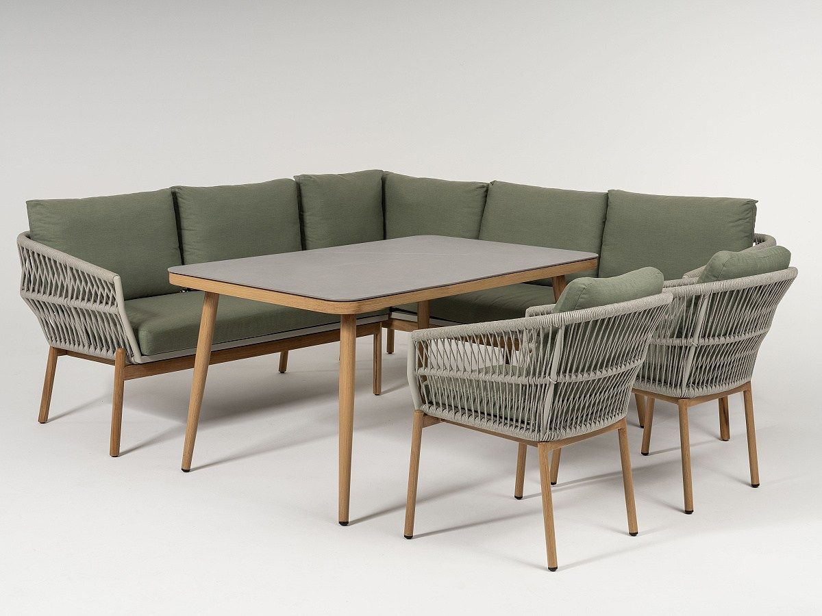 Okúzlujúca a moderná rohová stolová súprava Alicante XL bude dokonalým miestom na letné posedenia s priateľmi či rodinou. Stôl má hliníkový rám striekaný práškovou farbou v drevennom dekore a stolová doska je zo špeciálneho materiálu Sinterstone o hrúbke 6mm (pod vysokým tlakom stlačený kamenný granulát), ktorý imituje svetlosivý mramor. Stolička ma hliníkový rám v drevennom dekore a je ovinutá textilnými svetlosivými šnúrami, ktoré sú odolné voči poveternostným vplyvom. Rohovú lavicu si môžete nastaviť buď aby bola dlhšia strana ľavá alebo pravá, takže táto súprava je perfektne variabilná. Podsedák aj opierkový vankúš sú odolné voči poveternostným vplyvom.