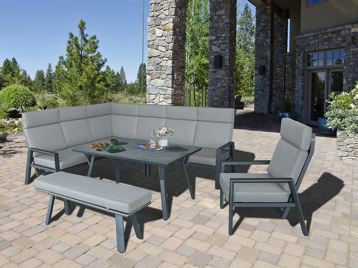 Krásna a praktická rohová stolová súprava Barry bude ideálnou voľbou pre vačšie rodiny, ktoré radi trávia leto na terase. Rohová stolová súprava Barry je natoľko veľkorysá, že sa pohodlne usadí až 10 dospelých ľudí. Konštriukcia všetkých komponentov súpravy je hliníková striekaná práškovou farbou v antracitovej farbe. Podsedáky a opierkové vankúše sú v svetlošedej farbe a sú odolné voči poveternostným vplyvom. Kreslo aj krajná lavica sú polohovatelné. Stolová doska je z tvrdeného skla s ochrannou keramickou vrstvou.