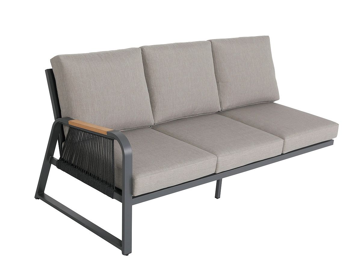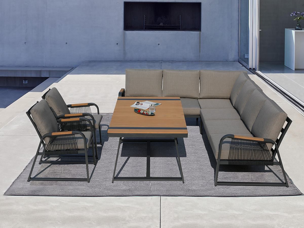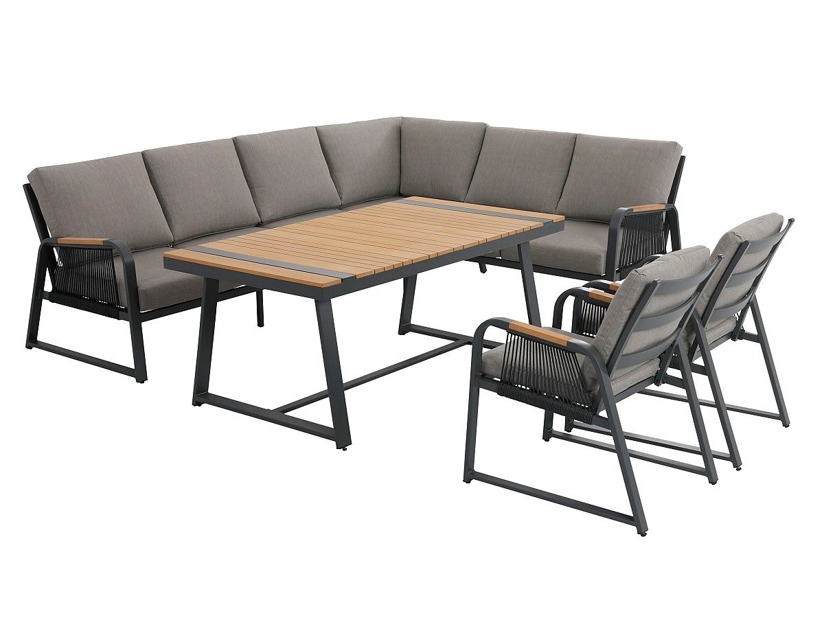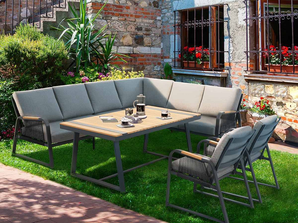 Okúzlujúca a moderná rohová stolová súprava Camilla bude dokonalým miestom na letné posedenia s priateľmi či rodinou. Stôl má hliníkový rám striekaný práškovou farbou v antracitovej farbe a stolová doska má lamely z termodreva. Stolička ma hliníkový rám v rovnakom prevedení ako stôl a je ovinutá čiernymi textilnými šnúrami, ktoré sú odolné voči poveternostným vplyvom. Operadlo na stoličkách aj rohovej lavici sú tiež z termodreva. Rohovú lavicu si môžete nastaviť buď aby bola dlhšia strana ľavá alebo pravá, takže táto súprava je perfektne variabilná. Podsedáky aj opierkové vankúše sú odolné voči poveternostným vplyvom.