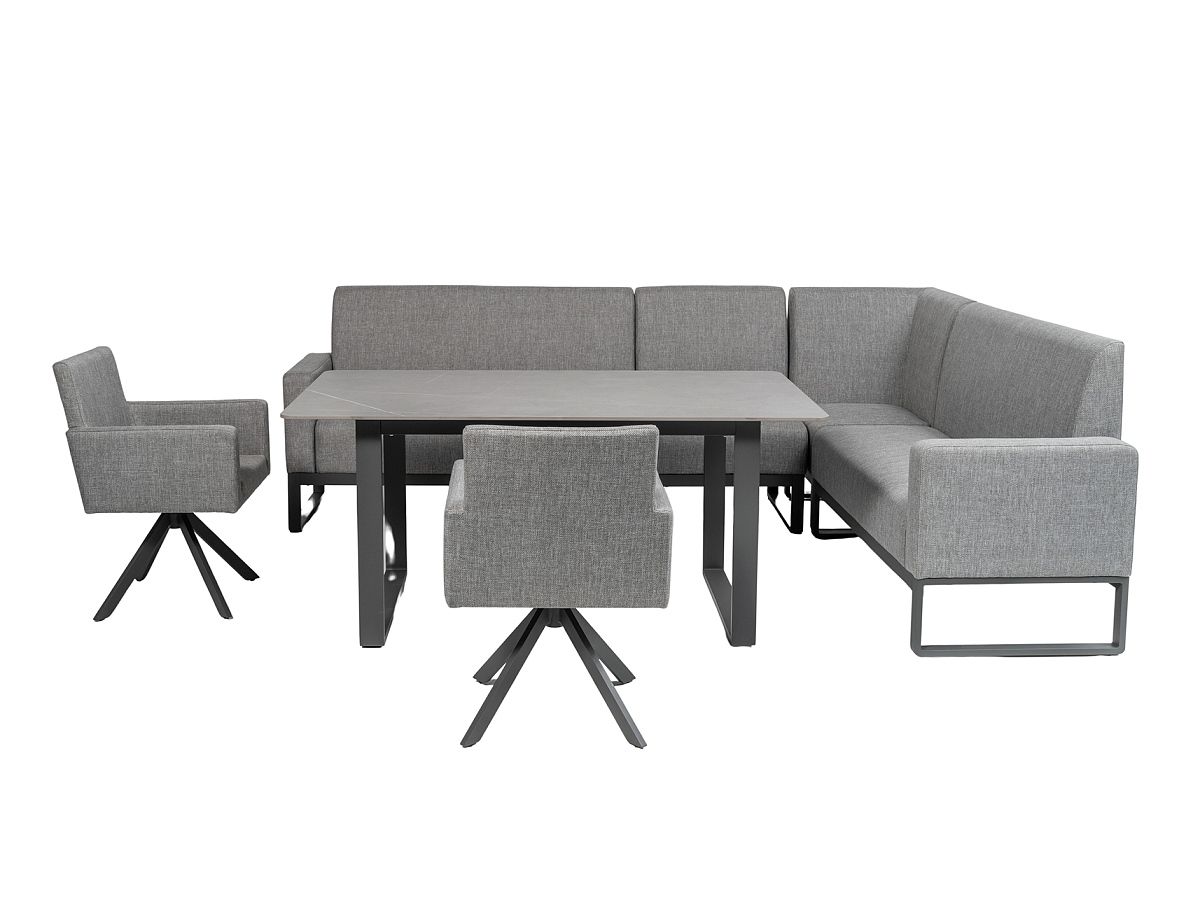 Elegantná a moderná rohová stolová súprava Carina je ideálnou voľbou ak chcete na terase presedieť veľa času. Stôl má hliníkový rám v antracitovej farbe a stolová doska je z materiálu Sinterstone (umelý kameň) v sivej farbe Armani Grey a je nenáročná na údržbu. Kreslá aj rohová lavica majú hliníkový rám v antracitovej farbe, sú potiahnuté špeciálnou outdoorovou tkaninou, ktorá je odolný voči poveternostným vplyvom. Kreslá sú otočné o 360° stupňov. Sedaciu súpravu môžete jednoducho nastaviť na ľavú alebo pravú stranu vďaka oddelitelnej stredovej časti. Rohová stolová súprava Carina je dostupná v dvoch farebných prevedeniach - Grau a Natur.