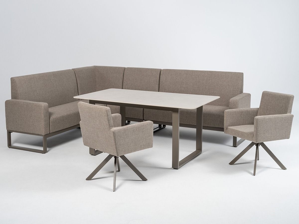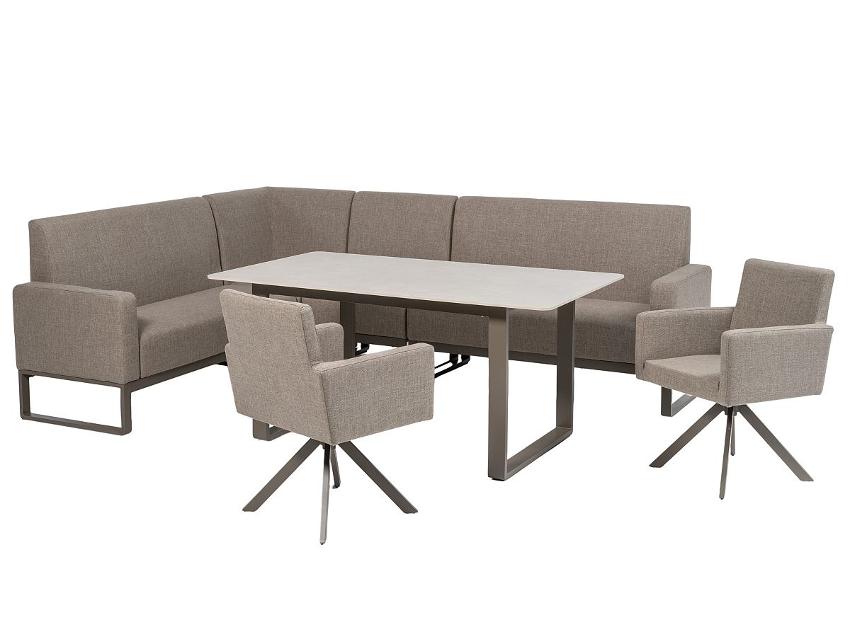 Elegantná a moderná rohová stolová súprava Carina Natur je ideálnou voľbou ak chcete na terase presedieť veľa času. Stôl má hliníkový rám v hnedej farbe a stolová doska je z materiálu Sinterstone (umelý kameň) v sivej farbe Carmen Light Grey a je nenáročná na údržbu. Kreslá aj rohová lavica majú hliníkový rám v hnedej farbe, sú potiahnuté špeciálnou outdoorovou tkaninou, ktorá je odolný voči poveternostným vplyvom. Kreslá sú otočné o 360° stupňov. Sedaciu súpravu môžete jednoducho nastaviť na ľavú alebo pravú stranu vďaka oddelitelnej stredovej časti. Rohová stolová súprava Carina je dostupná v dvoch farebných prevedeniach - Natur a Grau