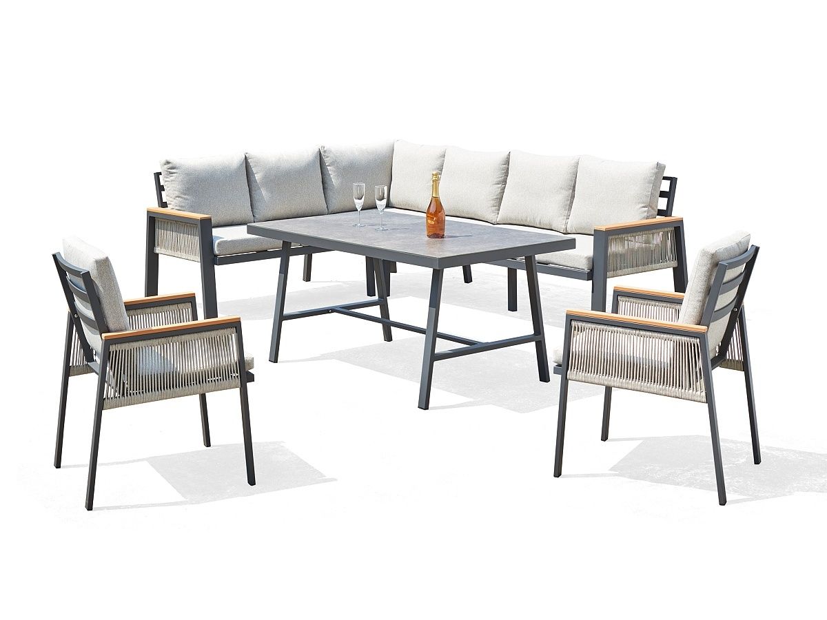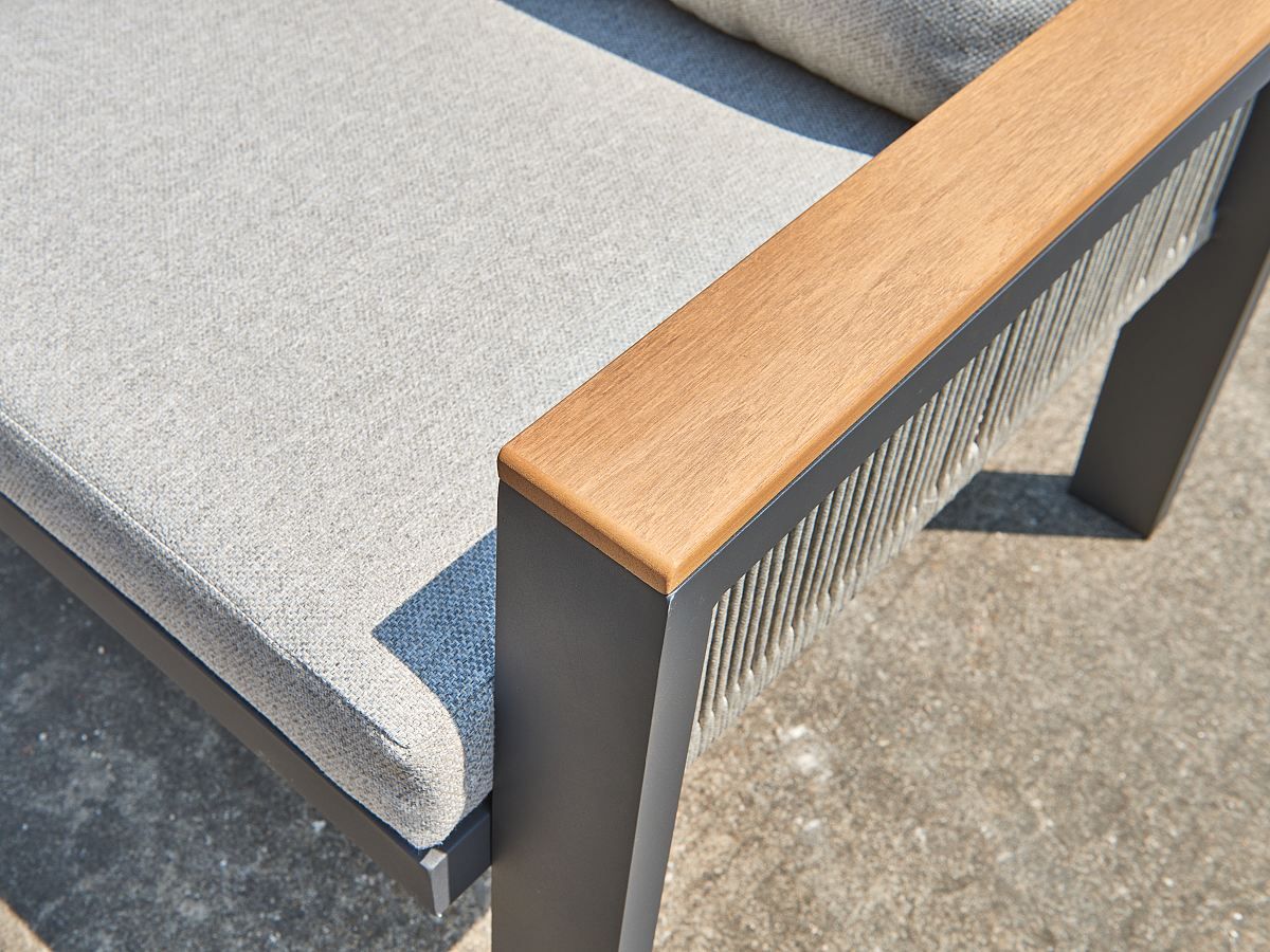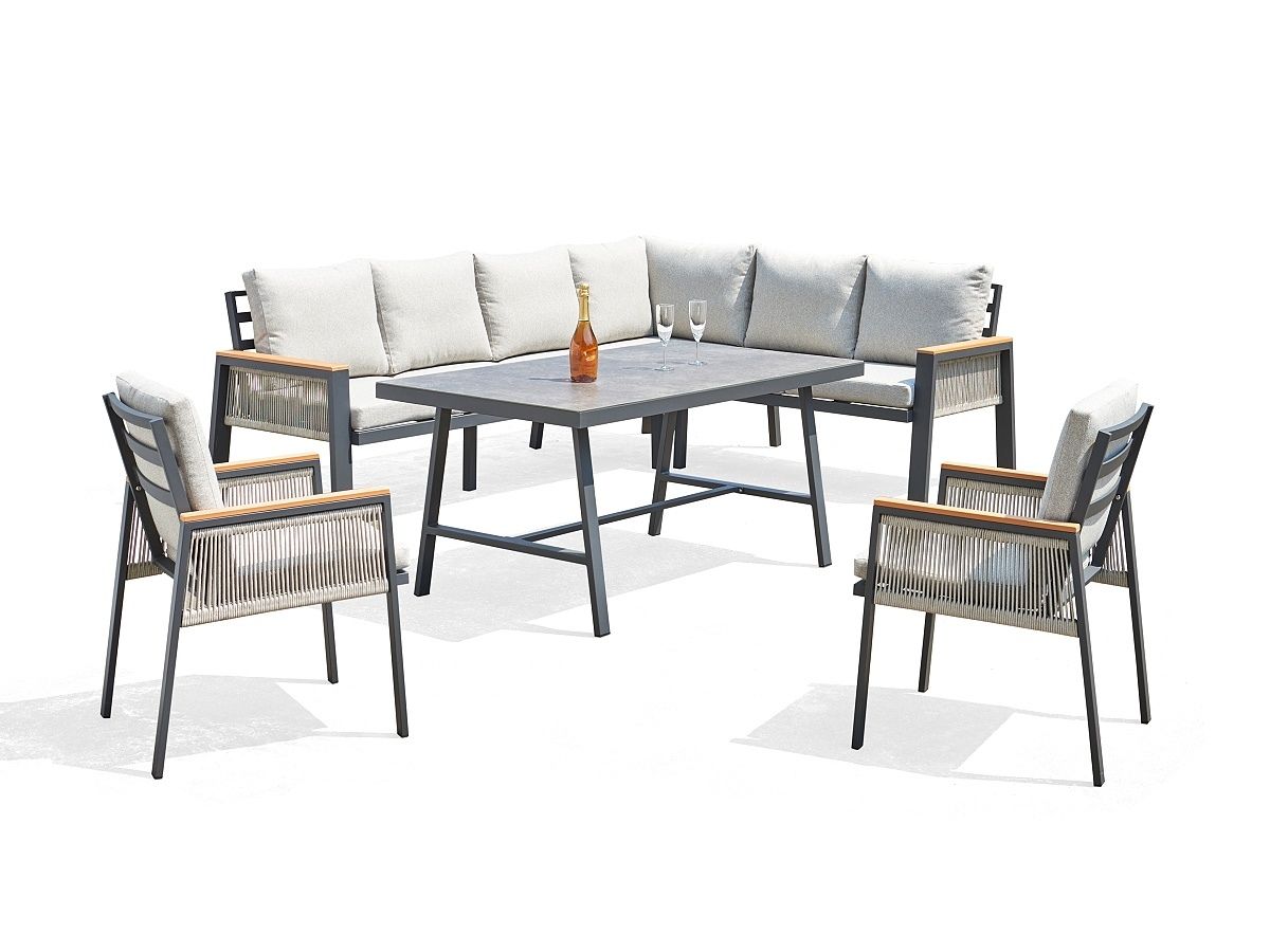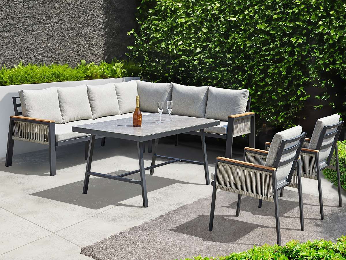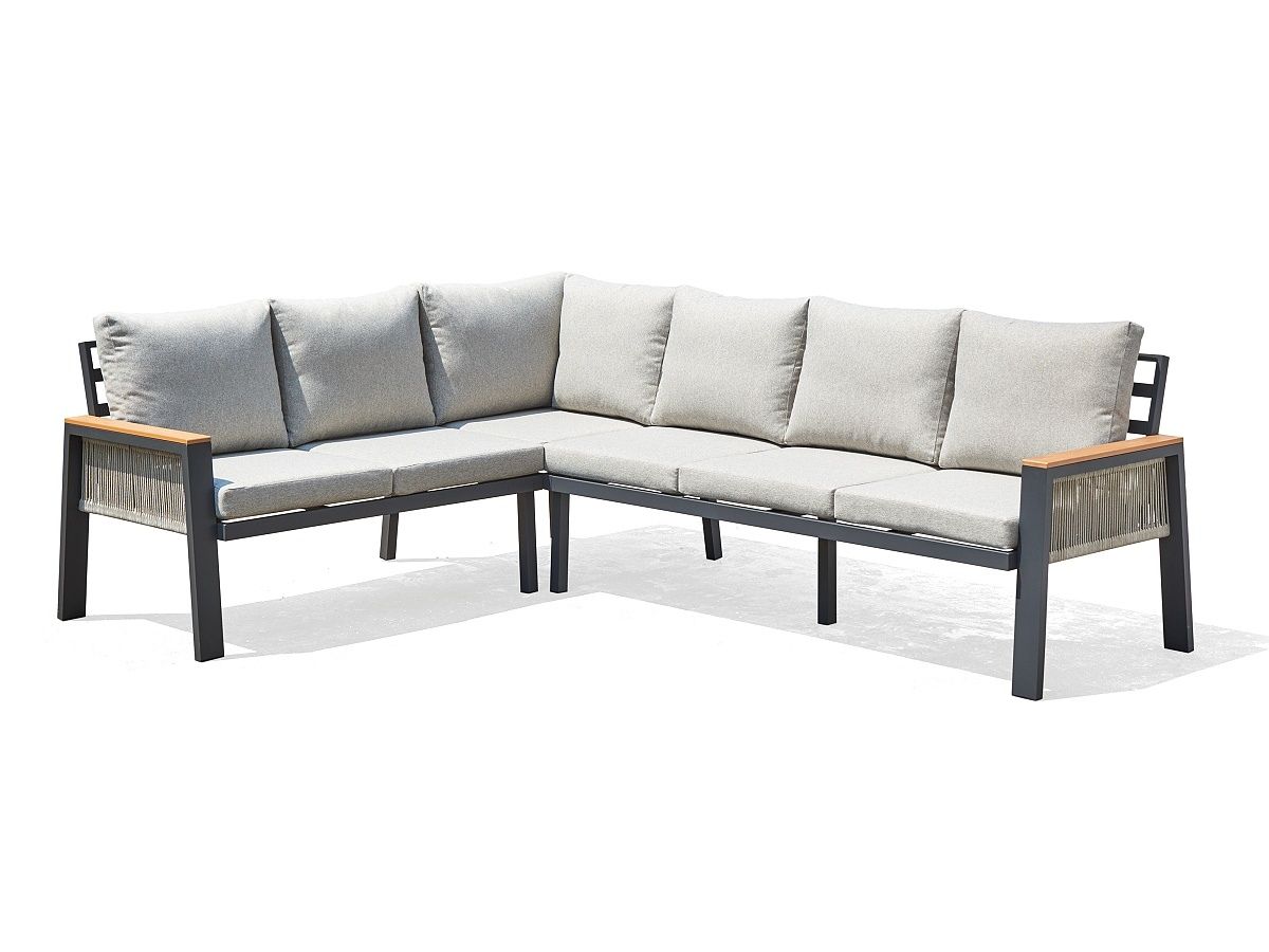 Moderná a vzdušná rohová stolová súprava Catania je ideálnym prepojením stolovej a sedacej súpravy. Tento typ rohovej stolovej súpravy bude dokonalým miestom na letné posedenia s priateľmi či rodinou. Stôl má hliníkový rám striekaný práškovou farbou v antracitovej farbe a stolová dosk je z tvrdeného skla s ochrannou keramickou vrstvou v tmavosivom kamennom vzhľade. Stolička ma hliníkový rám v rovnakom prevedení ako stôl a je ovinutá svetlosivými rýchloschnúcimi textilnými šnúrami, ktoré sú odolné voči poveternostným vplyvom. Operadlo na stoličkách aj rohovej lavici sú z polywoodu v imitácii teakového dreva. Podsedáky aj opierkové vankúše sú odolné voči poveternostným vplyvom.