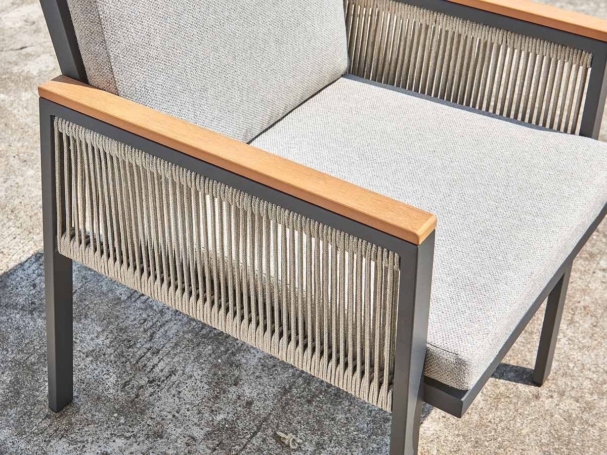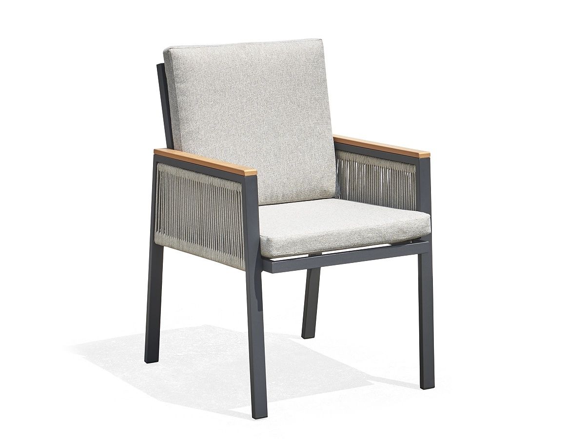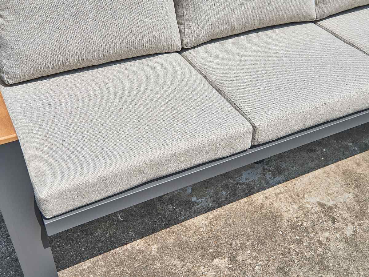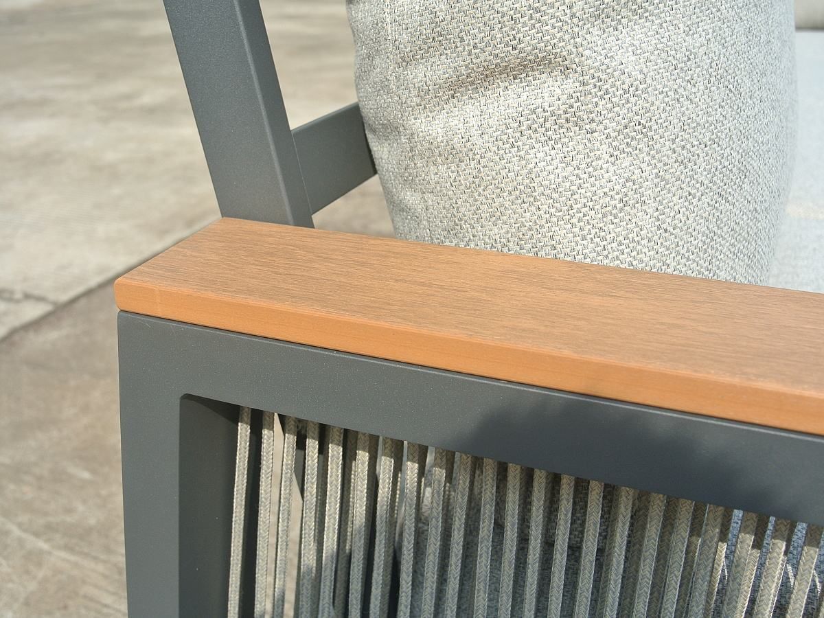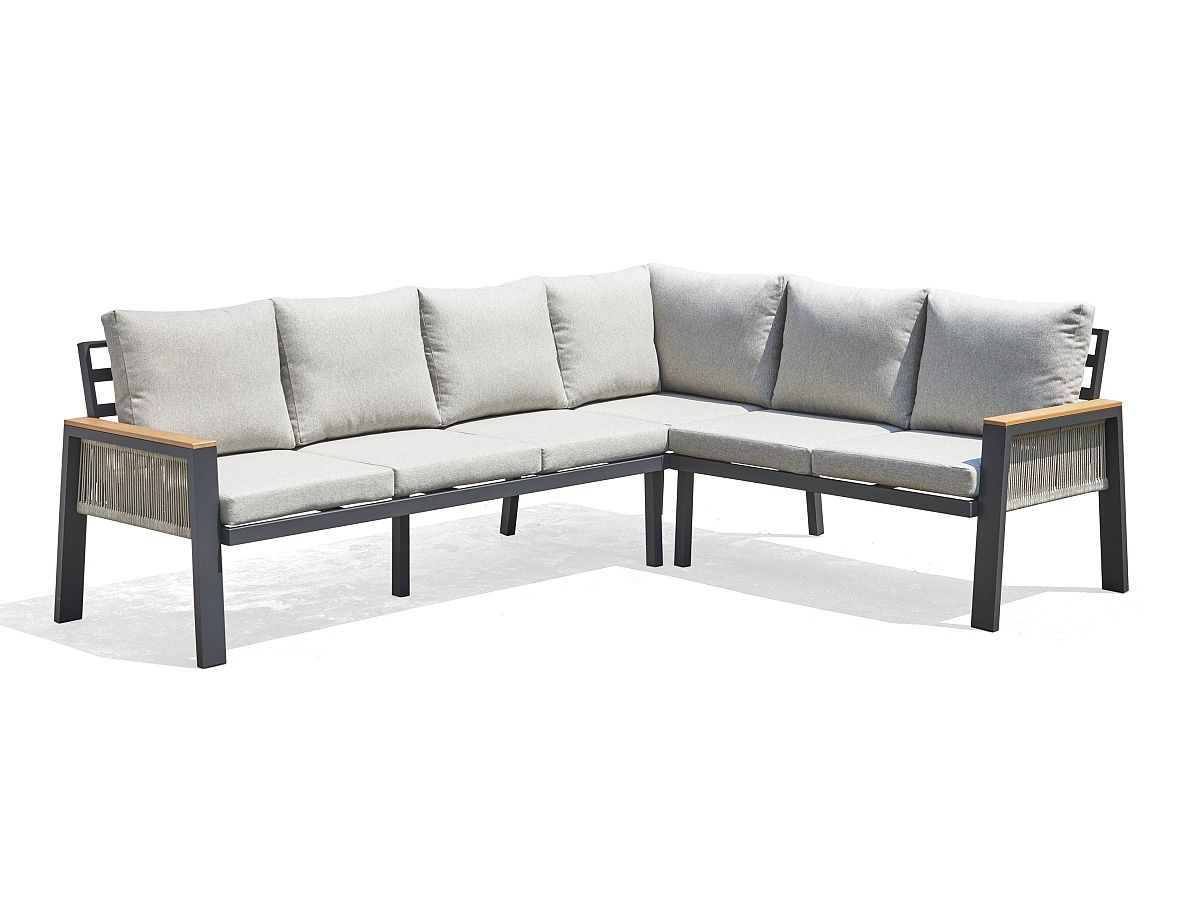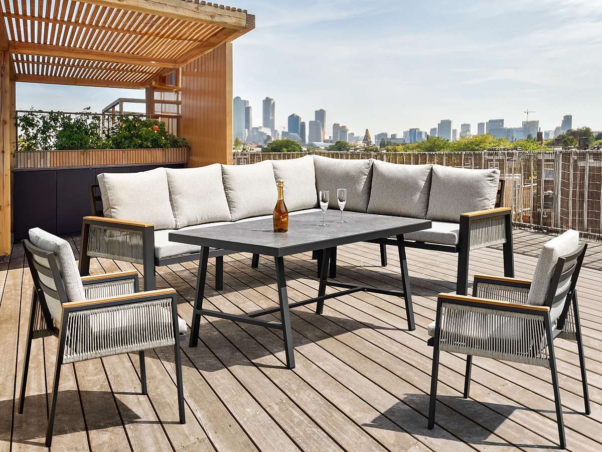 Moderná a vzdušná rohová stolová súprava Catania je ideálnym prepojením stolovej a sedacej súpravy. Tento typ rohovej stolovej súpravy bude dokonalým miestom na letné posedenia s priateľmi či rodinou. Stôl má hliníkový rám striekaný práškovou farbou v antracitovej farbe a stolová dosk je z tvrdeného skla s ochrannou keramickou vrstvou v tmavosivom kamennom vzhľade. Stolička ma hliníkový rám v rovnakom prevedení ako stôl a je ovinutá svetlosivými rýchloschnúcimi textilnými šnúrami, ktoré sú odolné voči poveternostným vplyvom. Operadlo na stoličkách aj rohovej lavici sú z polywoodu v imitácii teakového dreva. Podsedáky aj opierkové vankúše sú odolné voči poveternostným vplyvom.