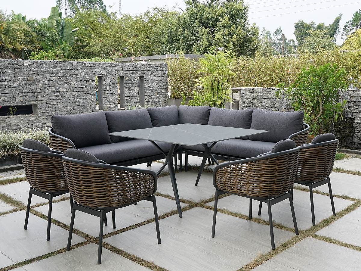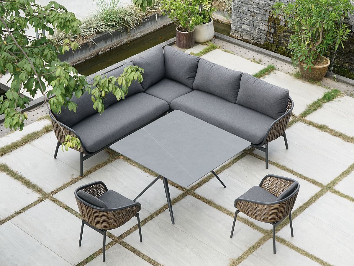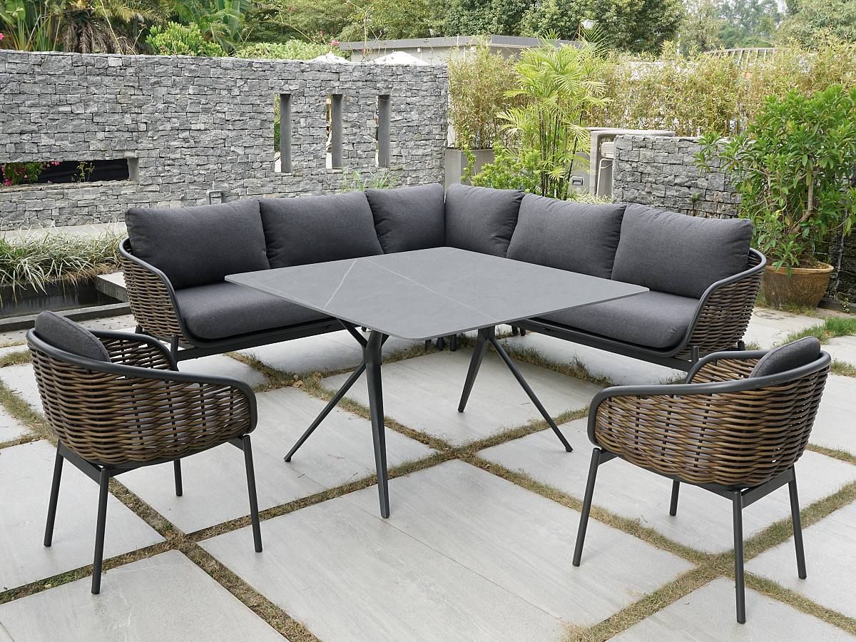 Nádherná a elegantná rohová stolová súprava Claire bude dokonalým miestom na letné posedenia s priateľmi či rodinou. Vďaka svojej veľkosti a pohodlnosti môžete usporiadať záhradnú párty a všetkých hostí pohodlne usadíte. Stôl má hliníkový rám v antracitovej farbe a stolová doska je zp špeciálneho materiálu Sinterstone, ktorý je odolný a praktický na údržbu.. Stolička Claire má hliníkový rám v antracitovej farbe a výplet stoličky je z hrubého dutého ratanu v hnedej naturálnej farbe. V prípade záujmu je možné dokúpiť stoličky Claire navyše.