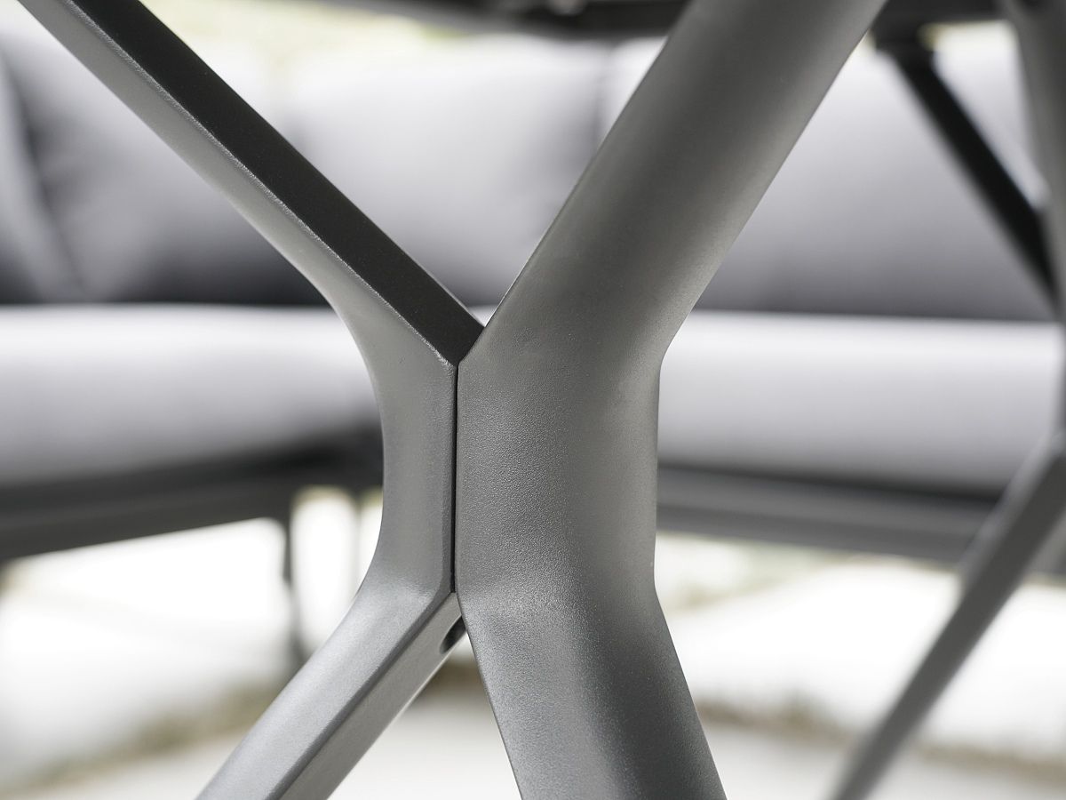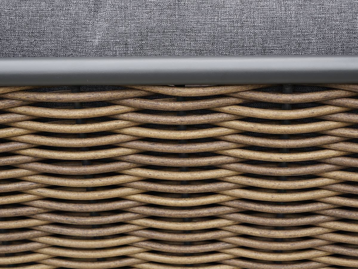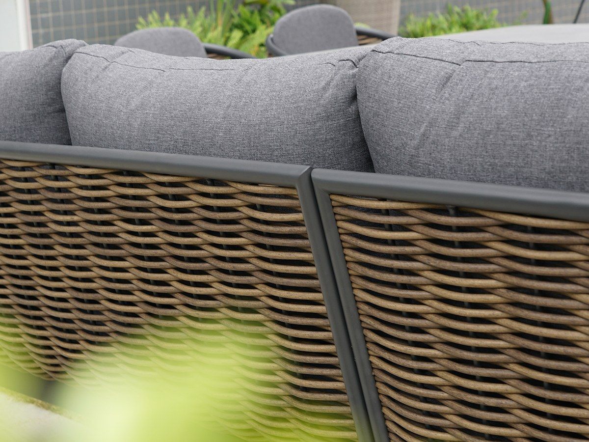 Nádherná a elegantná rohová stolová súprava Claire bude dokonalým miestom na letné posedenia s priateľmi či rodinou. Vďaka svojej veľkosti a pohodlnosti môžete usporiadať záhradnú párty a všetkých hostí pohodlne usadíte. Stôl má hliníkový rám v antracitovej farbe a stolová doska je zp špeciálneho materiálu Sinterstone, ktorý je odolný a praktický na údržbu.. Stolička Claire má hliníkový rám v antracitovej farbe a výplet stoličky je z hrubého dutého ratanu v hnedej naturálnej farbe. V prípade záujmu je možné dokúpiť stoličky Claire navyše.