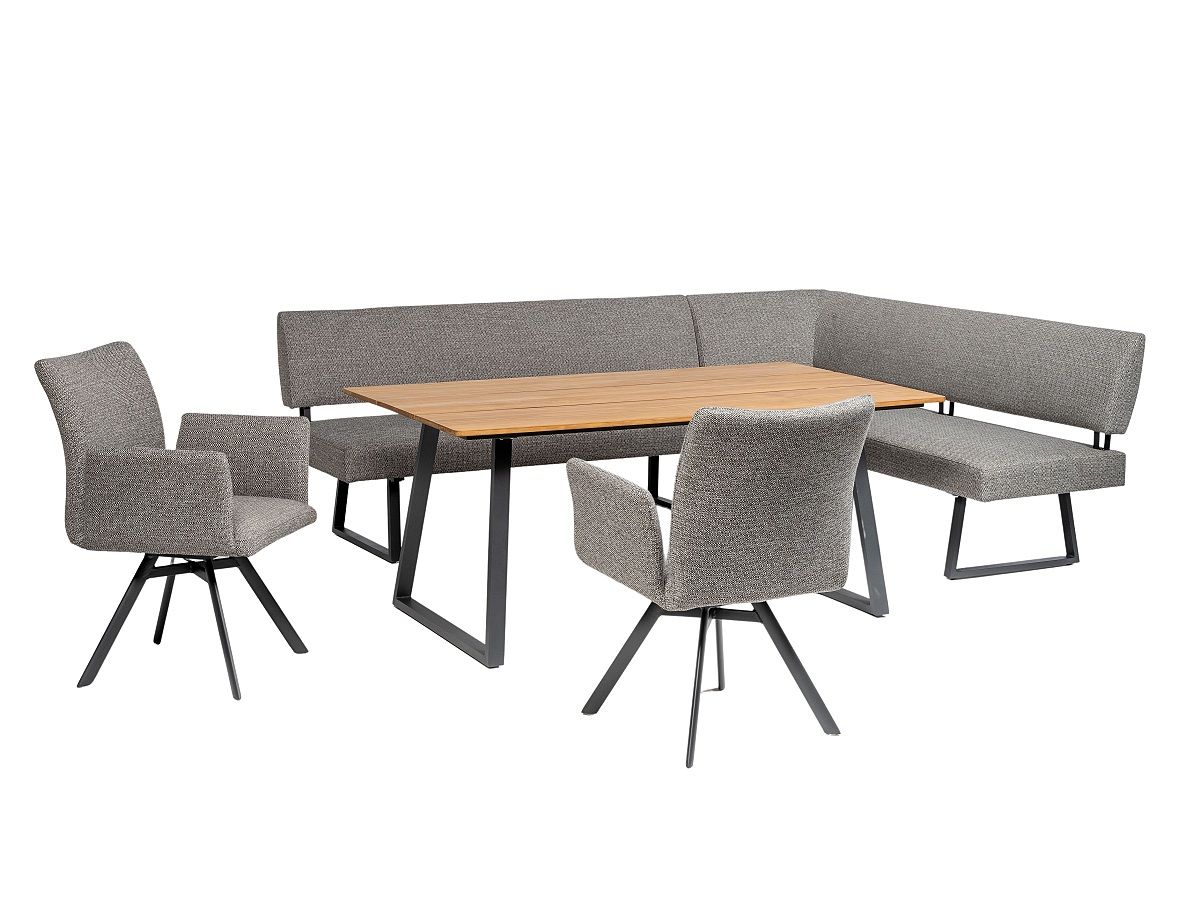 Štýlová a moderná rohová stolová súprava Ibiza Corner je moderným prevedením záhradného nábytku. Rohová stolová súprava Ibiza vďaka svojmu vzhľadu vo vás evokuje interiérovú súpravu ale materiálovo je vhodná na celoročné použitie vonku. Stôl má hliníkový rám v antracitovej farbe a stolová doska je z naolejovaného borovicového dreva. Kreslá aj rohová lavica majú hliníkový rám v antracitovej farbe, sú potiahnuté špeciálnou vodeodolnou outdoorovou tkaninou v šedej farbe. Kreslá majú otočnú funkciu. Rohová stolová súpravu Ibiza Corner je dostupná v pravom aj ľavom prevedení.