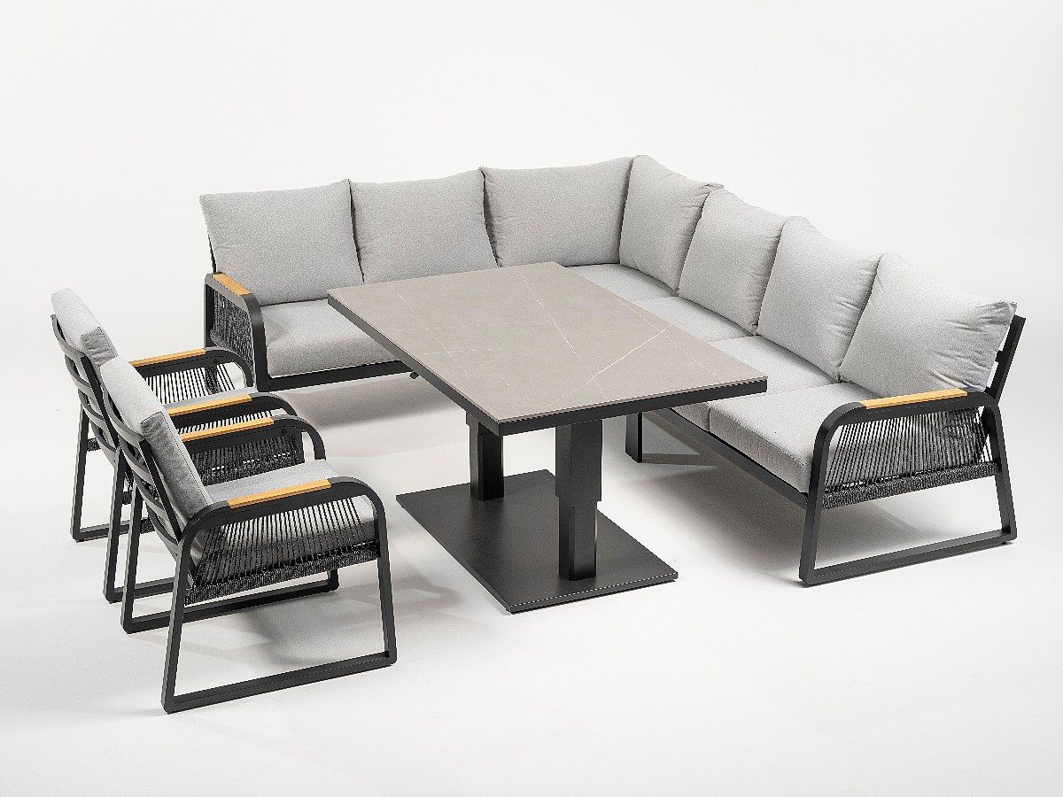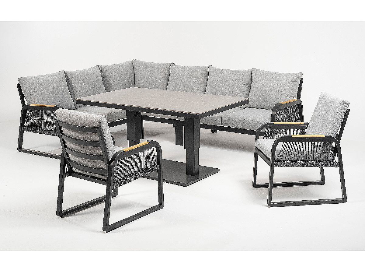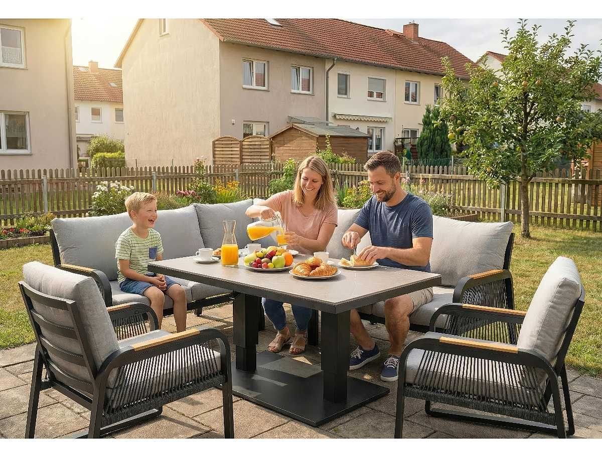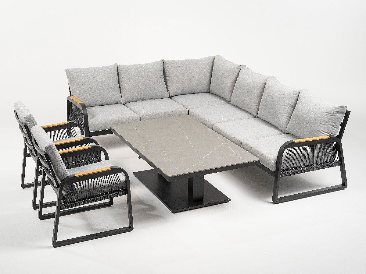 Súprava Limnos je stelesnením nadčasovej elegancie, ktorá v sebe spája industriálny štýl s maximálnym užívateľským komfortom. Vďaka antracitovému hliníkovému rámu a detailom v podobe moderného šnúrového výpletu (Rope-Optik) pôsobí súprava v priestore veľmi čisto a sofistikovane. Srdcom súpravy je stôl s vysoko odolnou doskou zo Sinterstone, ktorý v kombinácii s funkciou výškového nastavenia umožňuje plynulý prechod od relaxačného „lounge“ posedenia až po plnohodnotné stolovanie. Je to ideálne riešenie pre náročných klientov, ktorí hľadajú trvácnosť a estetický dizajn na svoje terasy či strešné záhrady.