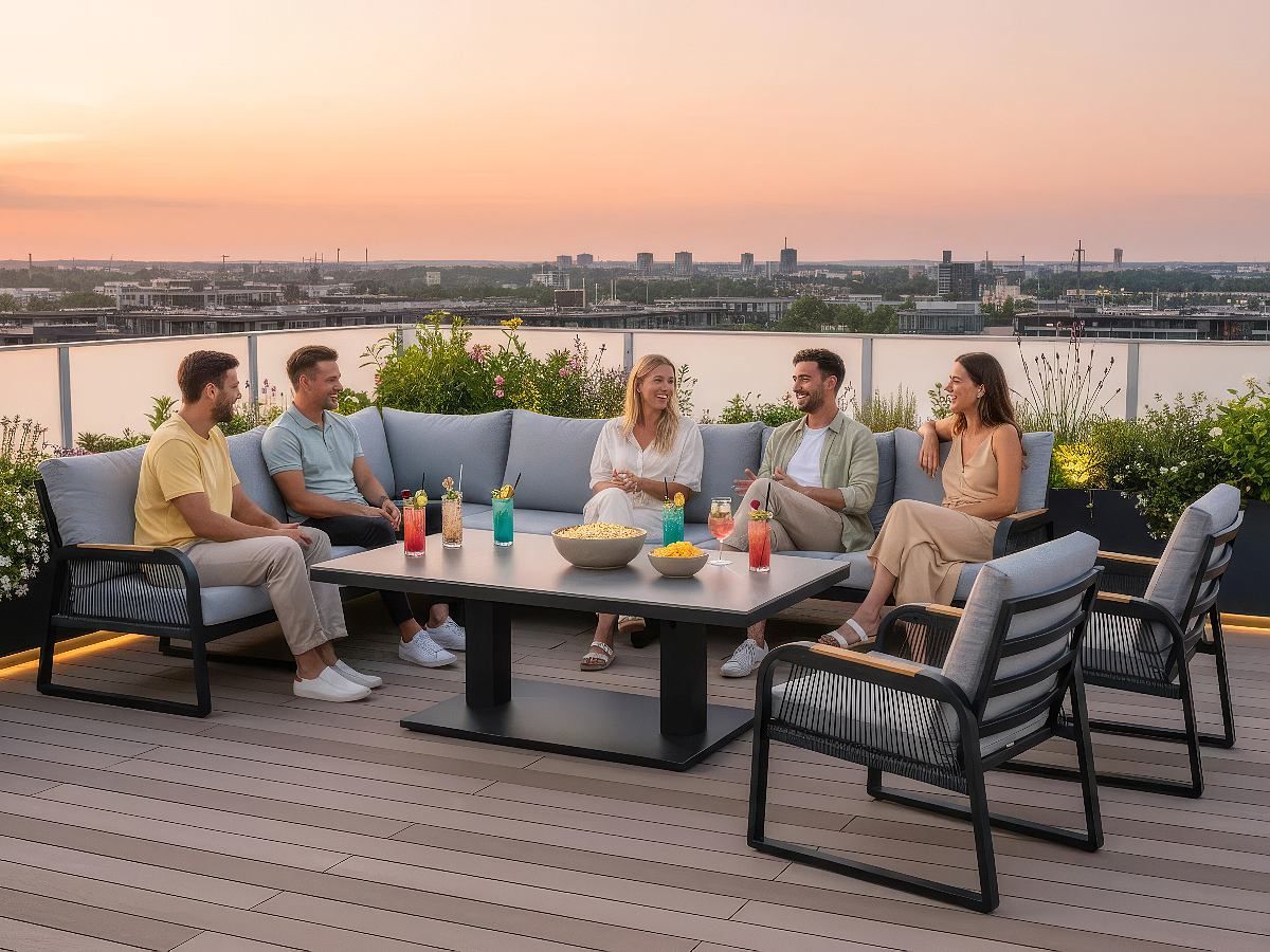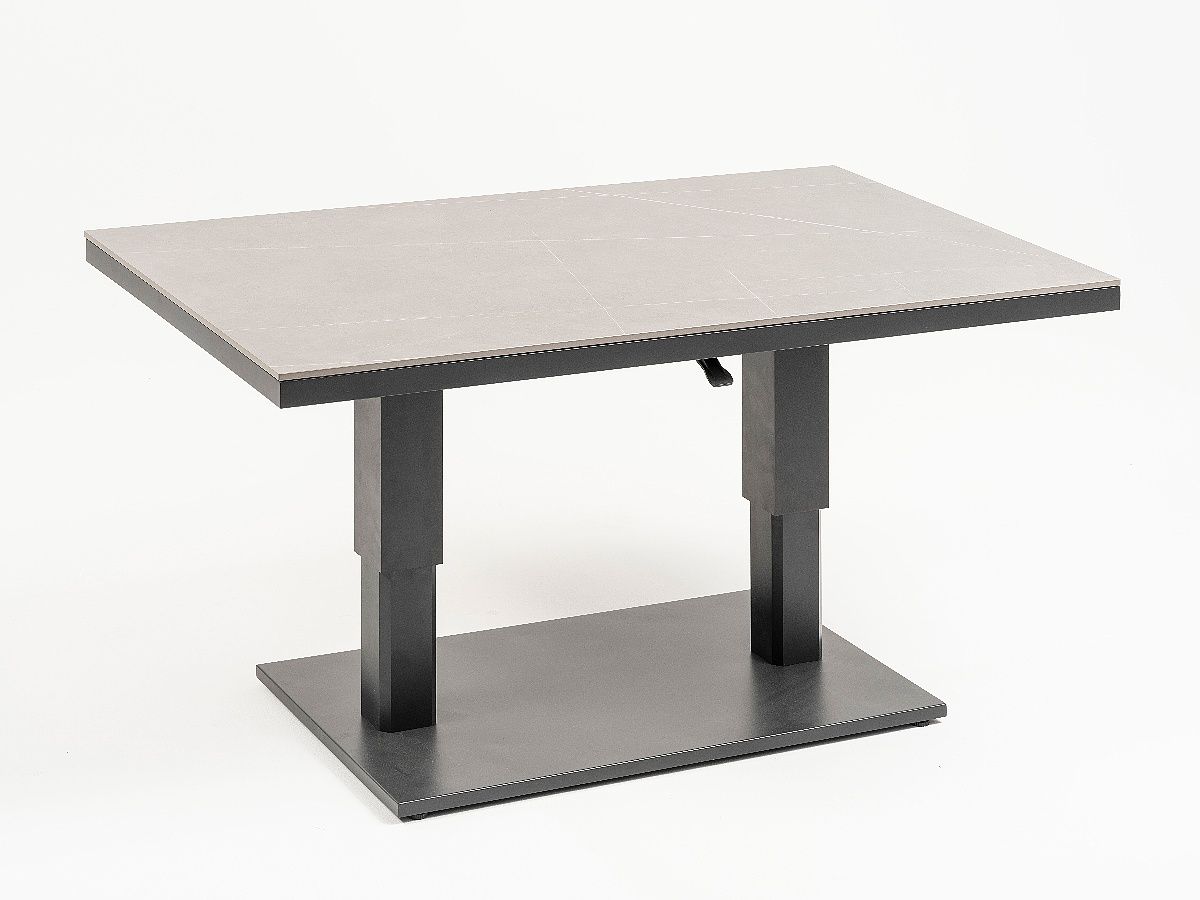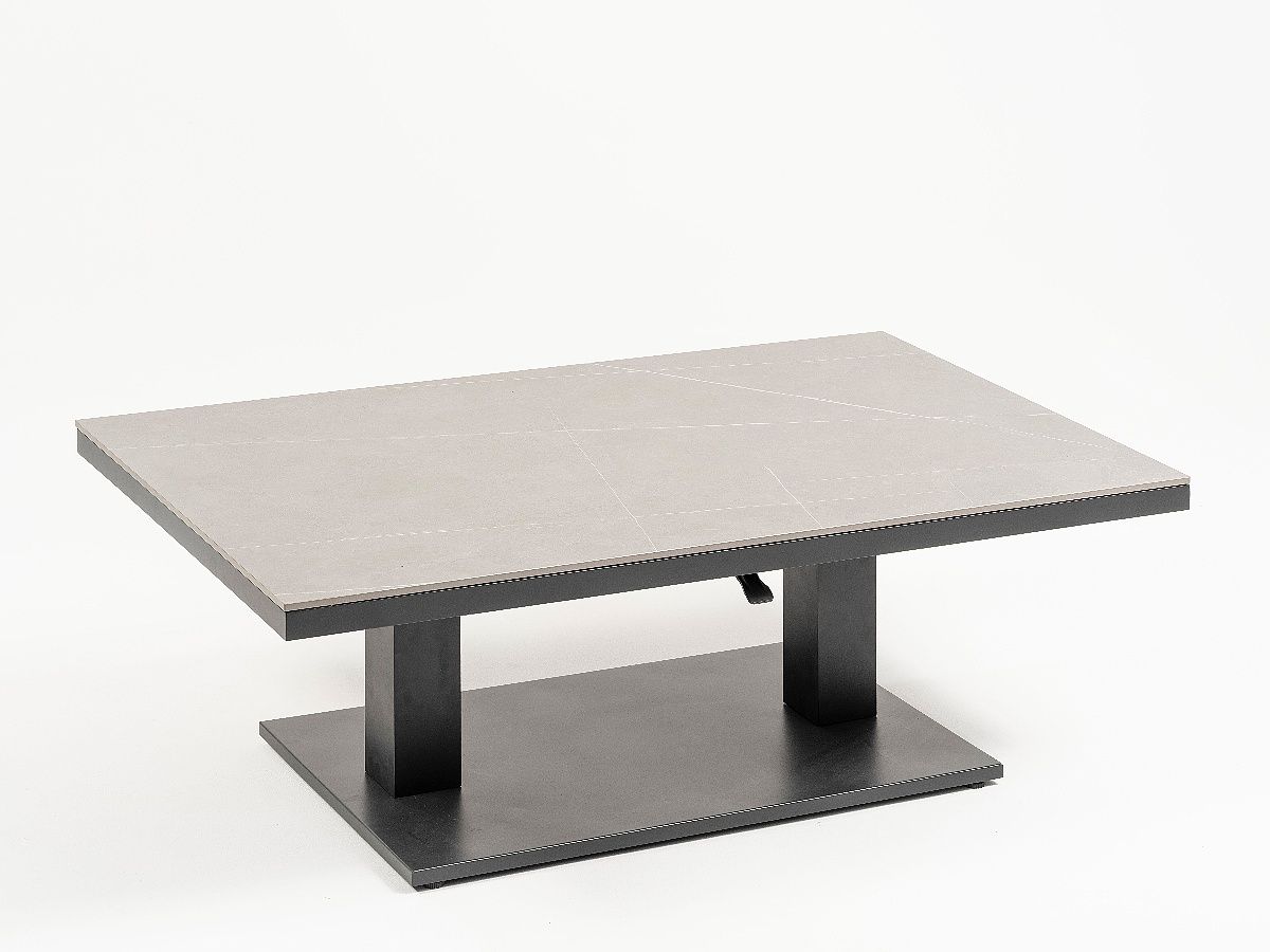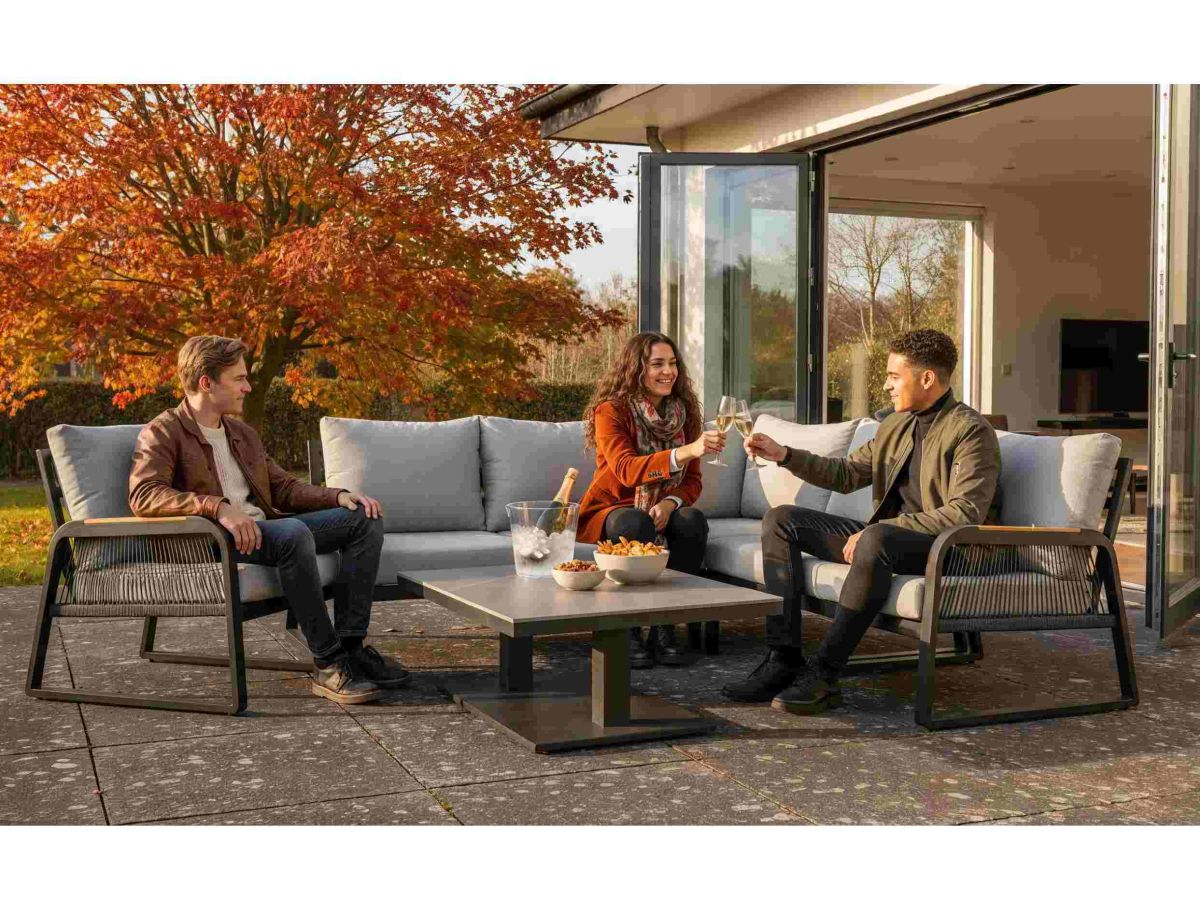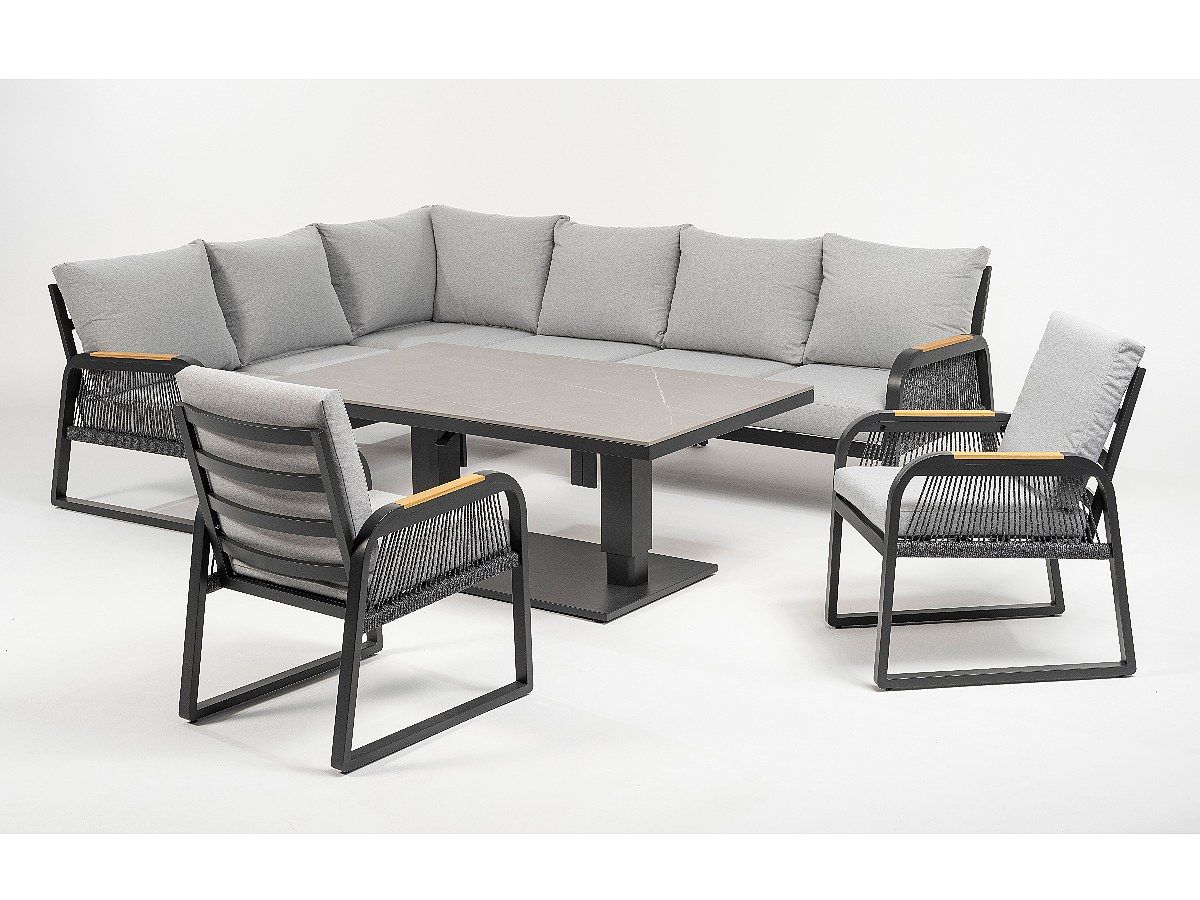 Súprava Limnos je stelesnením nadčasovej elegancie, ktorá v sebe spája industriálny štýl s maximálnym užívateľským komfortom. Vďaka antracitovému hliníkovému rámu a detailom v podobe moderného šnúrového výpletu (Rope-Optik) pôsobí súprava v priestore veľmi čisto a sofistikovane. Srdcom súpravy je stôl s vysoko odolnou doskou zo Sinterstone, ktorý v kombinácii s funkciou výškového nastavenia umožňuje plynulý prechod od relaxačného „lounge“ posedenia až po plnohodnotné stolovanie. Je to ideálne riešenie pre náročných klientov, ktorí hľadajú trvácnosť a estetický dizajn na svoje terasy či strešné záhrady.