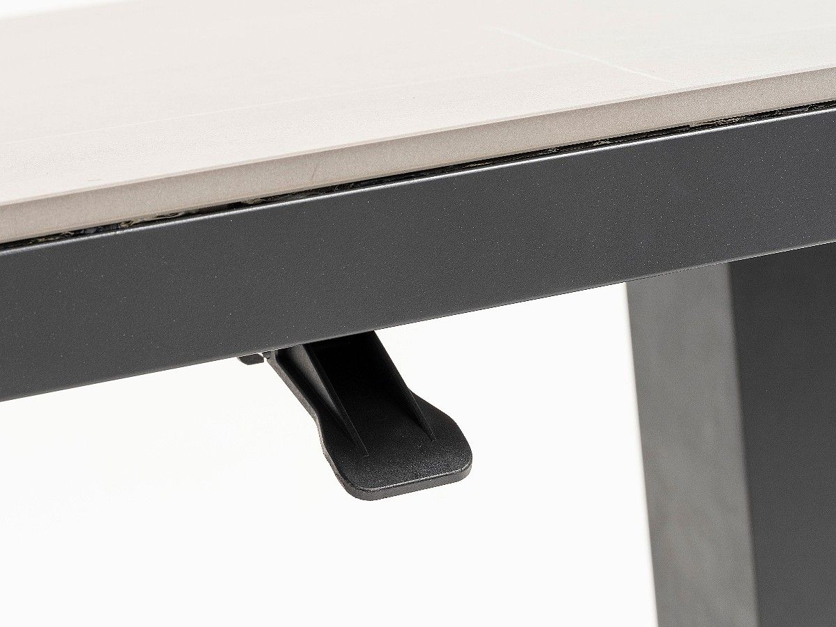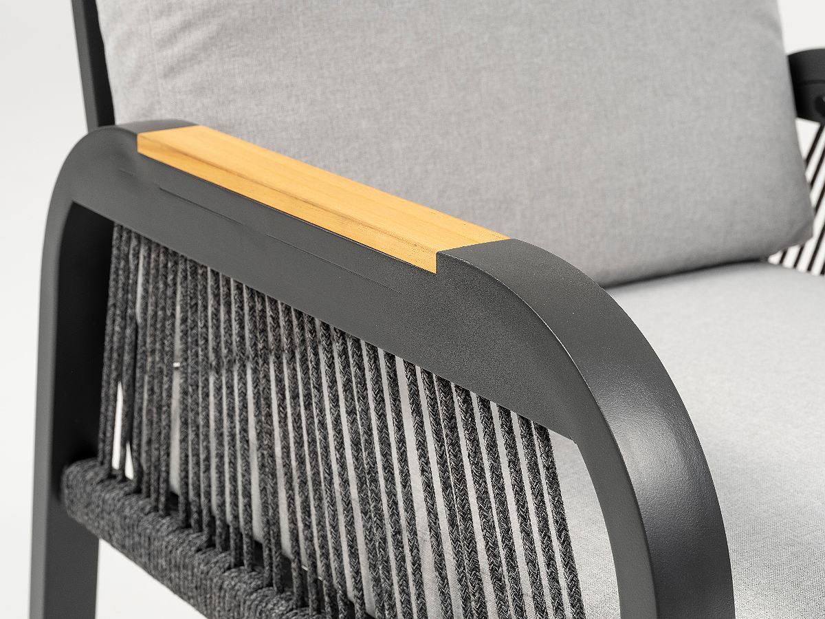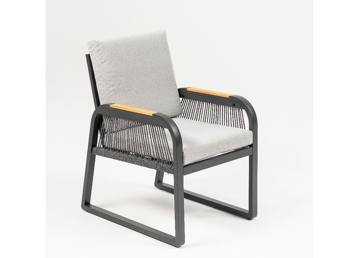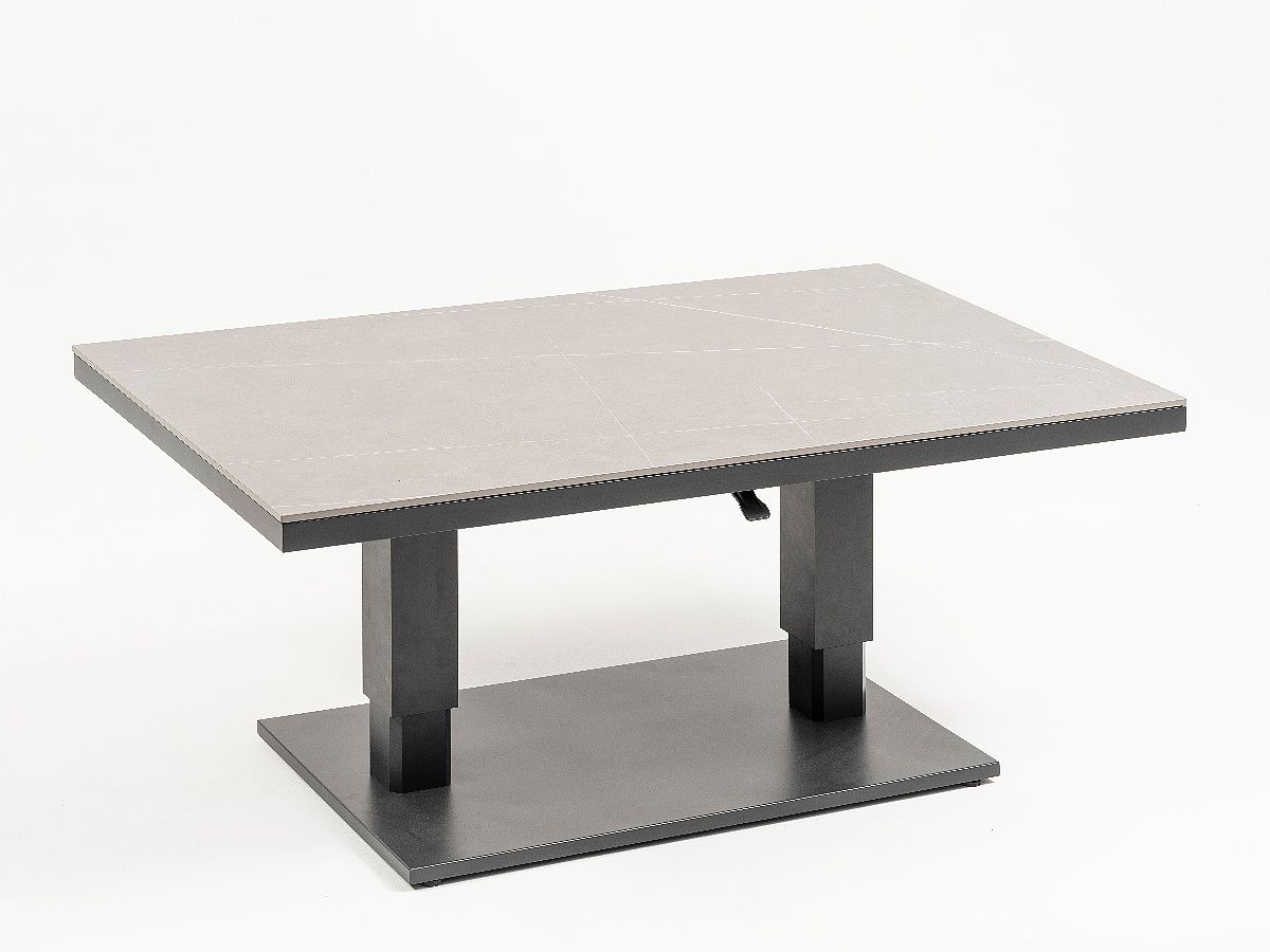 Súprava Limnos je stelesnením nadčasovej elegancie, ktorá v sebe spája industriálny štýl s maximálnym užívateľským komfortom. Vďaka antracitovému hliníkovému rámu a detailom v podobe moderného šnúrového výpletu (Rope-Optik) pôsobí súprava v priestore veľmi čisto a sofistikovane. Srdcom súpravy je stôl s vysoko odolnou doskou zo Sinterstone, ktorý v kombinácii s funkciou výškového nastavenia umožňuje plynulý prechod od relaxačného „lounge“ posedenia až po plnohodnotné stolovanie. Je to ideálne riešenie pre náročných klientov, ktorí hľadajú trvácnosť a estetický dizajn na svoje terasy či strešné záhrady.