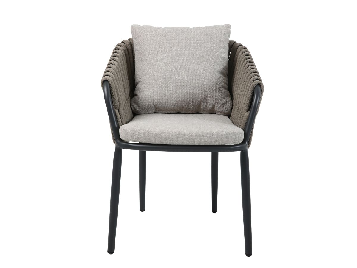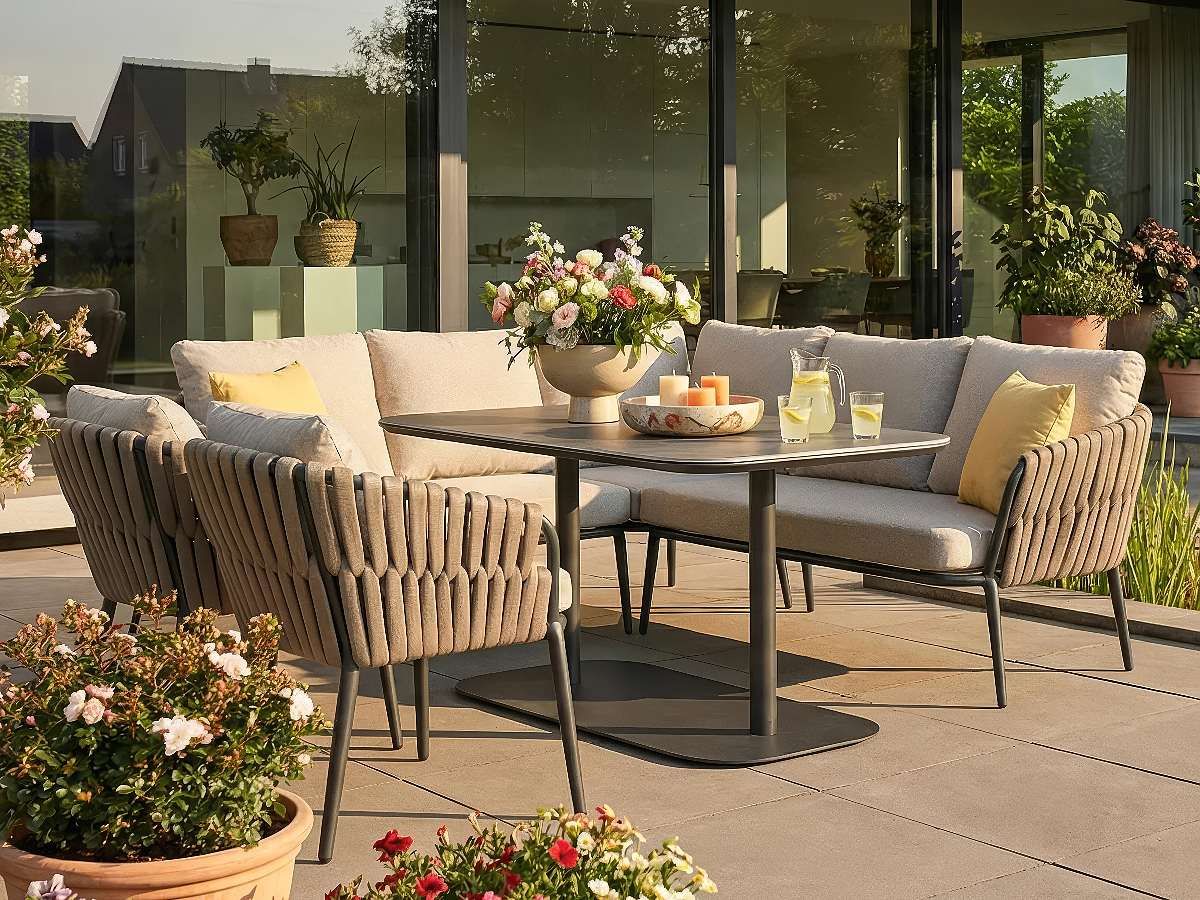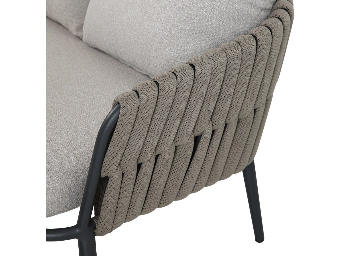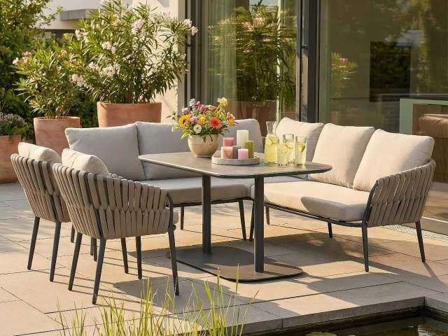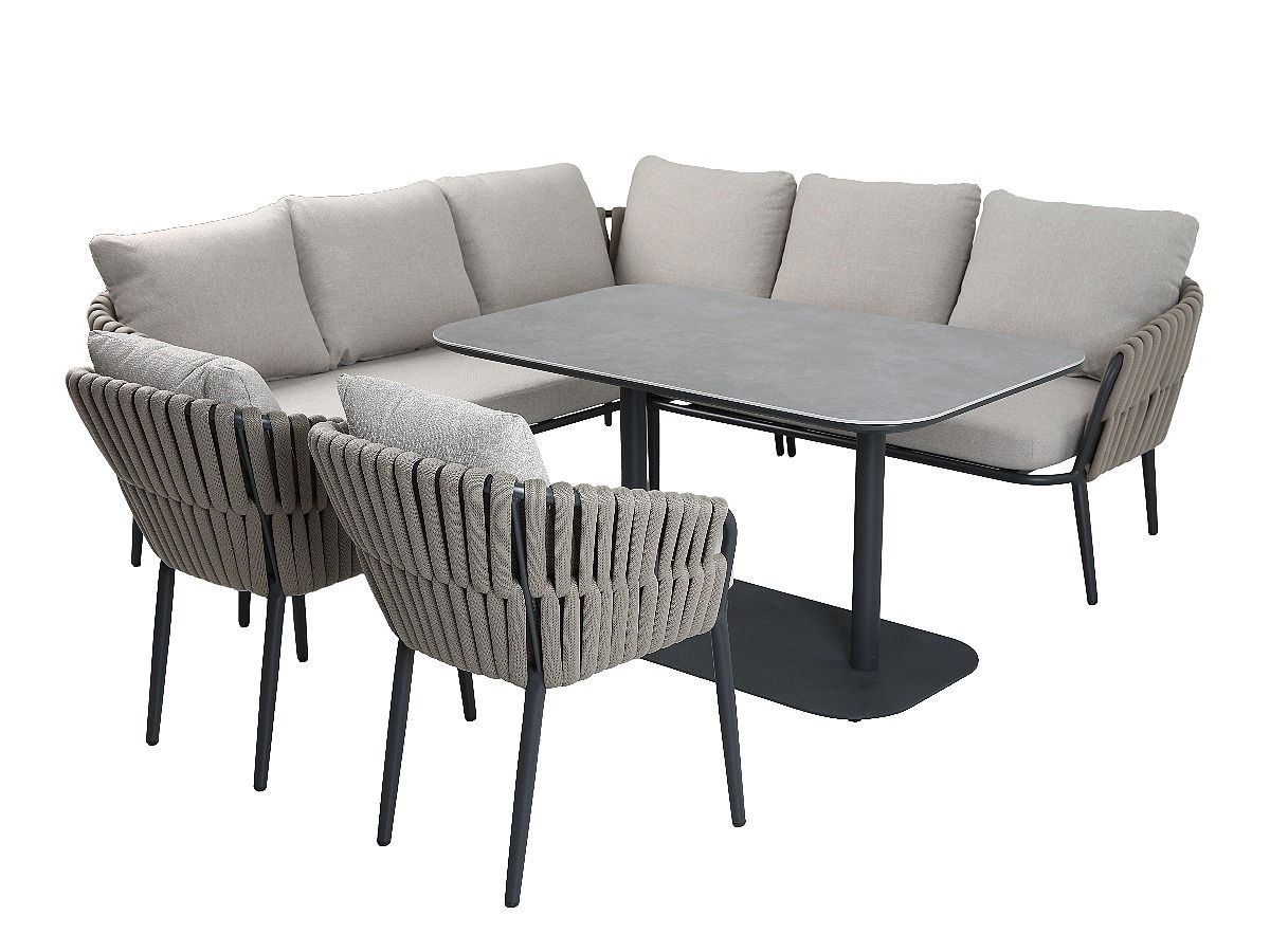 Rohová stolová súprava Nizza je majstrovským dielom modernej záhradnej architektúry, ktorá spája útulnosť domova s odolnosťou profesionálneho exteriérového nábytku. Jej charakteristickým prvkom je kontrast medzi robustnou antracitovou konštrukciou a jemným výpletom z hrubých textilných šnúr v odtieni taupe. Súprava je navrhnutá pre spoločenské stolovanie – rohová lavica a dve kreslá tvoria kompaktný, vysoko komunikatívny celok, ktorý vynikne rovnako dobre na rodinnej terase, ako aj v štýlovej hotelovej či gastronomickej zóne.