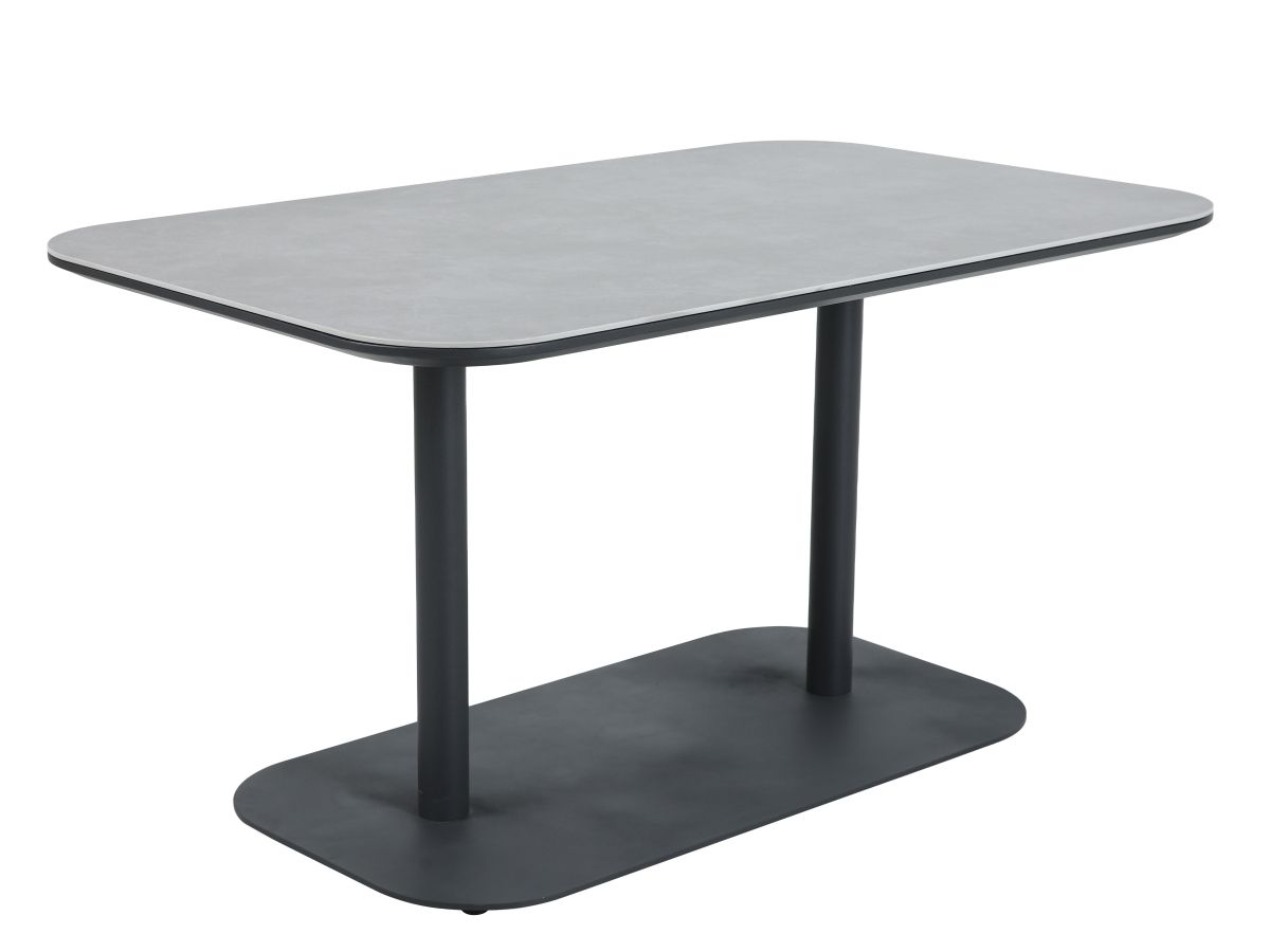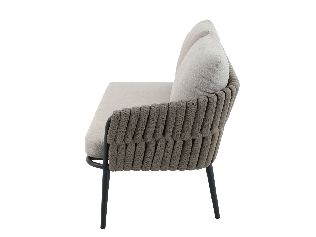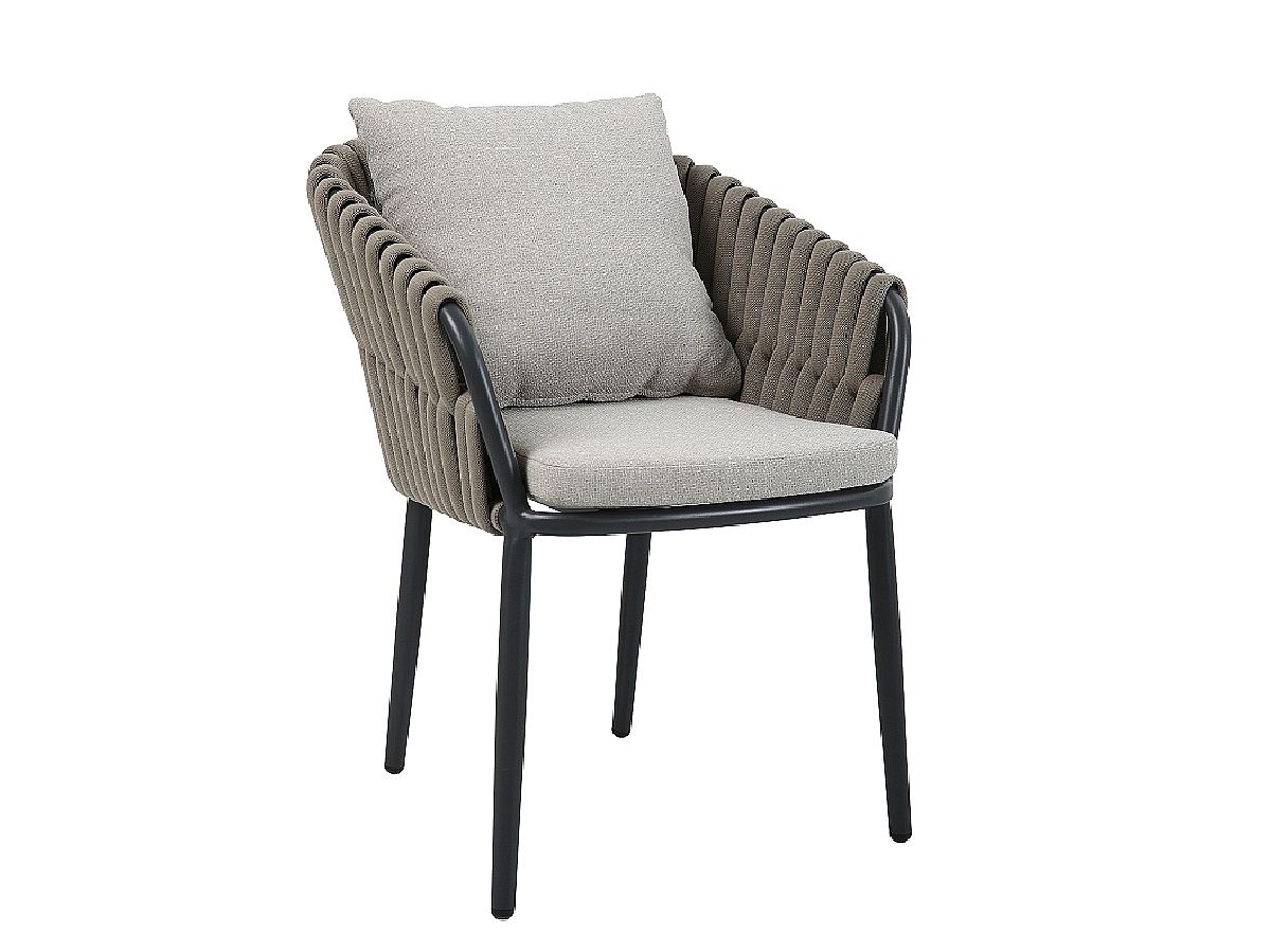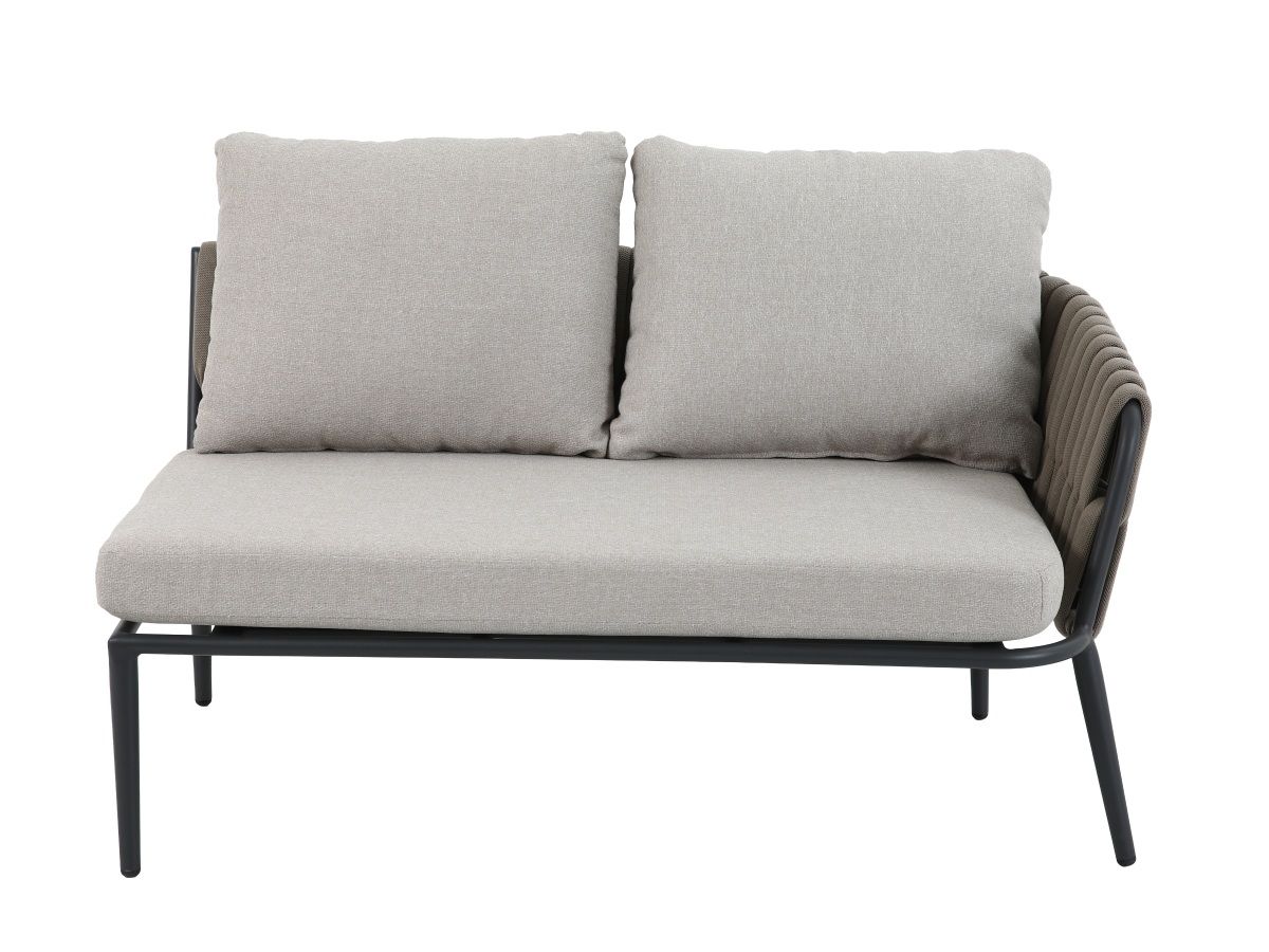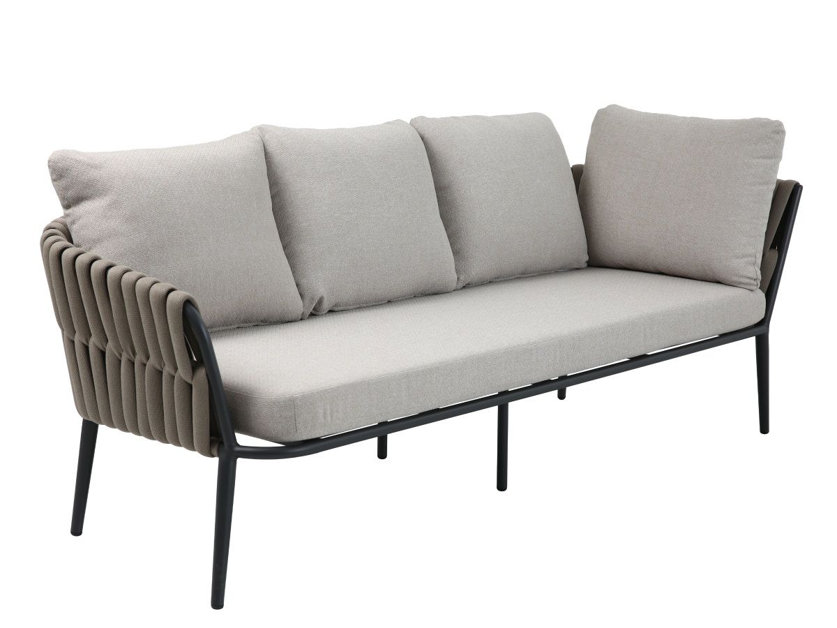 Rohová stolová súprava Nizza je majstrovským dielom modernej záhradnej architektúry, ktorá spája útulnosť domova s odolnosťou profesionálneho exteriérového nábytku. Jej charakteristickým prvkom je kontrast medzi robustnou antracitovou konštrukciou a jemným výpletom z hrubých textilných šnúr v odtieni taupe. Súprava je navrhnutá pre spoločenské stolovanie – rohová lavica a dve kreslá tvoria kompaktný, vysoko komunikatívny celok, ktorý vynikne rovnako dobre na rodinnej terase, ako aj v štýlovej hotelovej či gastronomickej zóne.