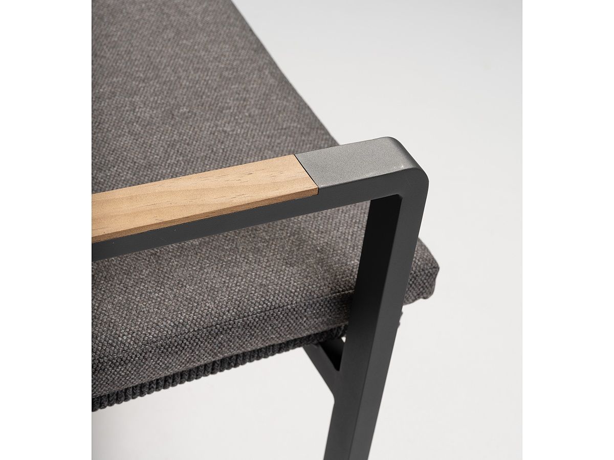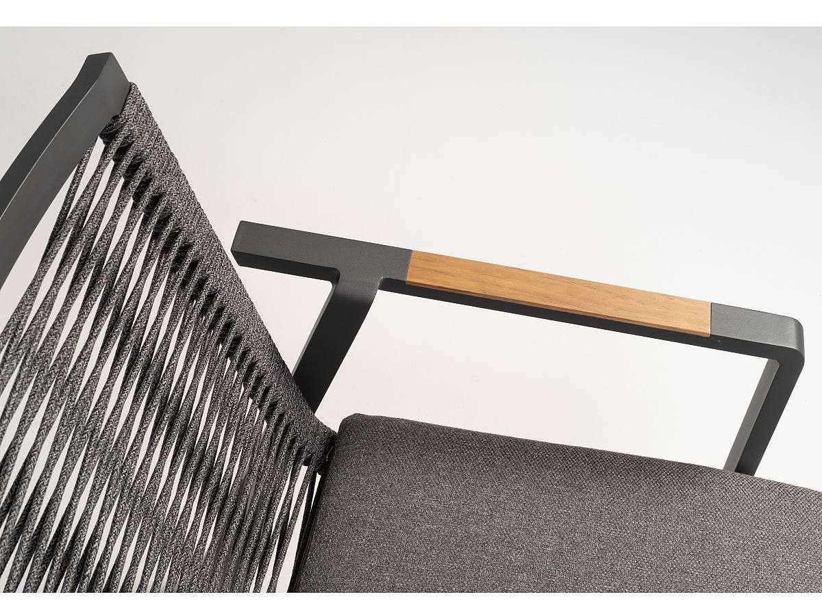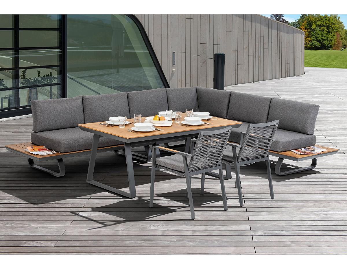 Elegantná moderná rohová stolová súprava Woody Corner je hybridom medzi sedacou a stolovou súpravou. Je ideálnou voľbou ak chcete spojit pohodlie sedacej súpravy a praktickosť stolovej súpravy. Stoličky, rohová sedačka aj stôl majú hliníkovú konštrukciu striekanú antracitovou práškovou farbou. Stoličky sú ručne ovinuté rýchloschnúcimi textilnými šnúrami v sivej farbe. Stôl má stolovú dosku z naolejovaného borovicového dreva. Podsedáky aj vankúše sú z kvalitnej textilnej tkaniny v tmavosivej farbe odolné voči poveternostným vplyvom.