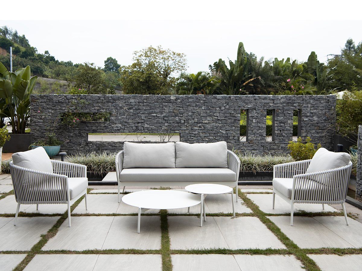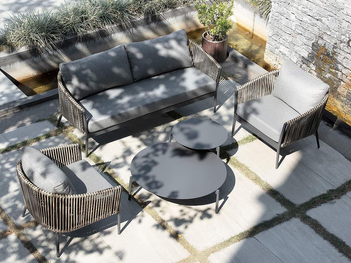 Krásna a originálna záhradná sedacia súprava Bahamas Vás zaujme na prvý pohľad svojim moderným dizajnom. Konštrukcia sedacej súpravy je z hliníku a je striekaná práškovou farbou. Výplet je z plochého syntetického ratanu. Podsedáky a opierkové vankúše sú impregnované a vhodné na používanie v exteriéry, niesú ale vodeodolné a tak ich musíte pred dažďom schovávať alebo sedaciu súpravu prikryť ochrannou plachtou. Doplnkom sedacej súpravy sú dva hliníkové konferenčné stolíky v dvoch veľkostiach.