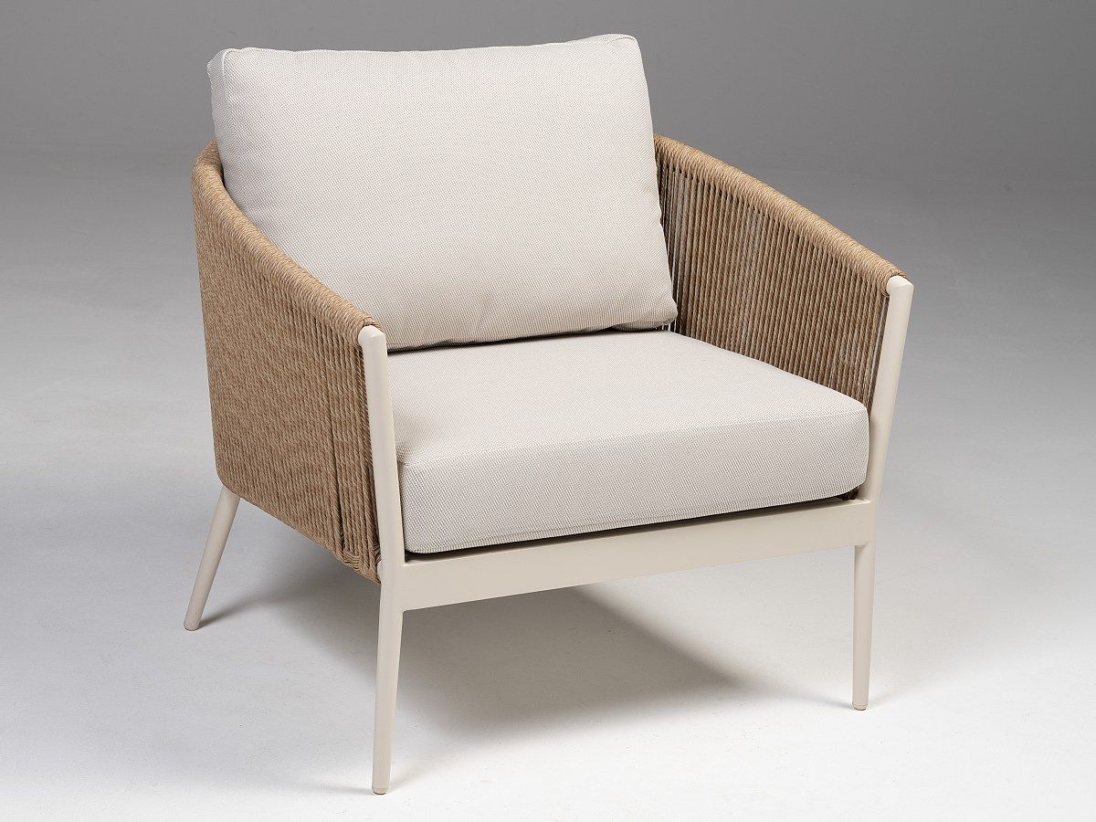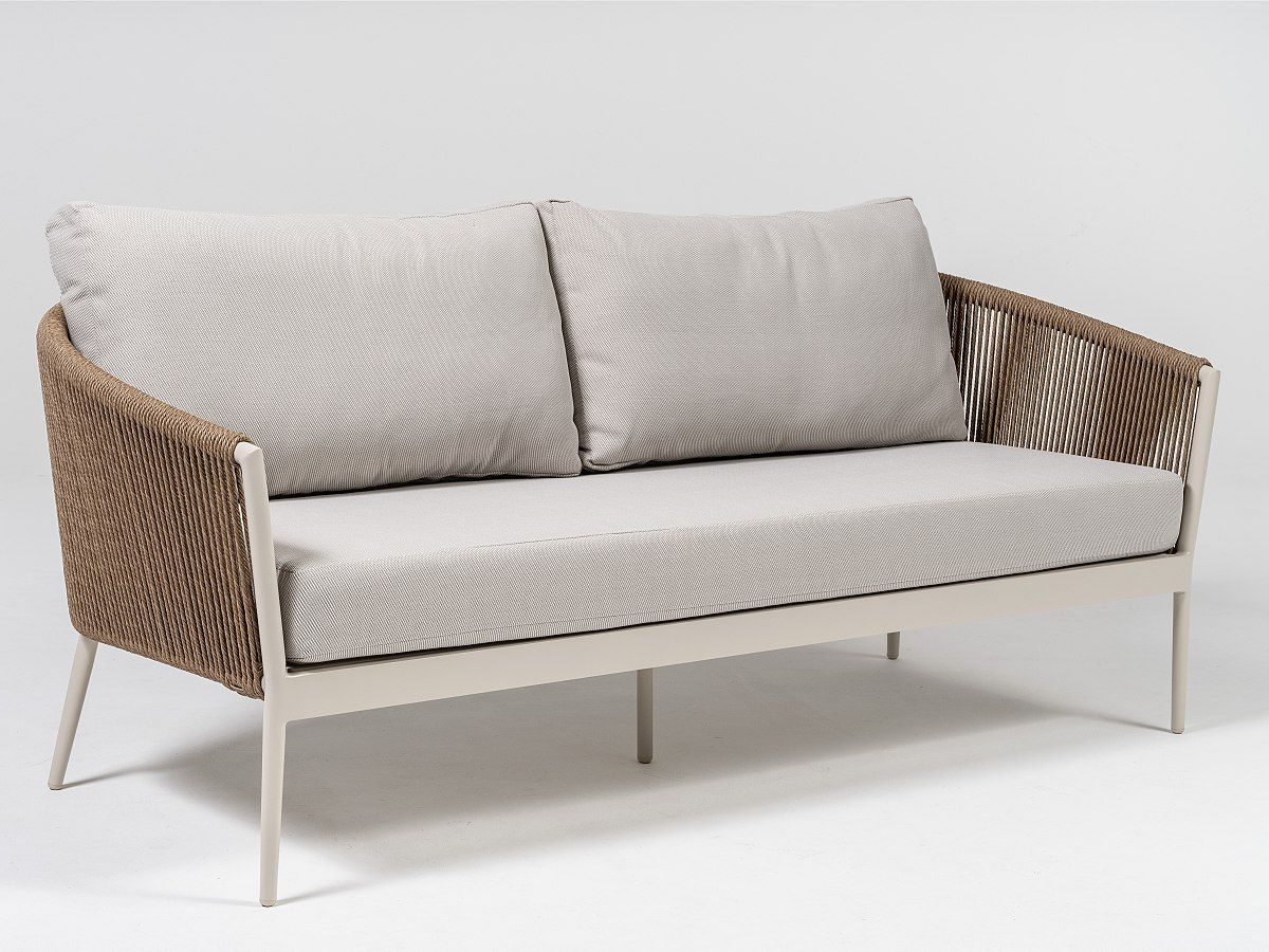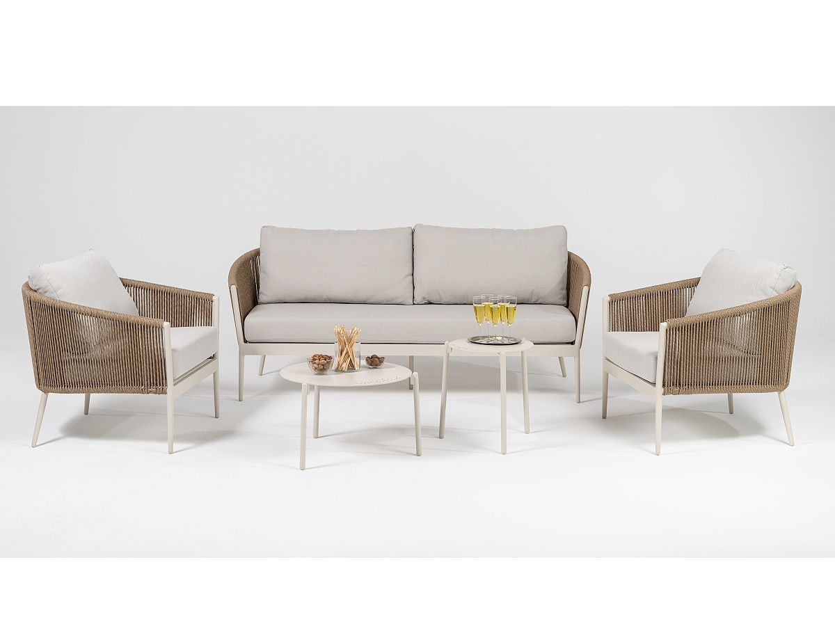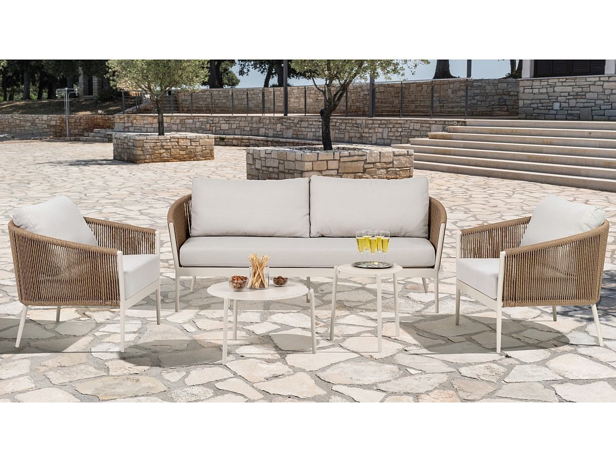 Úžasne pohodlná a dizajnová záhradná sedacia súprava Coco Lounge je ideálnym spoločníkom na dlhé letné posedenia. Konštrukcia sedacej súpravy je hliníková a je striekaná práškovou farbou vo farbe IVORY. Operadlá na kreslách a trojsedačke sú ovinuté tkaným syntetickým lanom v naturálnom melírovanom vzhlade, ktorý dodáva celému dizajnu nádych modernizmu. Podsedáky a opierkové vankúše sú svetlošedej farby a sú odolné voči poveternostným vplyvom. Konferenčné stolíky majú konštrukciu z hliníku v rovnakej farbe a prevedení ako pri kreslách a trojsedačke. V rovnakom dizajne máme aj sedaciu súpravu Como a stoličky Como a Coconut ak by ste chceli zladiť sedaciu a stolovú súpravu.