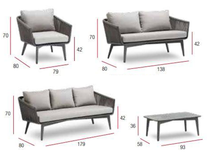Elegantná a moderná záhradná sedacia súprava Diva XL je na prvý pohľad zaujímavým typom exteriérového nábytku. Konštrukcia sedacej súpravy je hliníková a je striekaná práškovou farbou. Výpletom je mäkké lano a dodáva celému dizajnu moderný vzhľad. Vankúše sú z polyesterovej tkaniny, sú vodeodpudivé a majú snímateľné poťahy. Konferenčný stolík má HPL kompaktnú stolovú dosku s hrúbkou 12 mm a konštrukciu z hliníku. Jednotlivé moduly a ich rozmery môžete vidieť v priloženom obrázku.