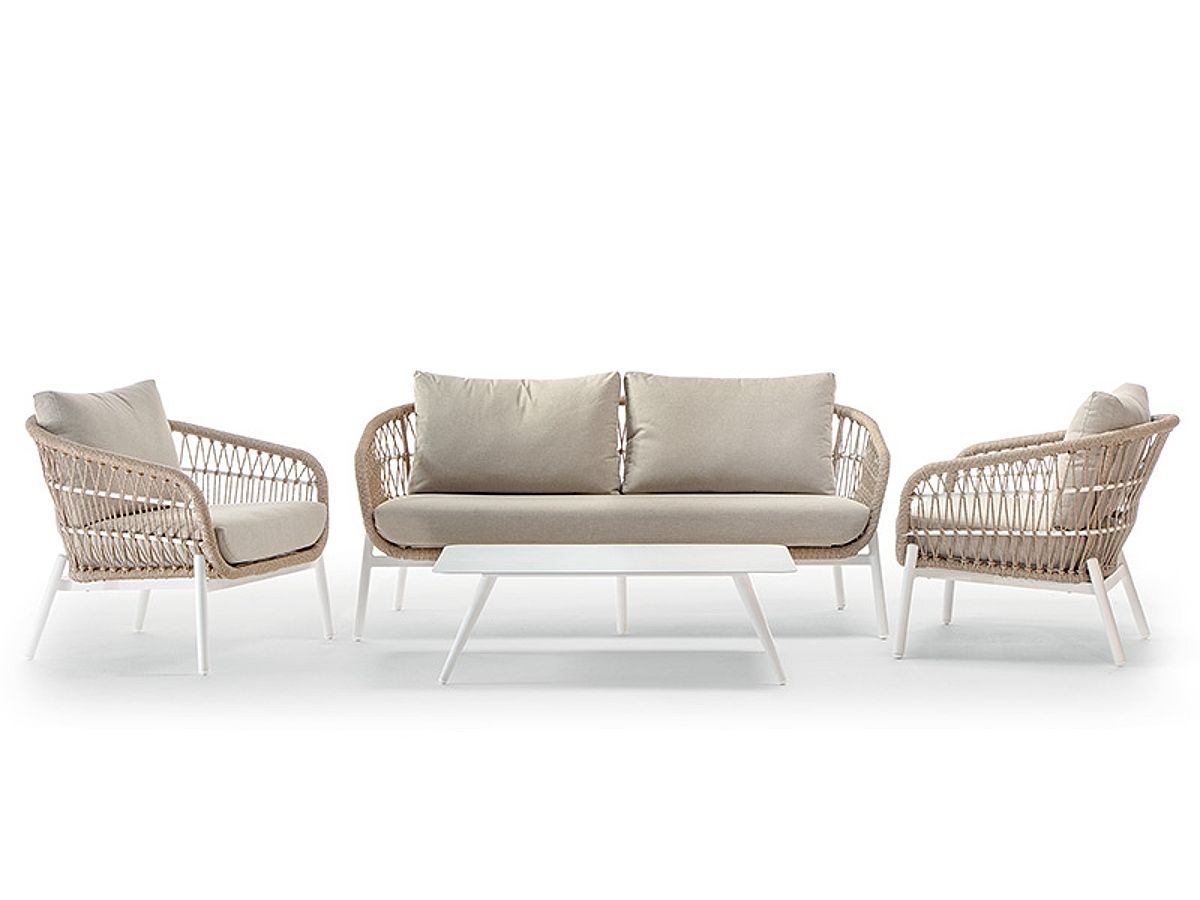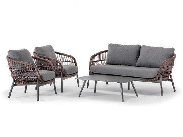 Nadčasová a originálna záhradná sedacia súprava Elba Natur Vás zaujme na prvý pohľad svojim moderným dizajnom a klasickými farbami. Konštrukcia sedacej súpravy je z hliníku a je striekaná práškovou farbou v bielej alebo antracitovej farbe. Výplet sedacej súpravy je ovinutý Wintech syntetickým lanom. Podsedáky a opierkové vankúše sú v Champagne farbe pri bielej konštrukcii a Dark Grey pri Antracitovej konštrukcii. Matrace a vankúše sú z materiálu Olefin s rýchloschnúcou penou Quick Dry Foam, ktorý je vhodný do exteriéru. Sedaciu súpravu Elba Natur nádherne doplňuje konferečný stolík.