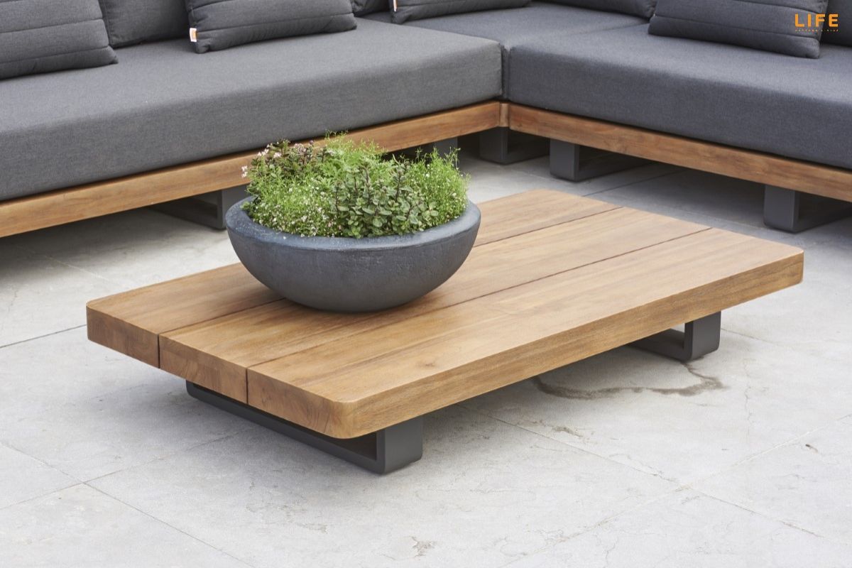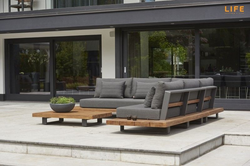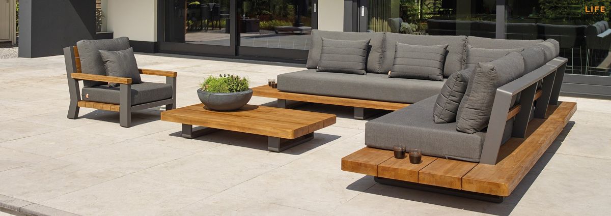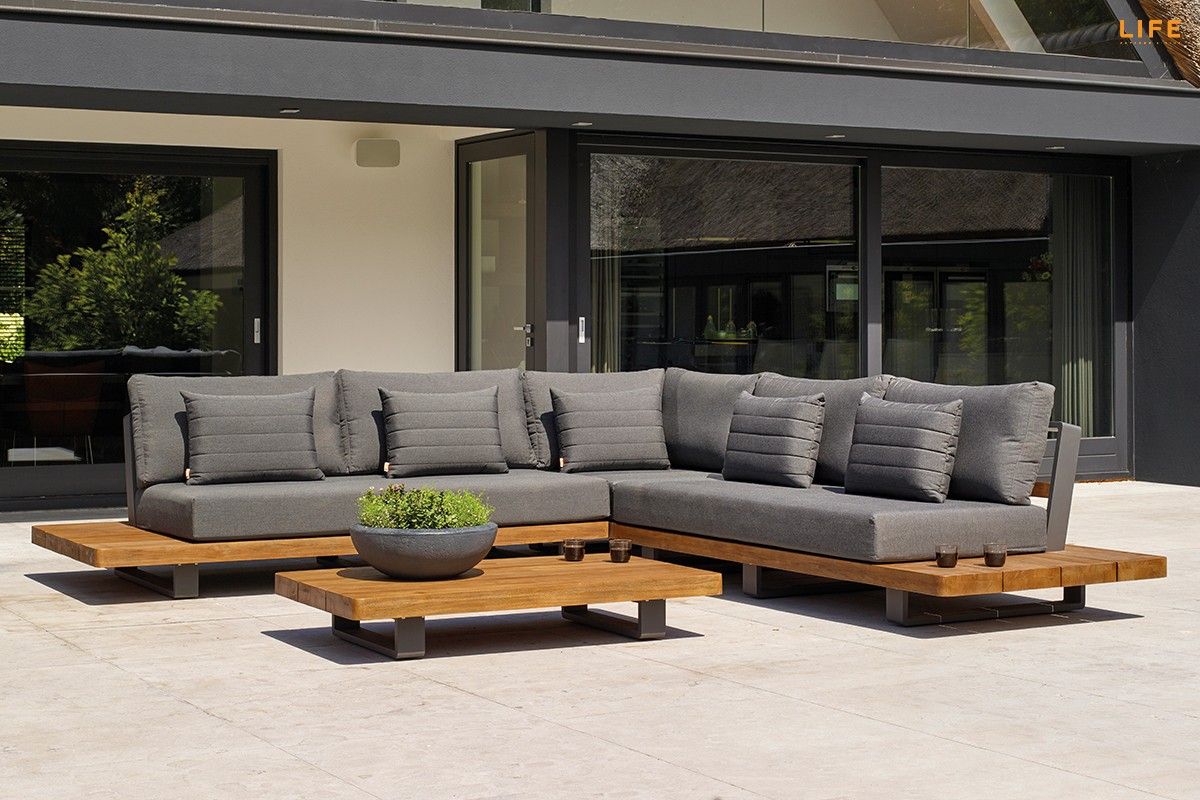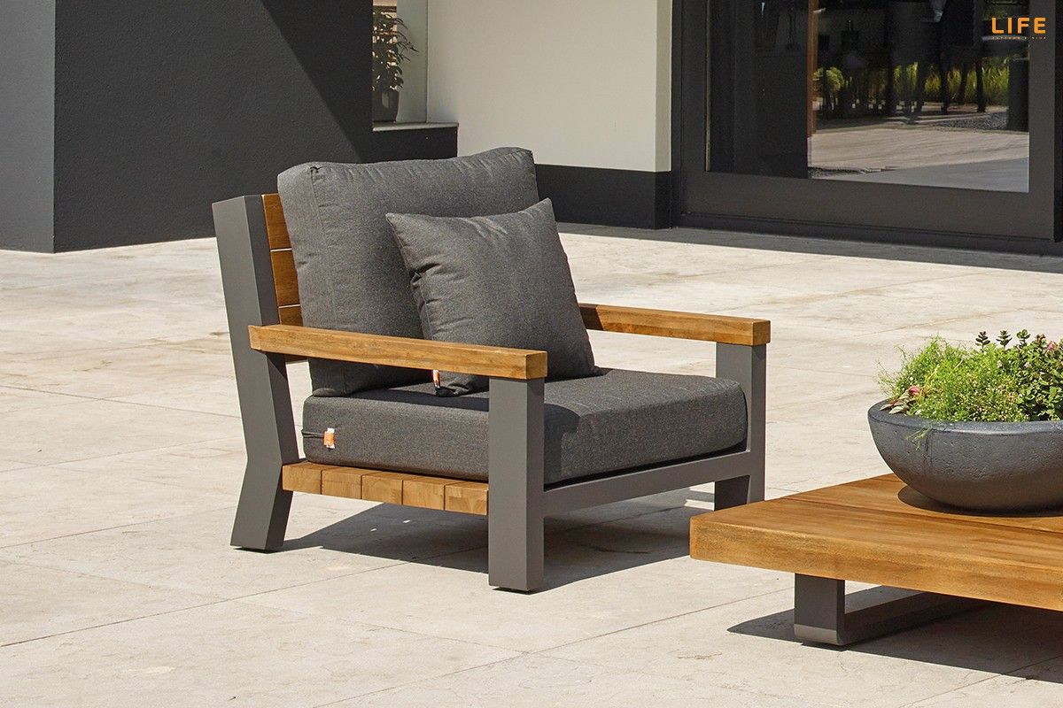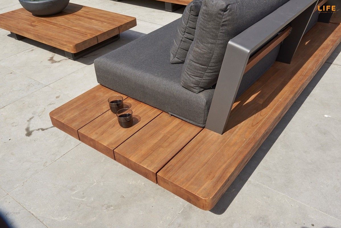 Dokonalá kombinácia teakového dreva a hliníkovej konštrukcie, luxusných podsedákov a vankúšov dodáva tejto záhradnej sedacej súprave punc nevšednosti. Farebná kombinácia sa hodí na terasy, kde podlaha je v jemnejších bledších farbách, kde bude v ideálnom kontraste a zvýrazní tak svoju eleganciu. Vďaka použitým materiálom sa nemusíte obávať nechať sedaciu súpravu po celý rok vonku. Vankúše sú vhodné do akéhokoľvek počasia vďaka All Weather Cushions. Teakové drevo je najvyššej kvality z indonézskych certifikovaných plantáží. Pristorovú dispozíciu môžete vidieť na priloženom obrázku.