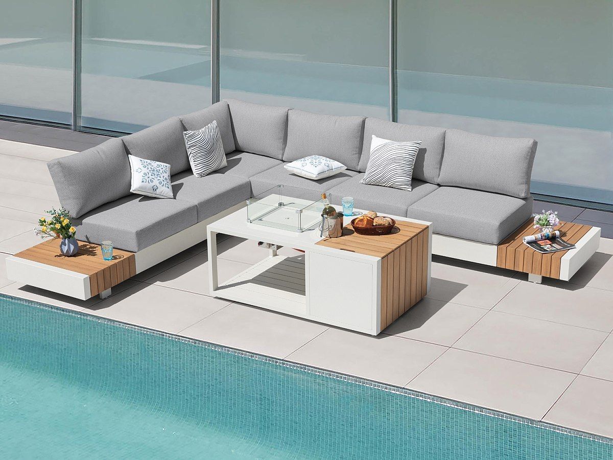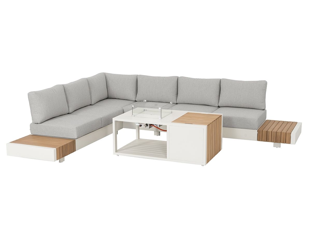 Elegantná a moderná sedacia súprava Gin bude hviezdou každej terasy. Konštrukcia sedacej súpravy je hliníková v krémovej farbe a elegantne ju na krajoch dopĺňa latovanie z termodreva. Pohodlné vankúše a sedáky svetlošedej farbe iba pozdvihujú celkový dizajne tejto sedacej súpravy. Sedačku je možné nastaviť na ľavé ale aj pravé prevedenie vďaka stredovému elementu. Zaujímavosťou je ohnivý stôl, ktorý má prípojku na plynovú bombu a môžete si tak vychutnávať letné posedenia s priateľmi v prítomnosti plápolajúceho ohňa.