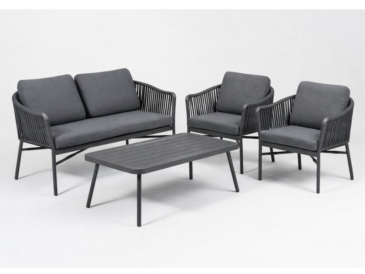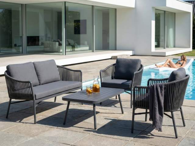 Súprava Jacky Grau v sebe spája moderný, odľahčený dizajn s hrejivým farebným kontrastom. Vďaka kombinácii antracitovej konštrukcie a tmavosivého výpletu pôsobí v priestore sviežo a štýlovo. Tento set je ideálnou voľbou pre tých, ktorí hľadajú moderné exteriérové sedenie, ktoré je nielen vizuálne atraktívne, ale aj vysoko funkčné a pohodlné pre každodenný relax na terase alebo pri bazéne. Sedacia súprava Jacky je dostupná aj antracitovom prevedení.