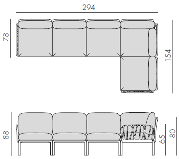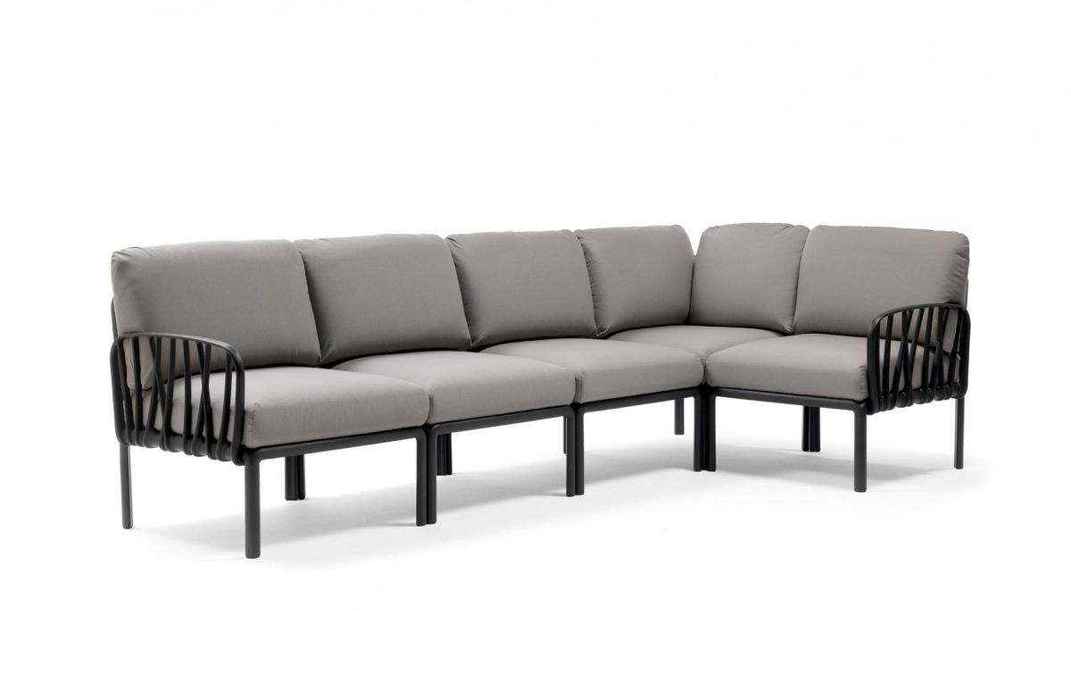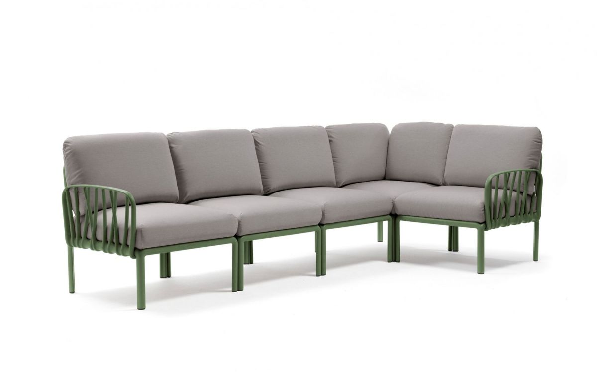 Sedacia súprava Komodo 5 je vďaka svojim farebným kombináciam a možnosti rozloženia modulov do akéhokoľvek tvaru vrcholom talianskeho dizajnu. Môžeme rôzne kombinovať farbu konštrukcie s farbami podsedáku. Konštrukcia sedacej súpravy je z tvrdeného plastu spevneného sklenným vláknom. Vankúše aj podsedáky sú kompletne snímatelné, daju sa prať na 30 °C. Podsedáky navyše maju špeciálne úchytky, vďaka ktorým ich prichytite ku konštrukcii a tak Vám podsedáky neuletia ani v najväčšom vetre. Velmi ľahká montáž aj demontáž.