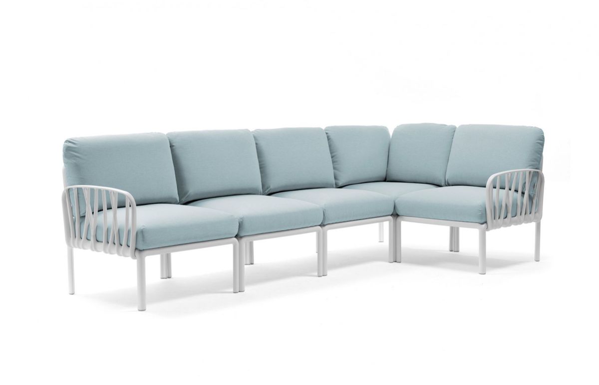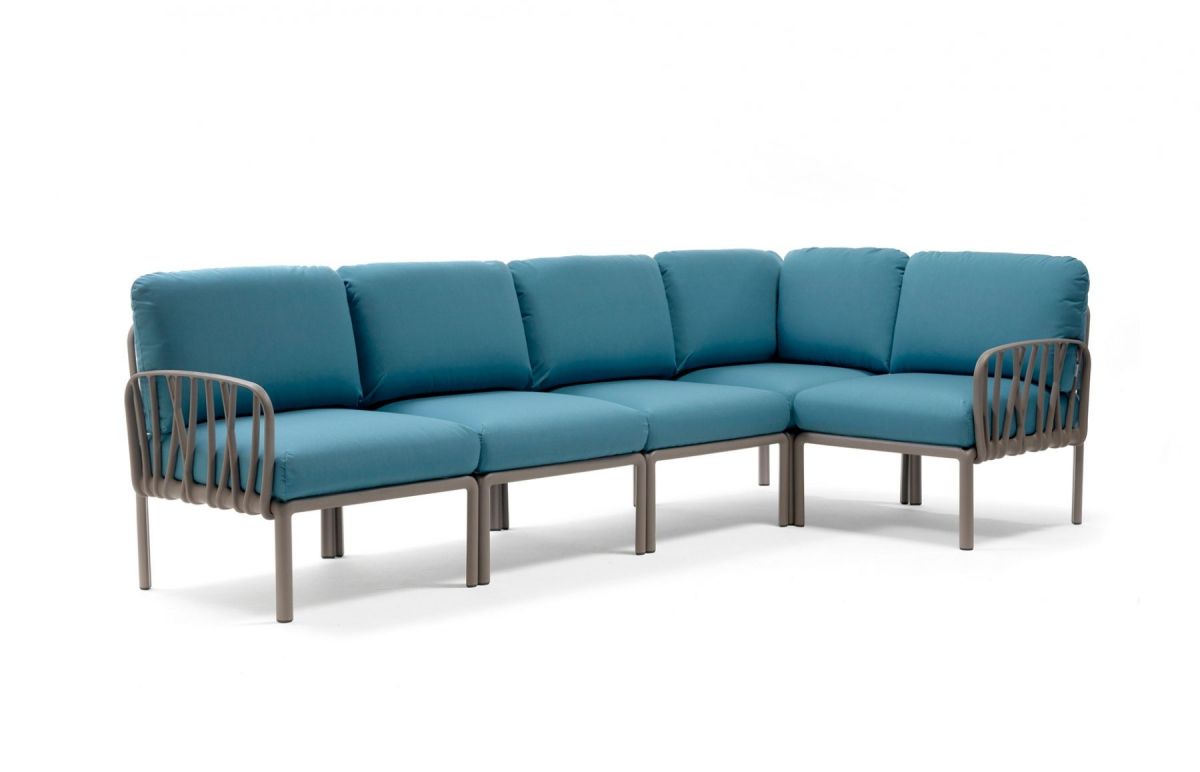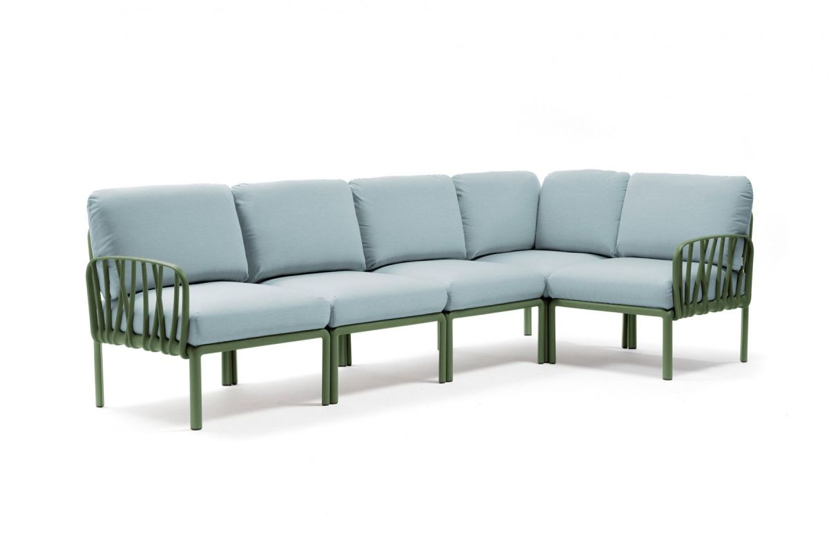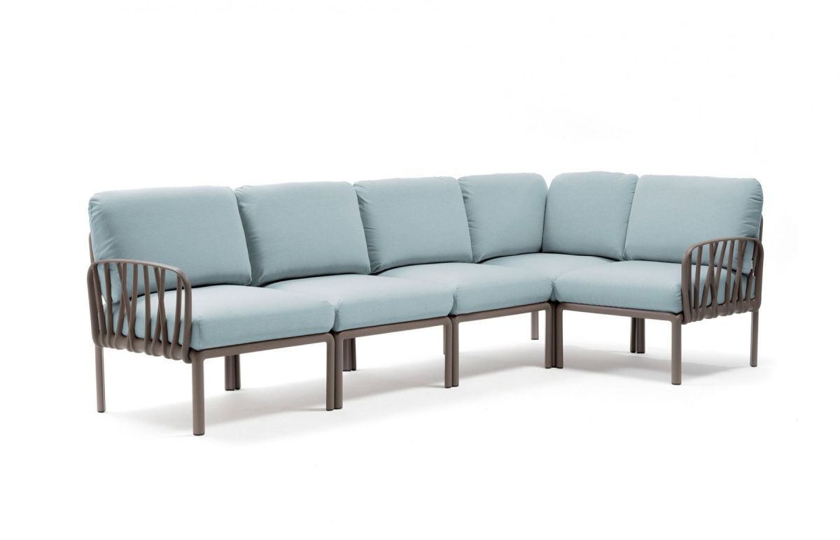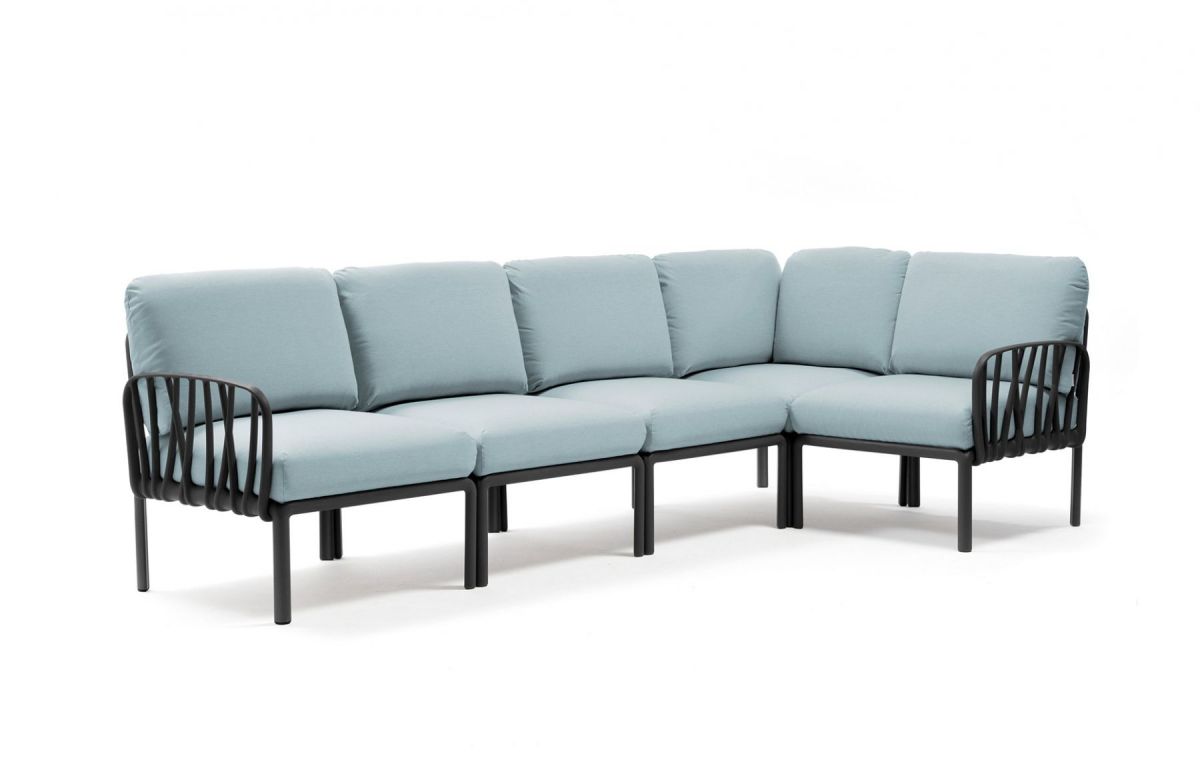 Sedacia súprava Komodo je vďaka svojim farebným kombináciam a možnosti rozloženia modulov do akéhokoľvek tvaru vrcholom talianskeho dizajnu. Môžeme rôzne kombinovať farbu konštrukcie s farbami podsedáku, ktoré vďaka látke Sunbrella môžete kludne nechat vonku počas celej letnej sezóny aj počas nepriaznivého počasia. Konštrukcia sedacej súpravy je z tvrdeného plastu spevneného sklenným vláknom. Vankúše aj podsedáky sú kompletne snímatelné, daju sa prať na 30 °C. Podsedáky navyše maju špeciálne úchytky, vďaka ktorým ich prichytite ku konštrukcii a tak Vám neuletia ani v najväčšom vetre. Veľmi ľahká montáž aj demontáž.
