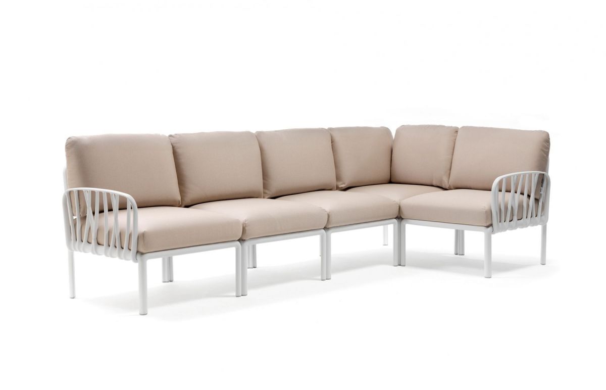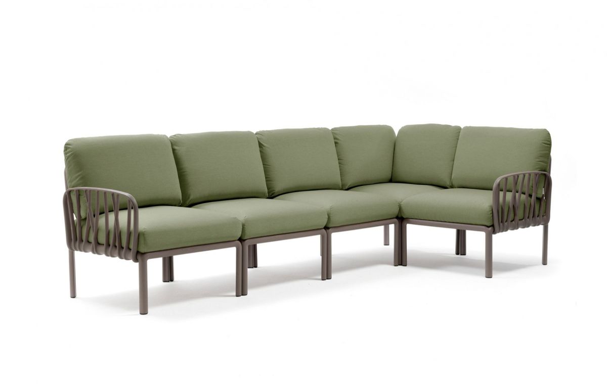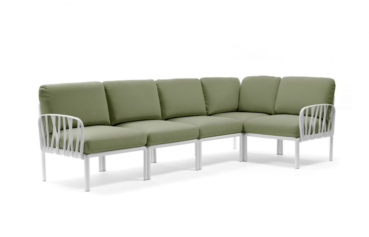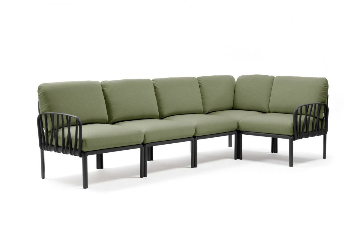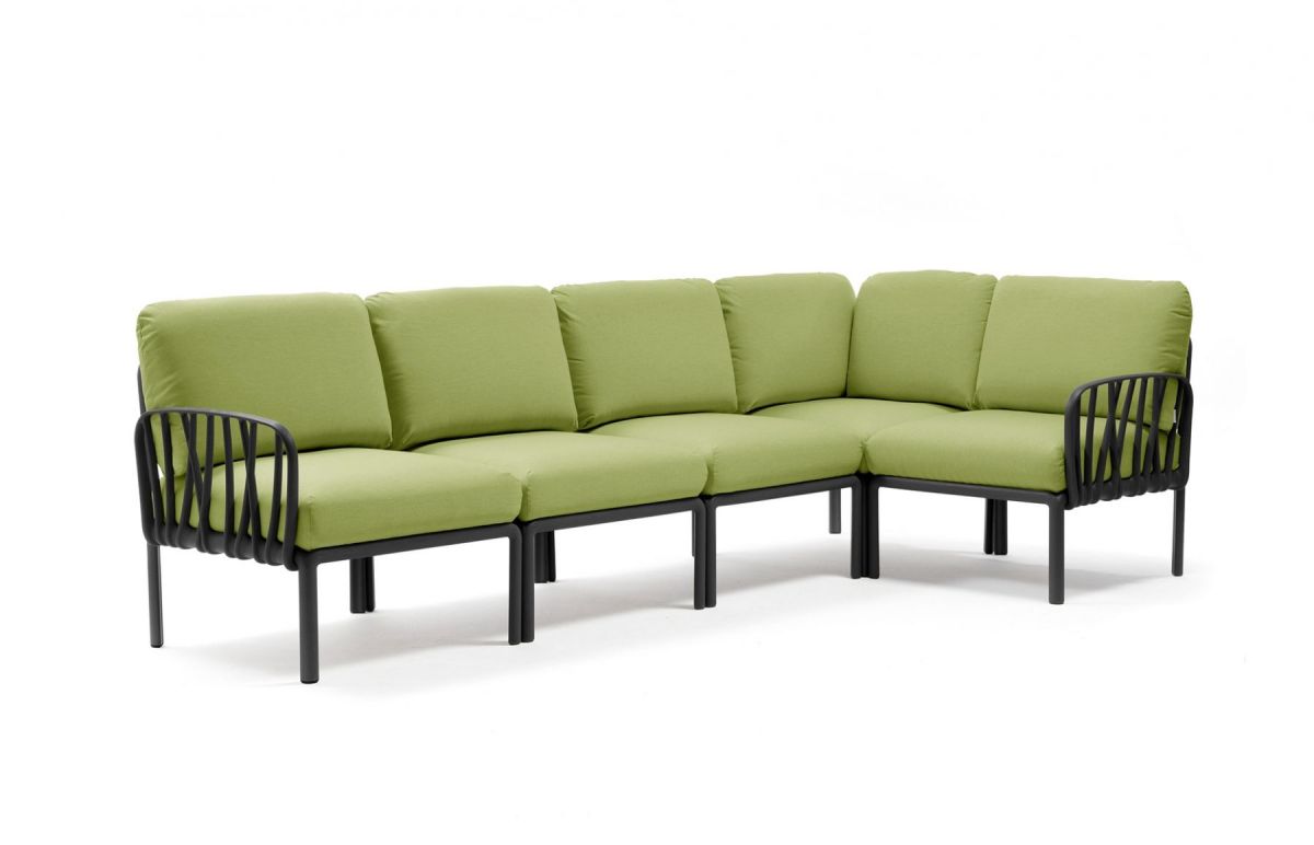 Sedacia súprava Komodo je vďaka svojim farebným kombináciam a možnosti rozloženia modulov do akéhokoľvek tvaru vrcholom talianskeho dizajnu. Môžeme rôzne kombinovať farbu konštrukcie s farbami podsedáku, ktoré vďaka látke Sunbrella môžete kludne nechat vonku počas celej letnej sezóny aj počas nepriaznivého počasia. Konštrukcia sedacej súpravy je z tvrdeného plastu spevneného sklenným vláknom. Vankúše aj podsedáky sú kompletne snímatelné, daju sa prať na 30 °C. Podsedáky navyše maju špeciálne úchytky, vďaka ktorým ich prichytite ku konštrukcii a tak Vám neuletia ani v najväčšom vetre. Veľmi ľahká montáž aj demontáž.