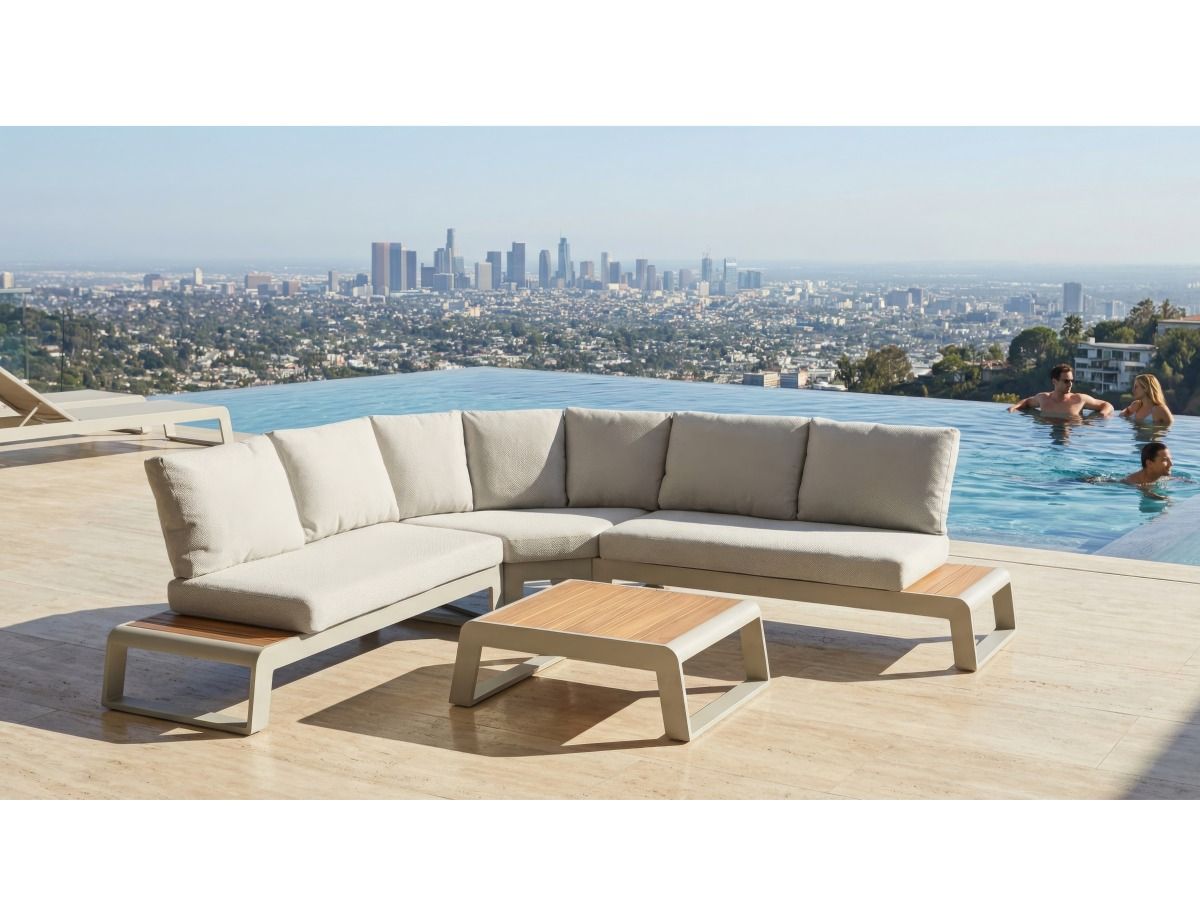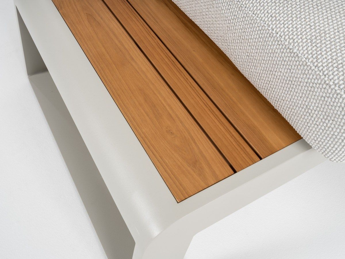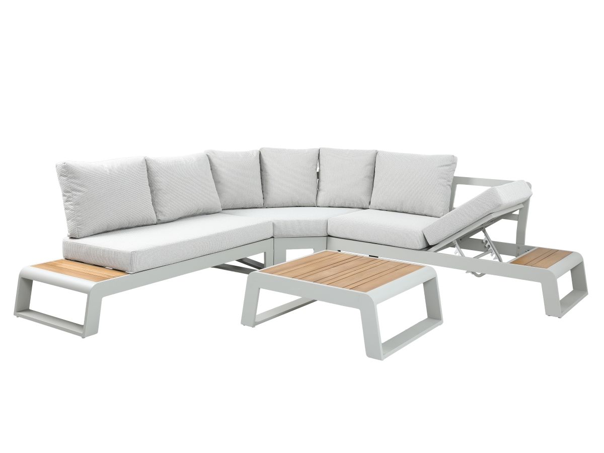 Rohová sedacia súprava Konstantino je navrhnutá pre maximálnu flexibilitu a čistý, moderný vzhľad. Jej minimalistický dizajn v kombinácii s jemnými odtieňmi "off-white" hliníka a hrejivým akcentom teakového dreva vytvára svetlú a vzdušnú atmosféru. Unikátnym prvkom tejto zostavy je integrovaná funkcia polohovania, ktorá premení klasické posedenie na dokonalú zónu pre relaxáciu a leňošenie.