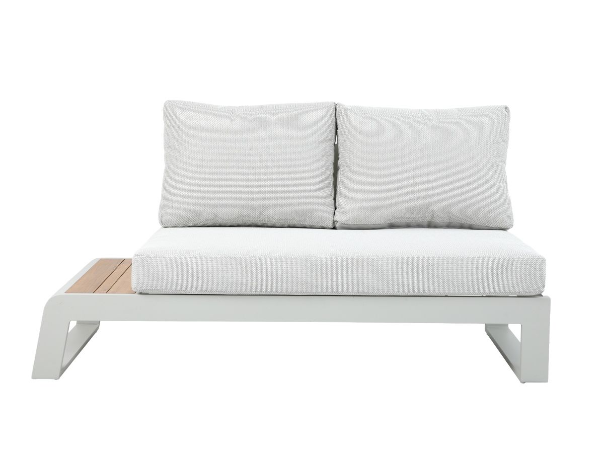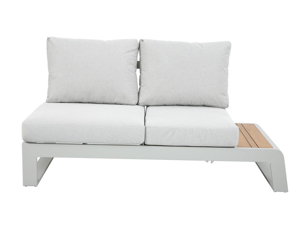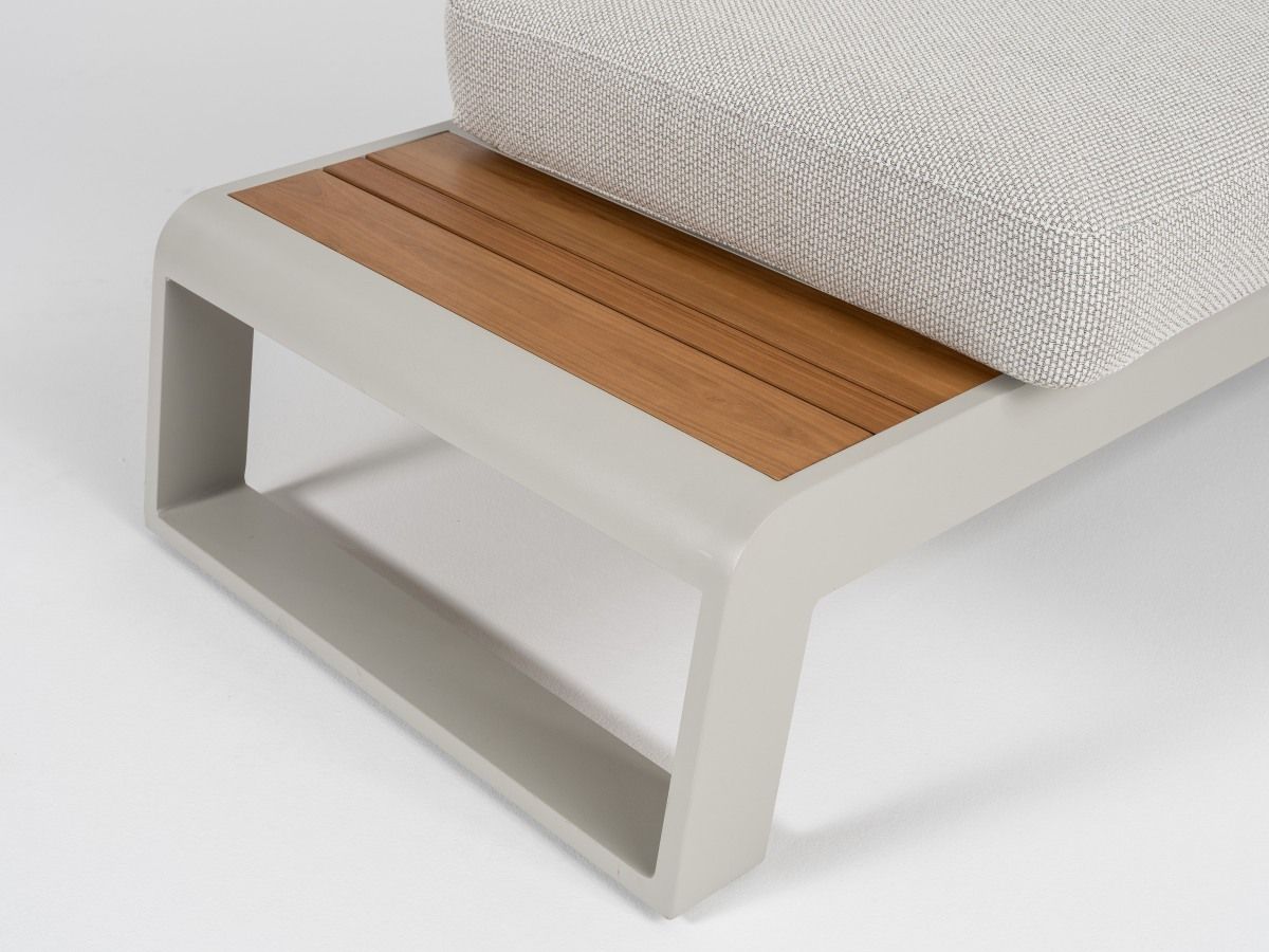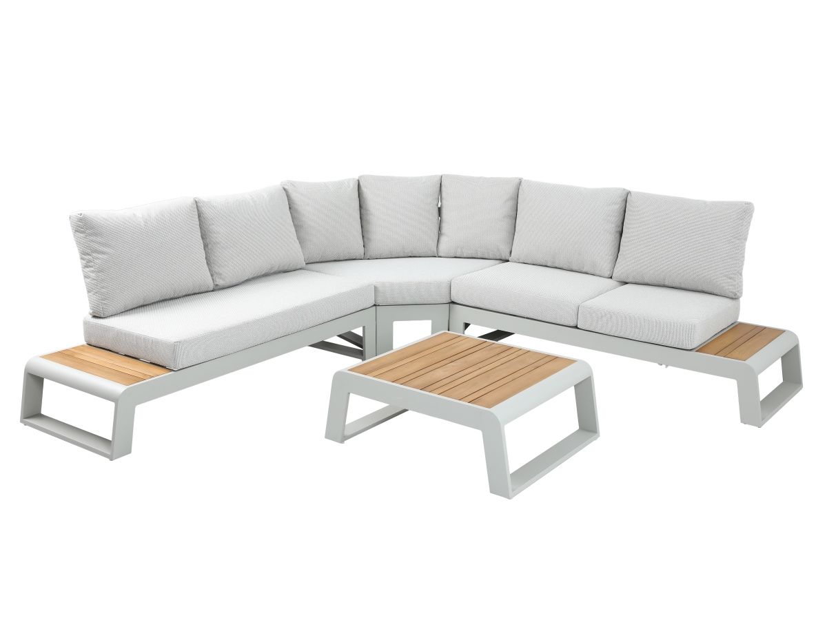 Rohová sedacia súprava Konstantino je navrhnutá pre maximálnu flexibilitu a čistý, moderný vzhľad. Jej minimalistický dizajn v kombinácii s jemnými odtieňmi "off-white" hliníka a hrejivým akcentom teakového dreva vytvára svetlú a vzdušnú atmosféru. Unikátnym prvkom tejto zostavy je integrovaná funkcia polohovania, ktorá premení klasické posedenie na dokonalú zónu pre relaxáciu a leňošenie.