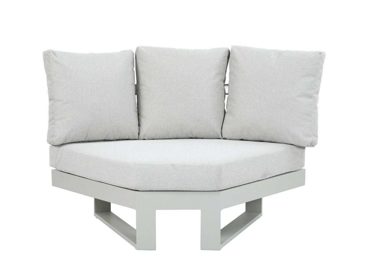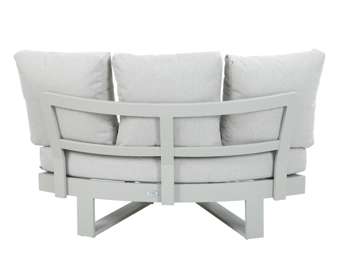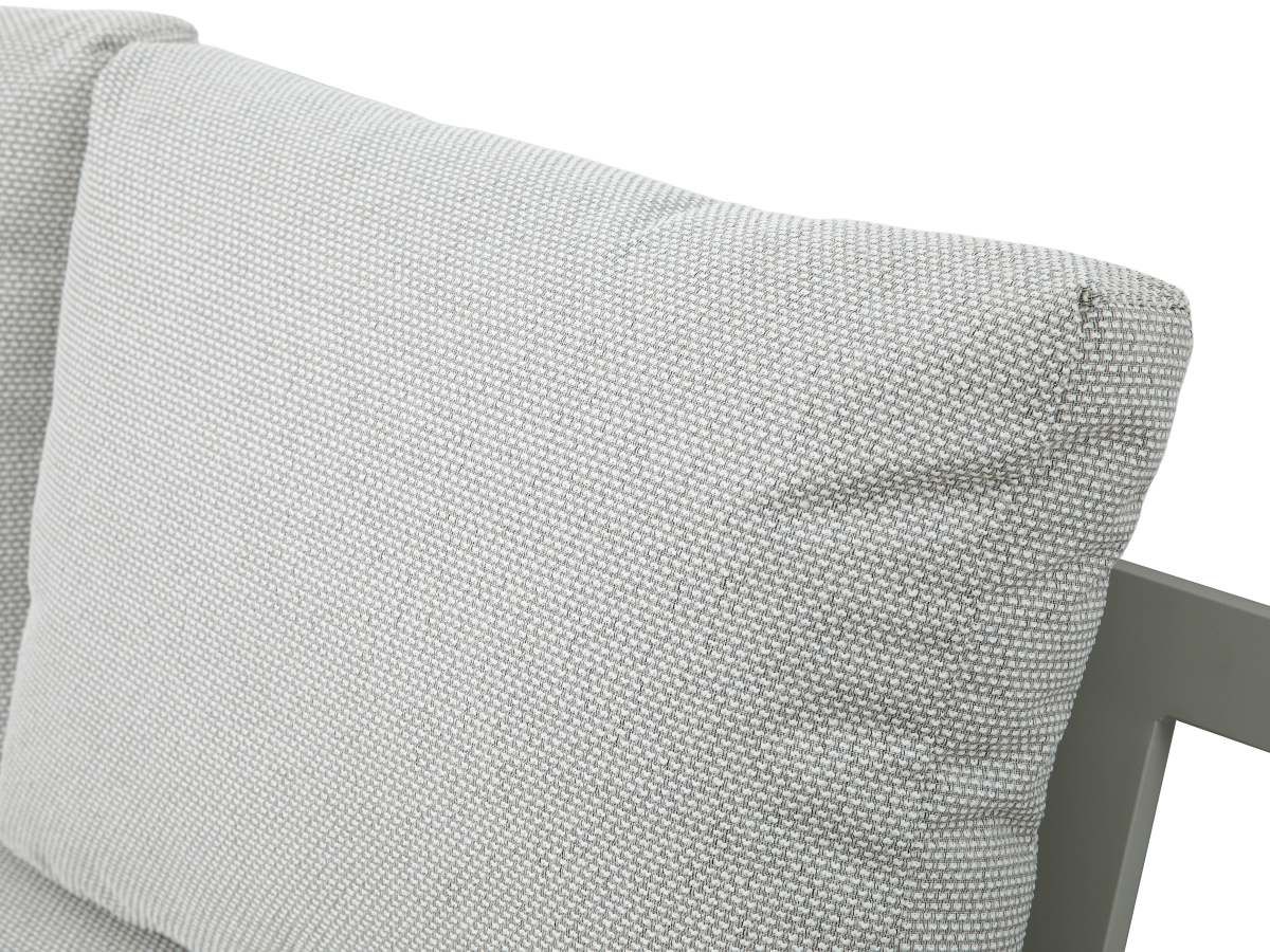 Čalúnenie: Pohodlné vankúše v svetlosivej farbe, ktoré sú vodoodpudivé a navrhnuté pre bezproblémové vonkajšie používanie.